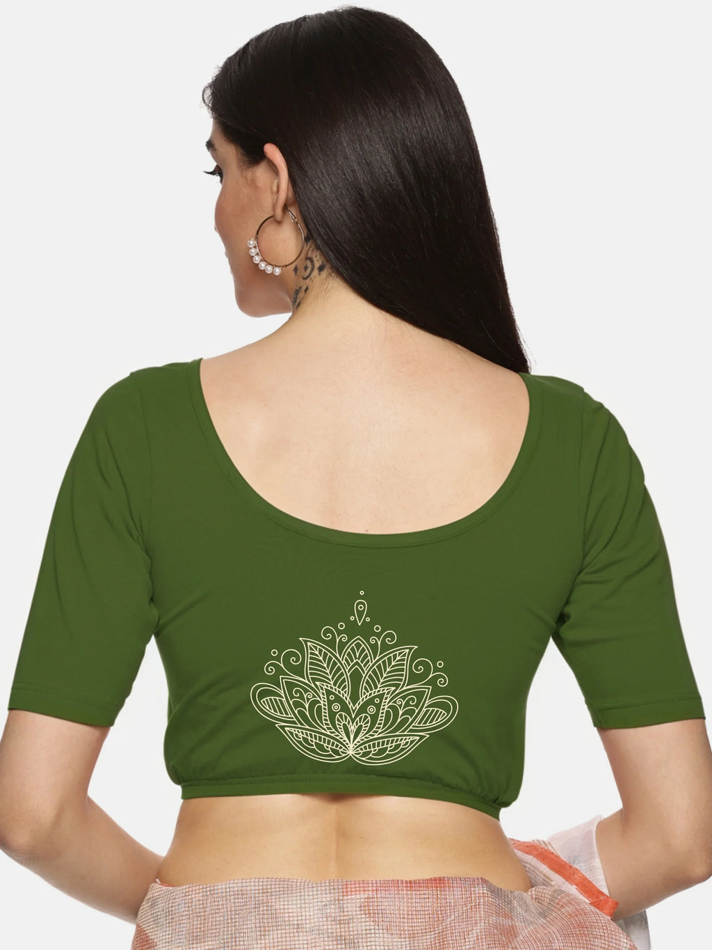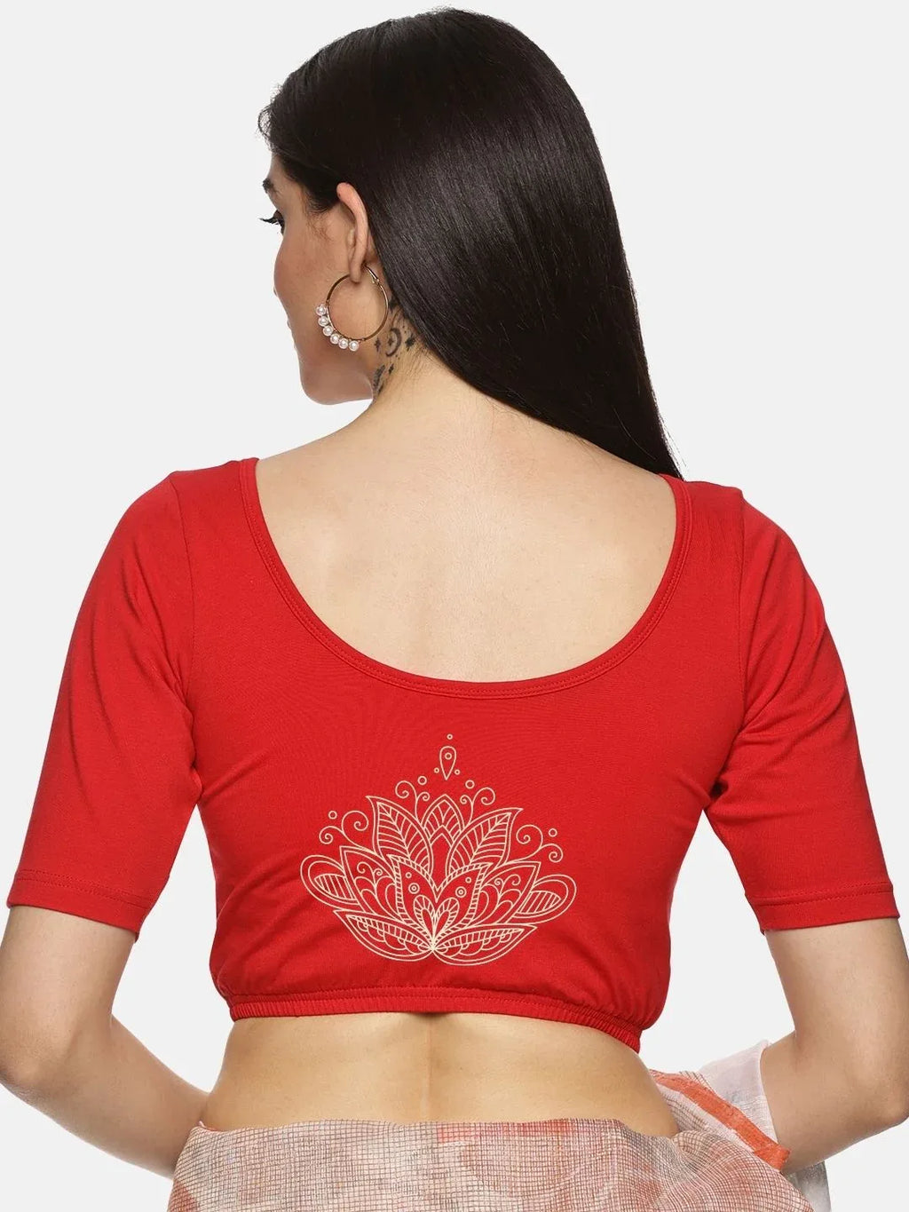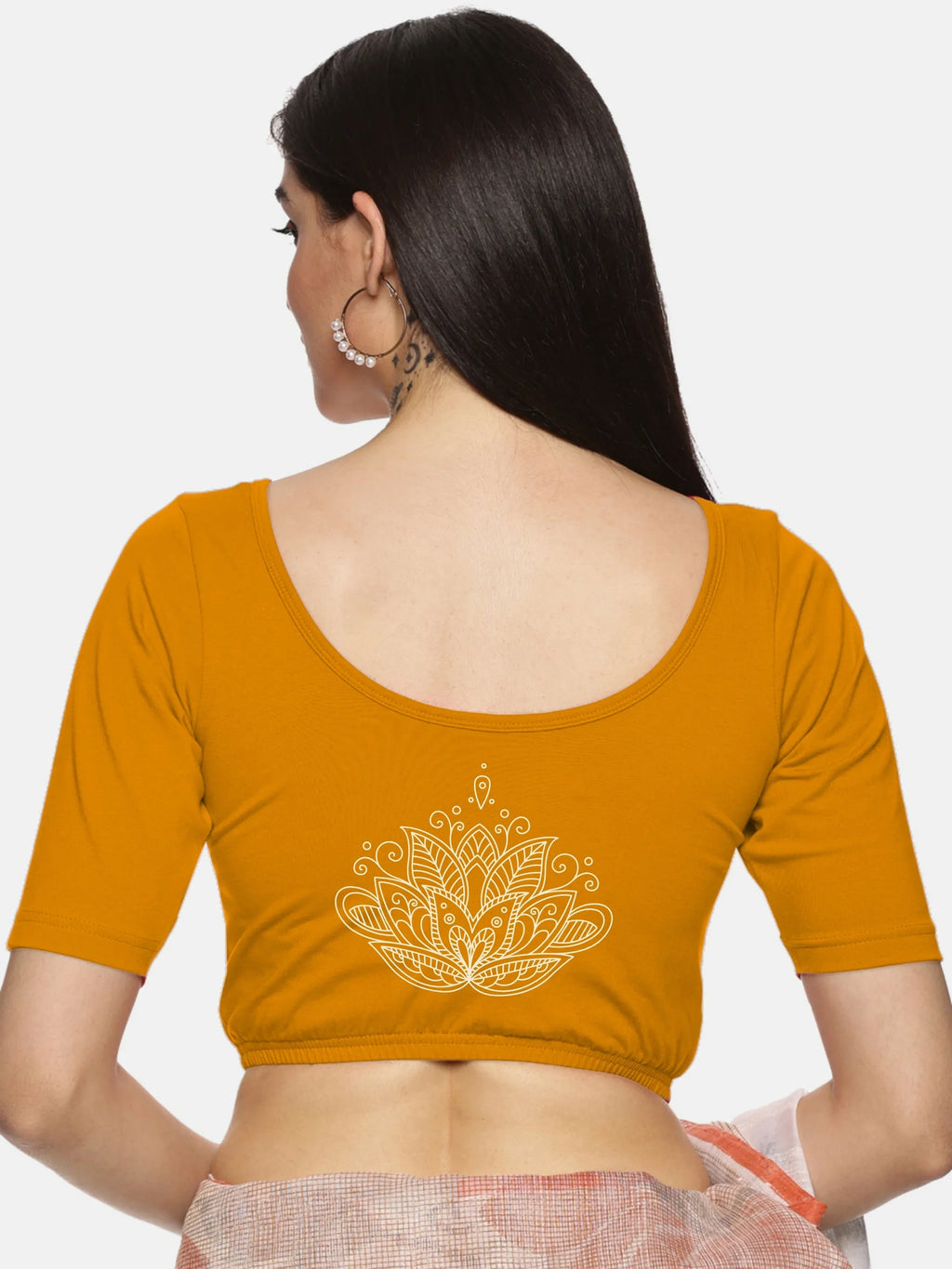 Solid blouse with back print in stretchable soft cotton, has a round neckline, has 2 front darts for best fitting, sleeve length till the elbow. The blouse has an elasticated bottom to avoid spillage