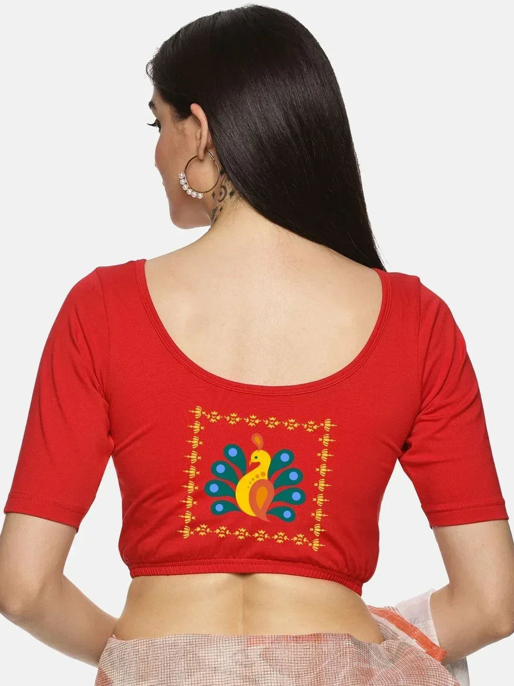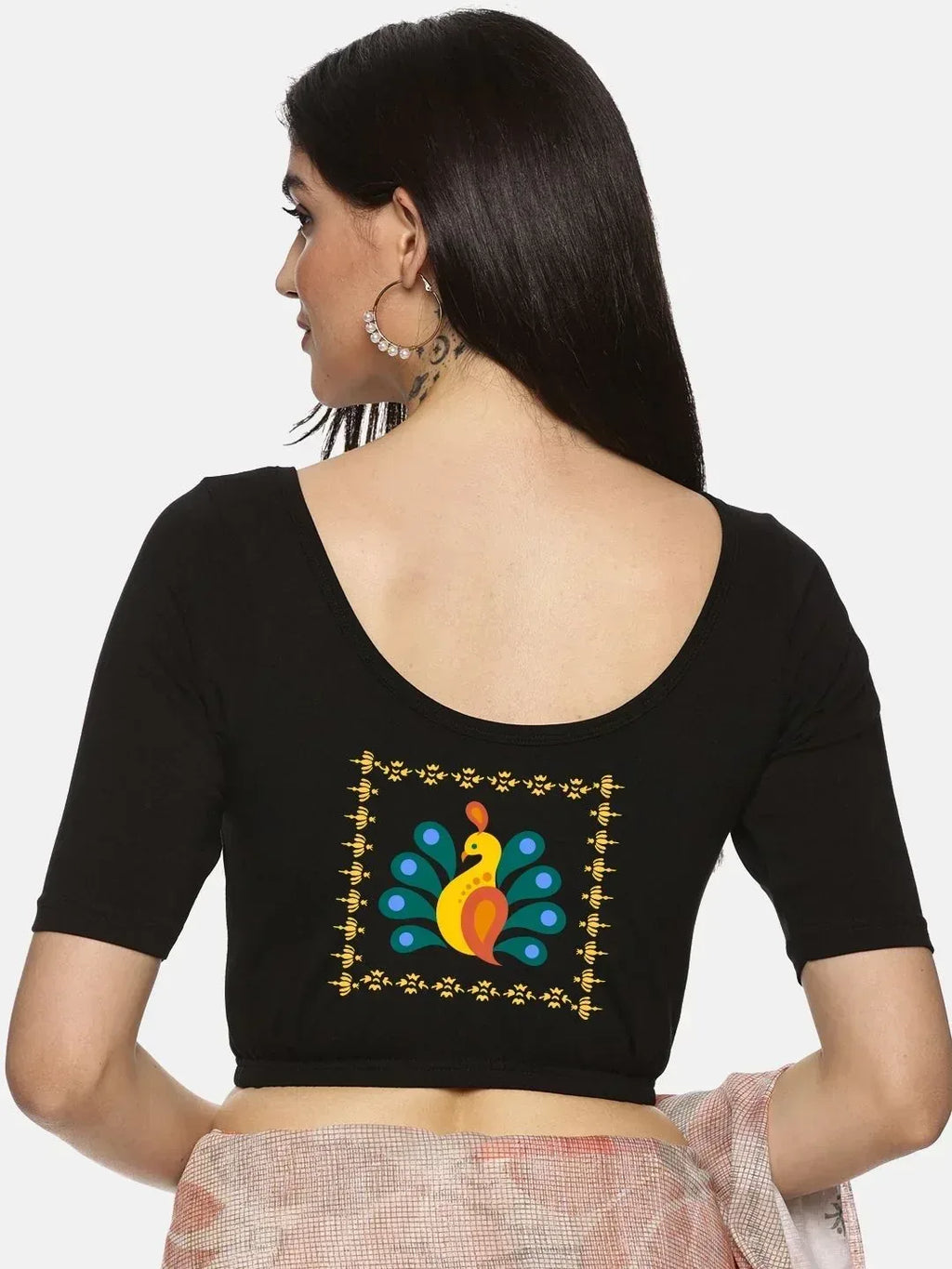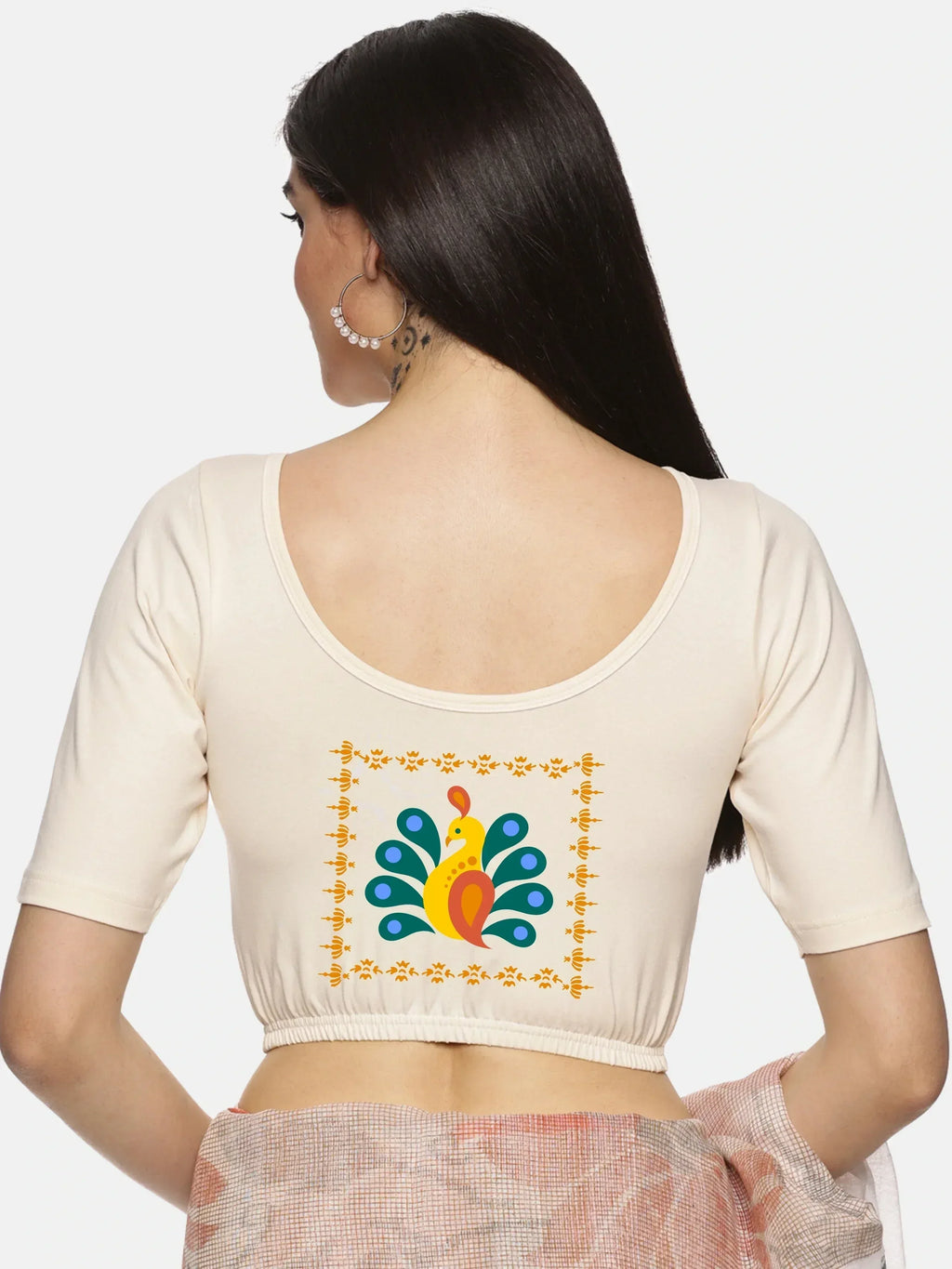 Solid blouse with back print in stretchable soft cotton, has a round neckline, has 2 front darts for best fitting, sleeve length till the elbow. The blouse has an elasticated bottom to avoid spillage