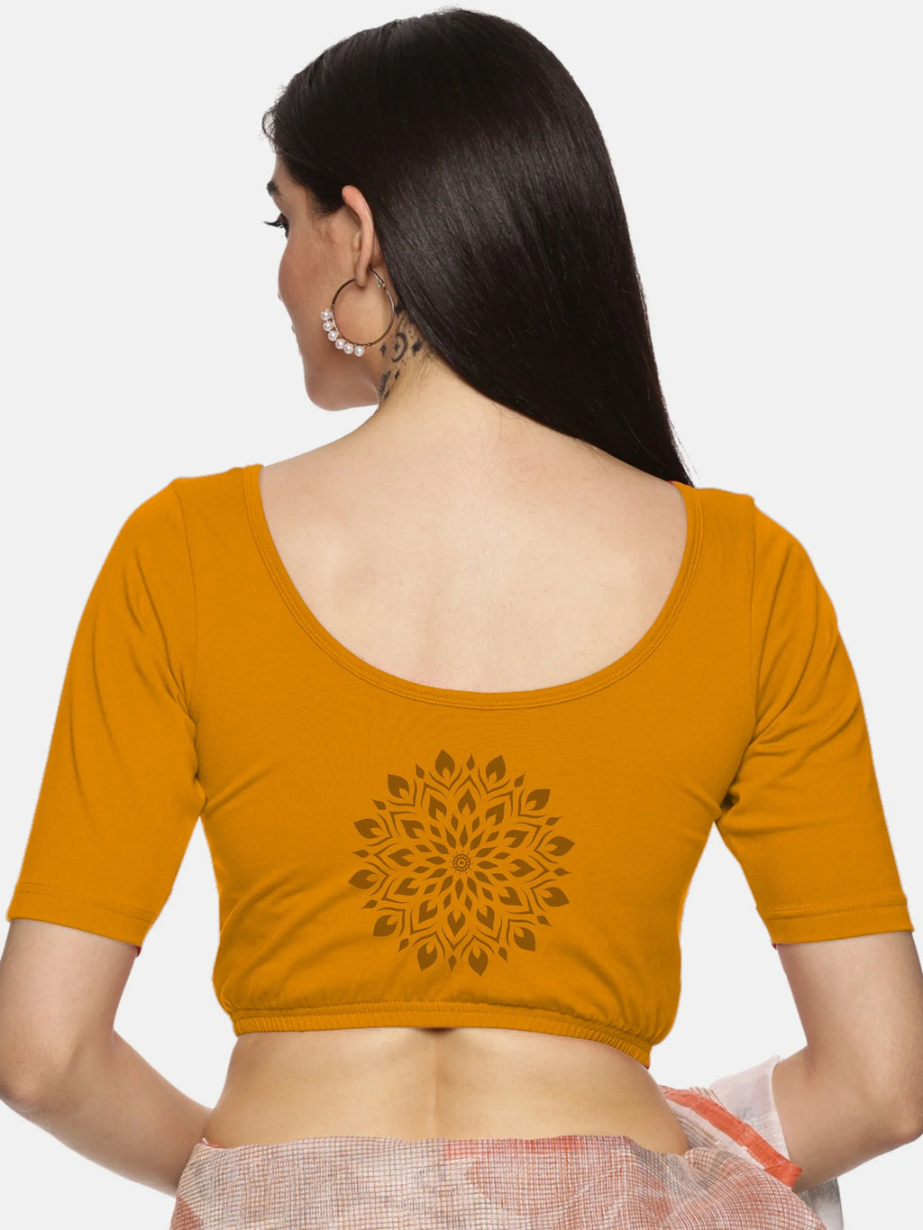 Solid blouse with back print in stretchable soft cotton, has a round neckline, has 2 front darts for best fitting, sleeve length till the elbow. The blouse has an elasticated bottom to avoid spillage