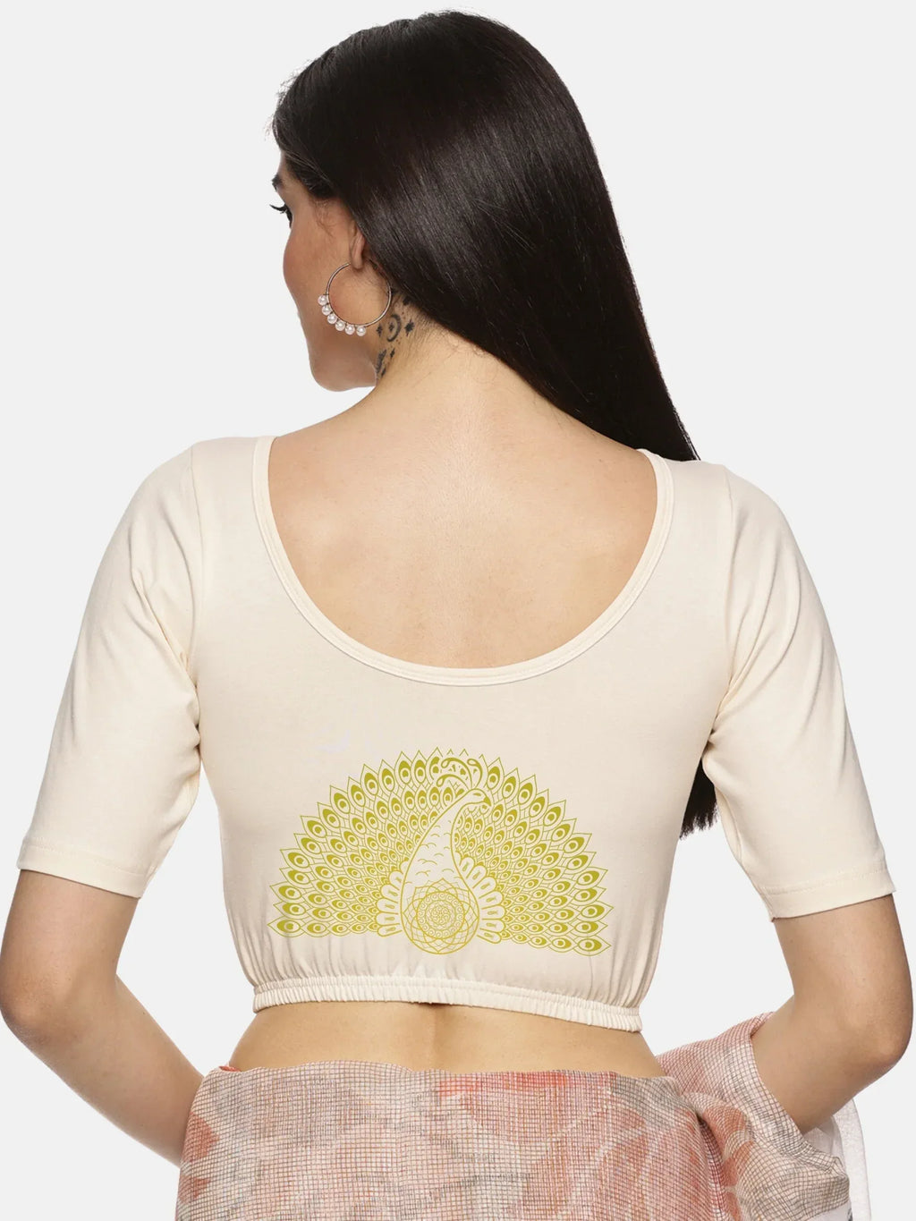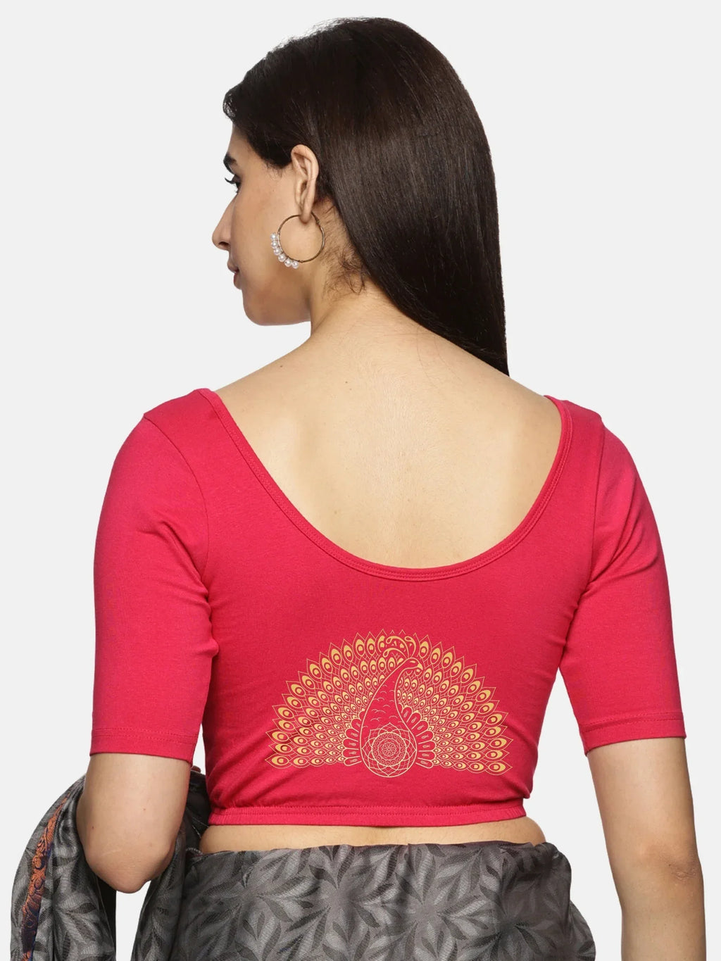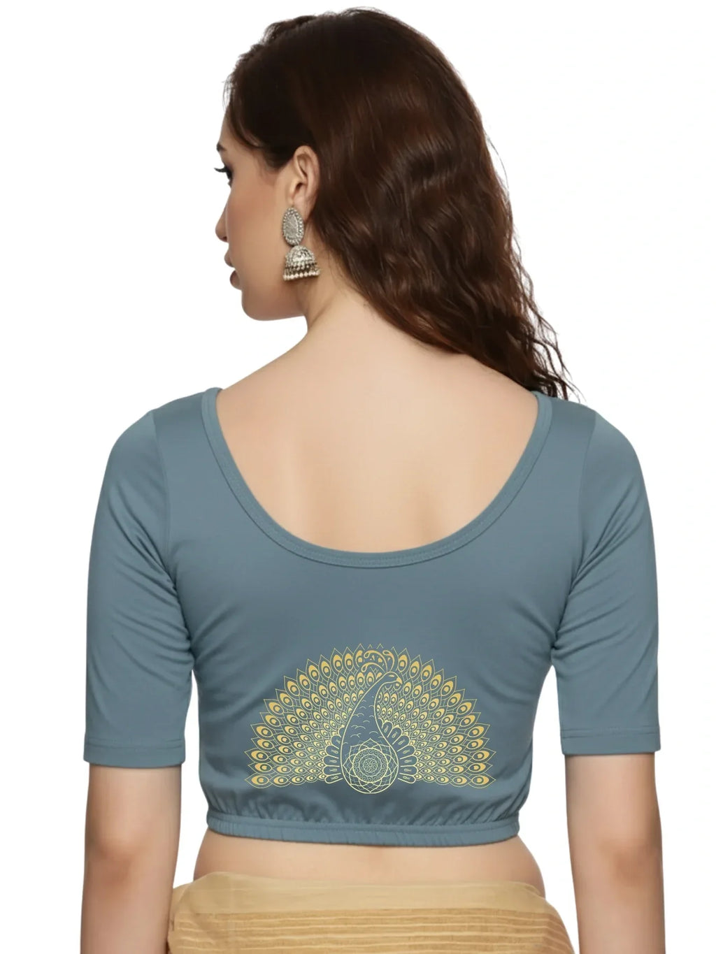 Solid blouse with back print in stretchable soft cotton, has a round neckline, has 2 front darts for best fitting, sleeve length till the elbow. The blouse has an elasticated bottom to avoid spillage