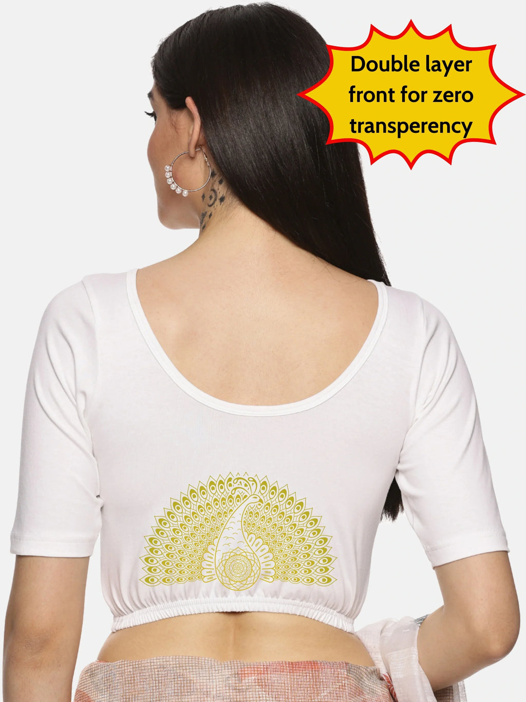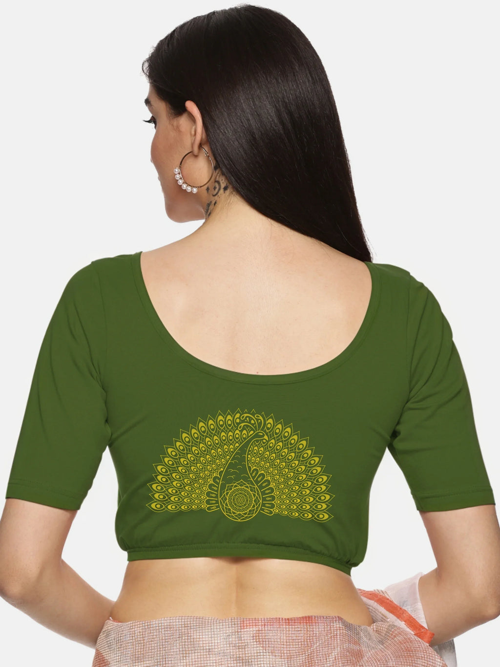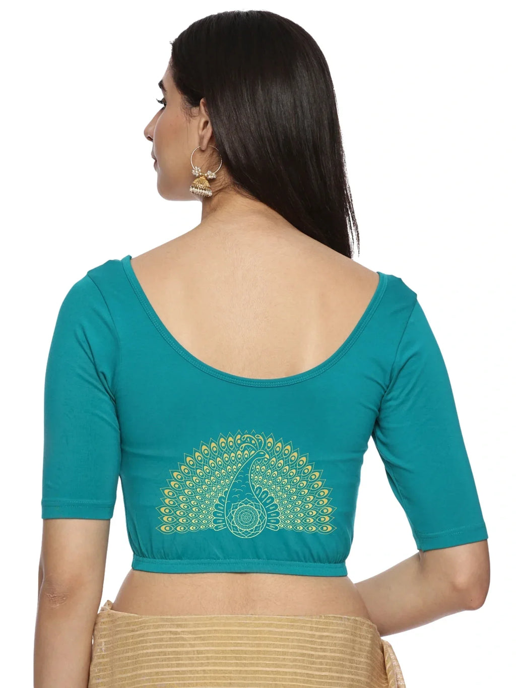 Solid blouse with back print in stretchable soft cotton, has a round neckline, has 2 front darts for best fitting, sleeve length till the elbow. The blouse has an elasticated bottom to avoid spillage