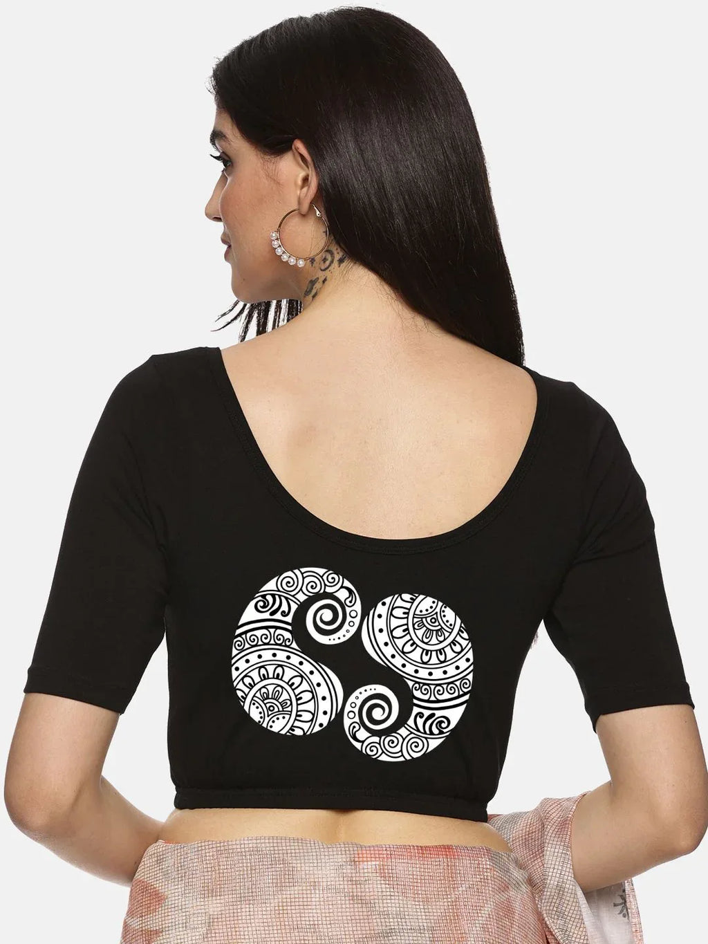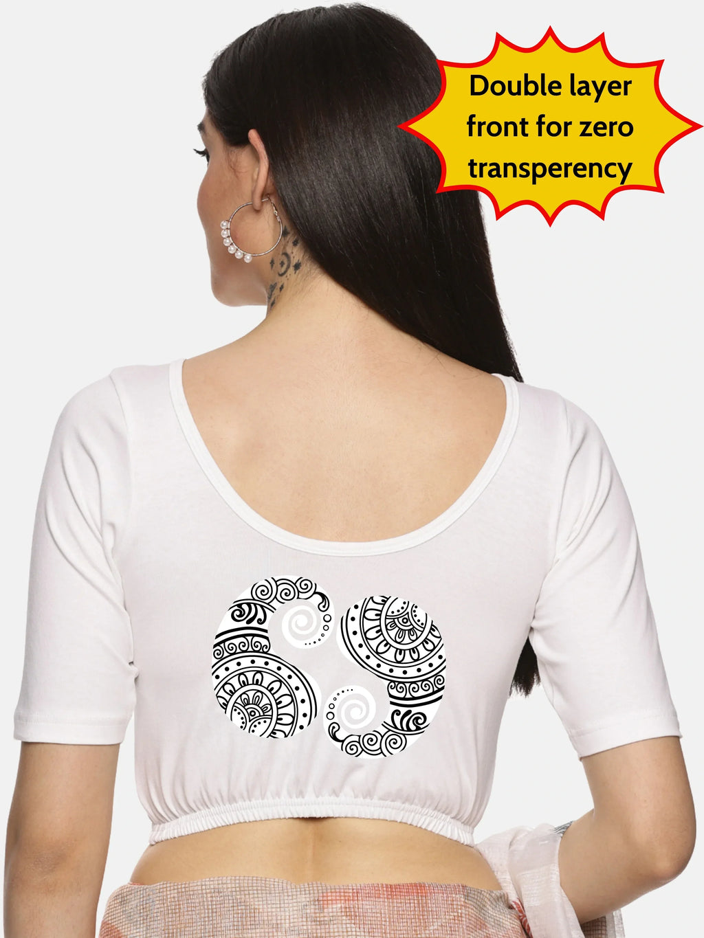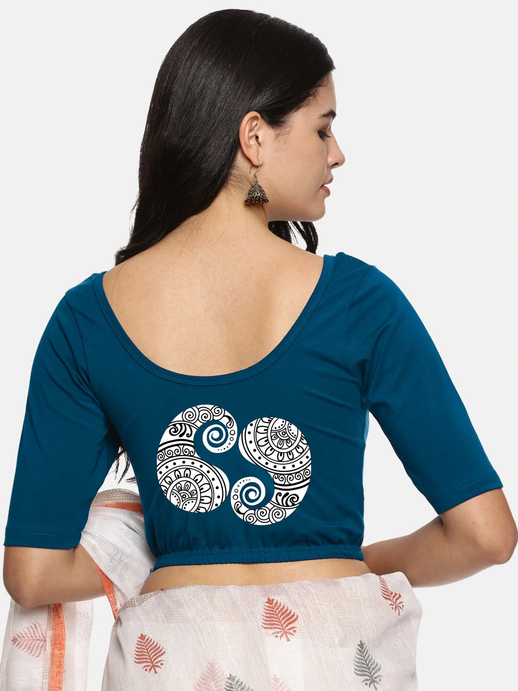 Solid blouse with back print in stretchable soft cotton, has a round neckline, has 2 front darts for best fitting, sleeve length till the elbow. The blouse has an elasticated bottom to avoid spillage