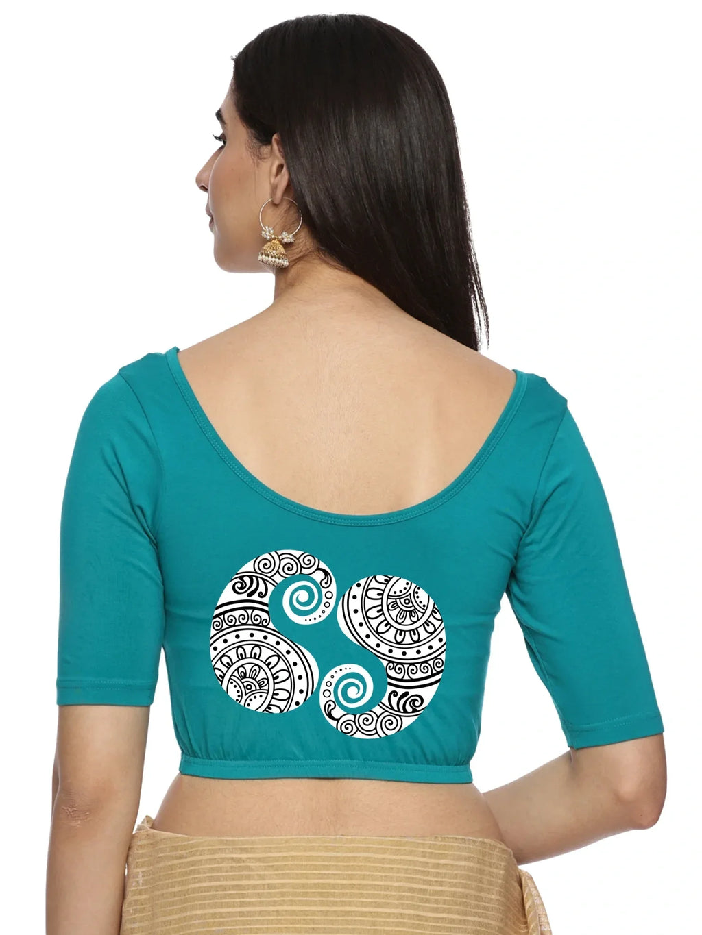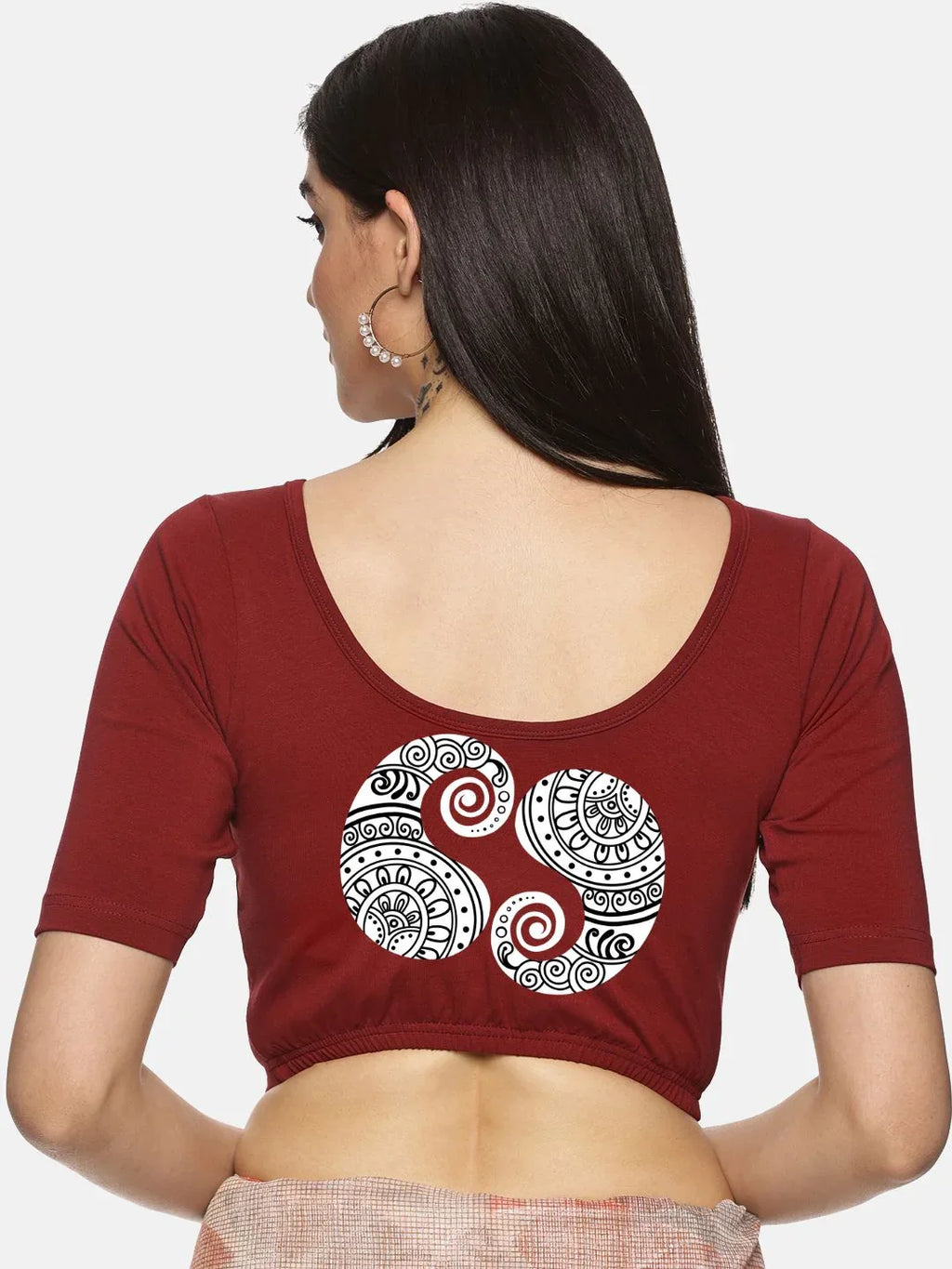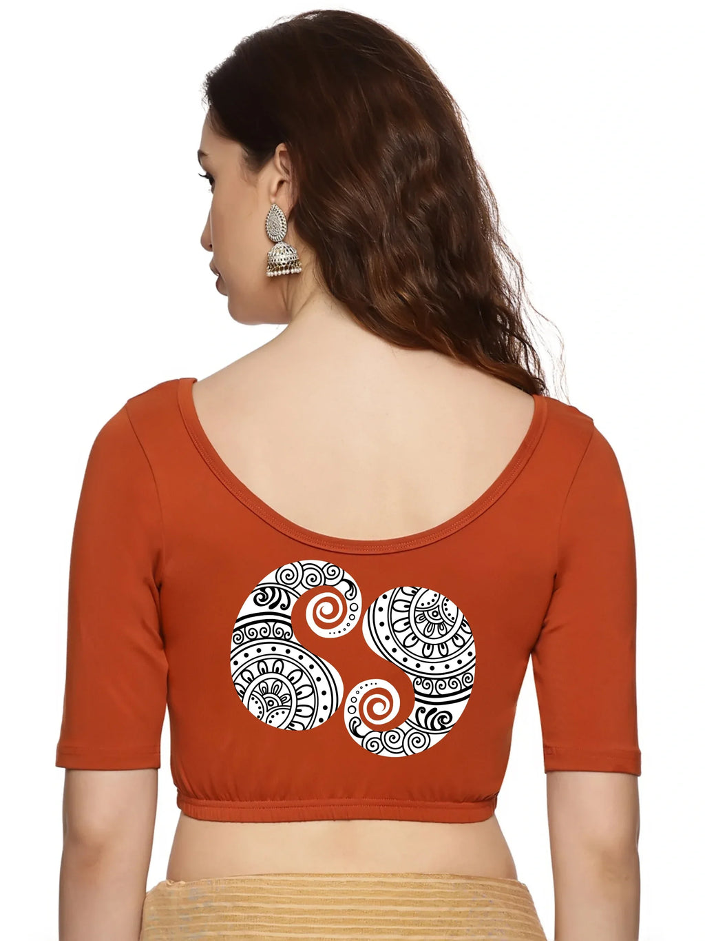 Solid blouse with back print in stretchable soft cotton, has a round neckline, has 2 front darts for best fitting, sleeve length till the elbow. The blouse has an elasticated bottom to avoid spillage