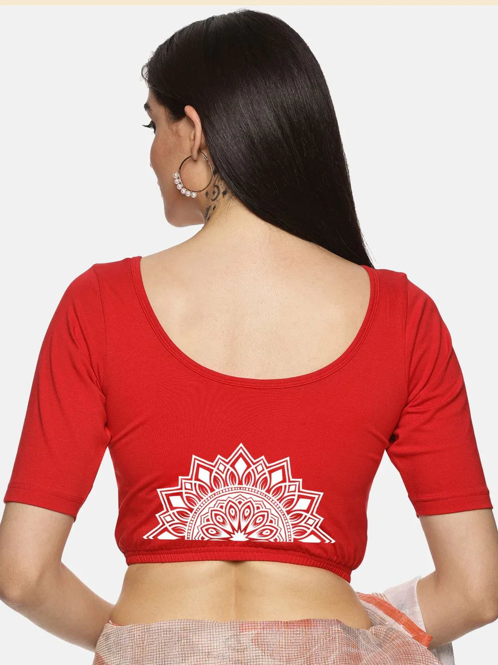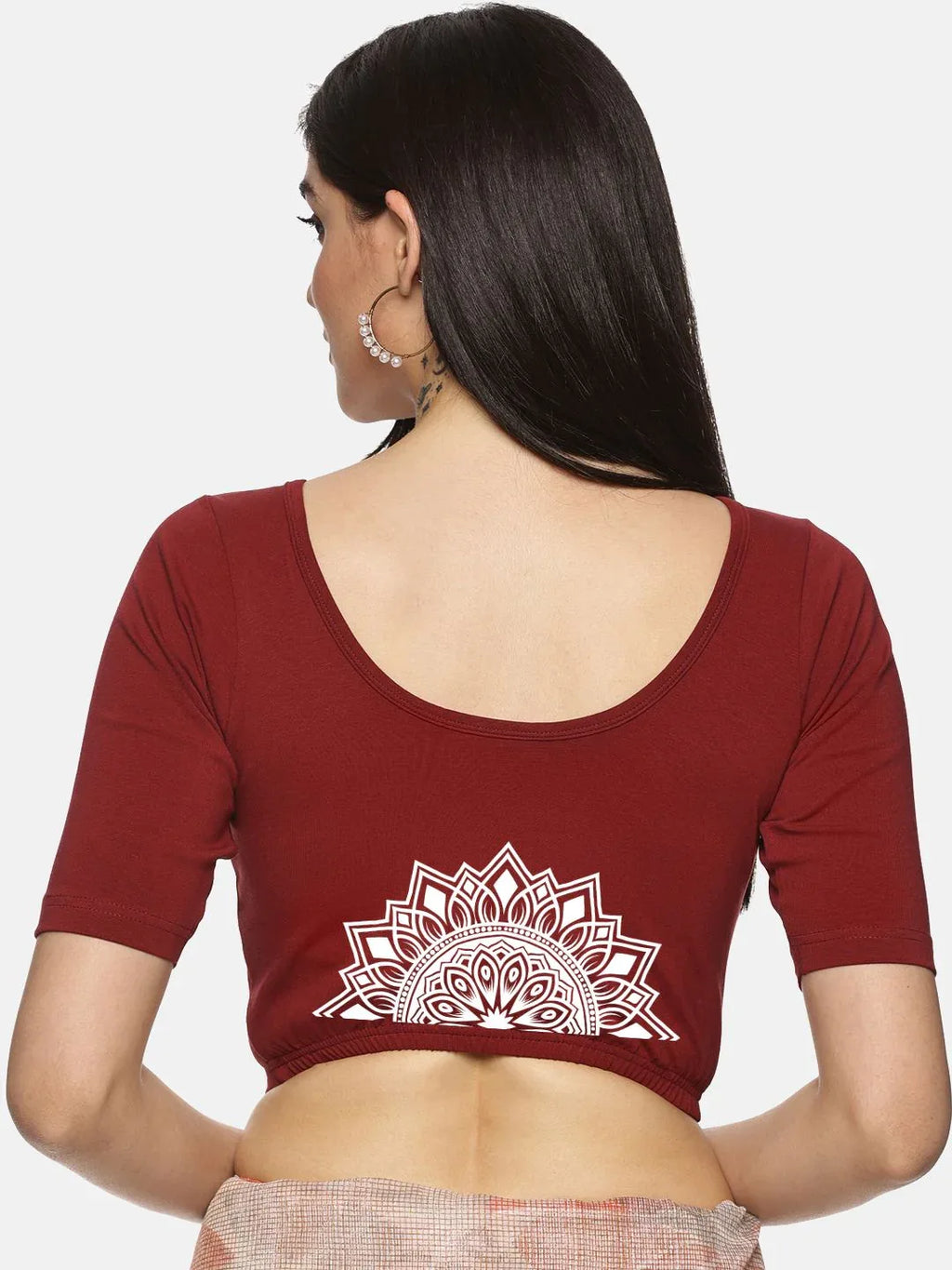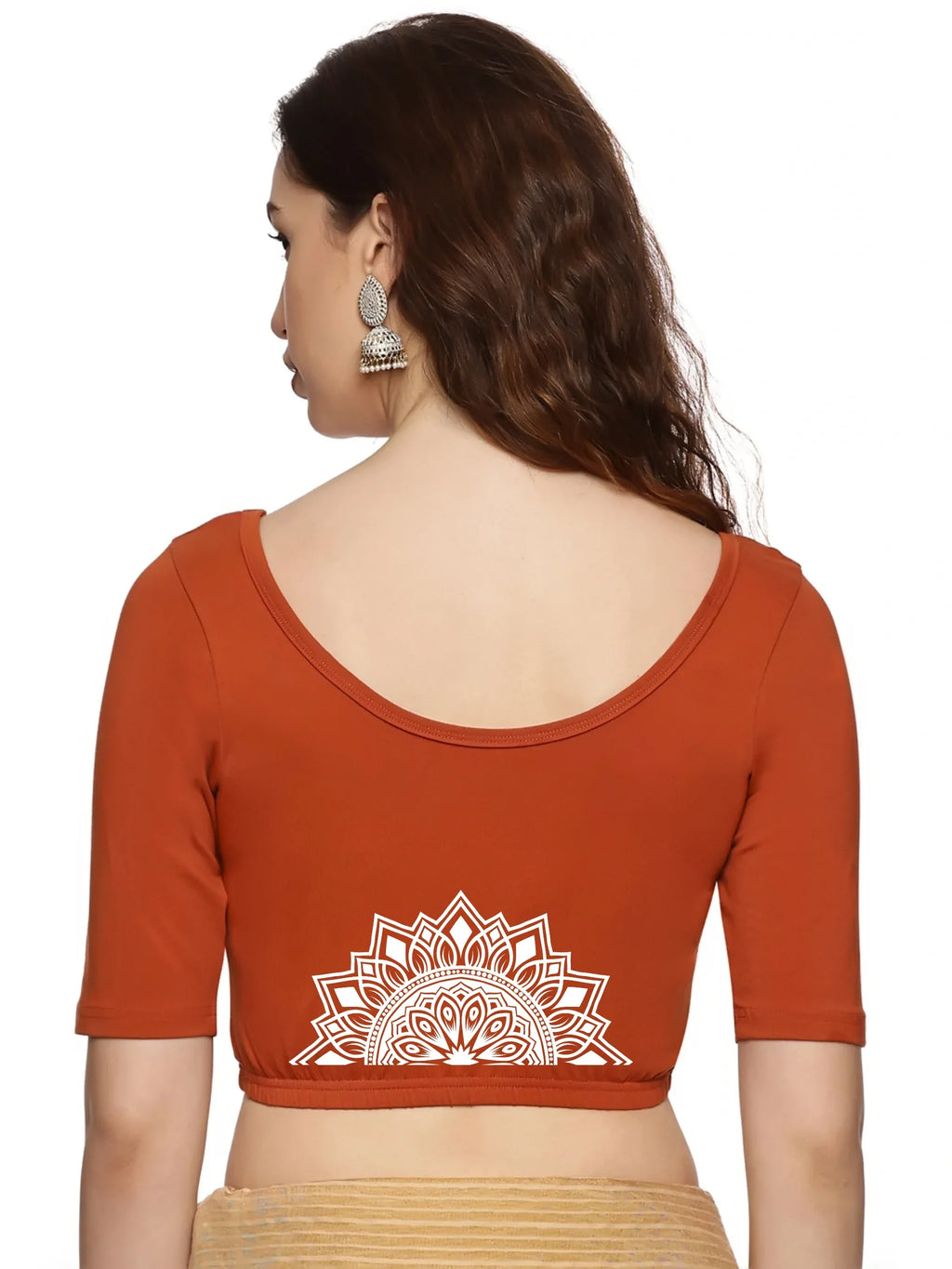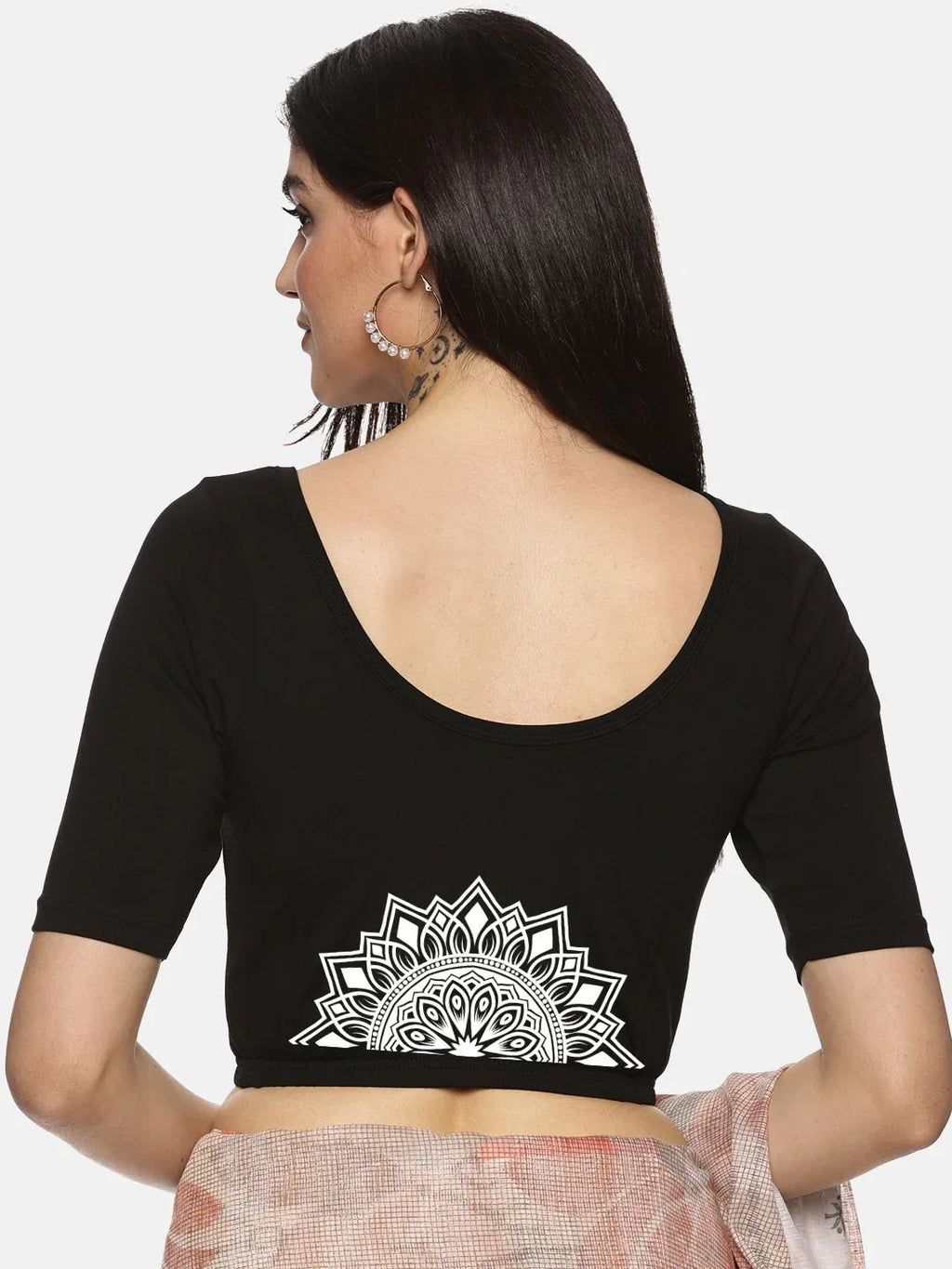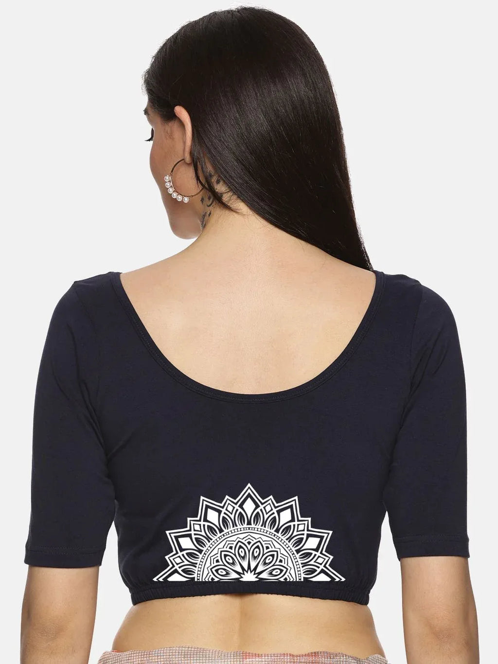 Solid blouse with back print in stretchable soft cotton, has a round neckline, has 2 front darts for best fitting, sleeve length till the elbow. The blouse has an elasticated bottom to avoid spillage