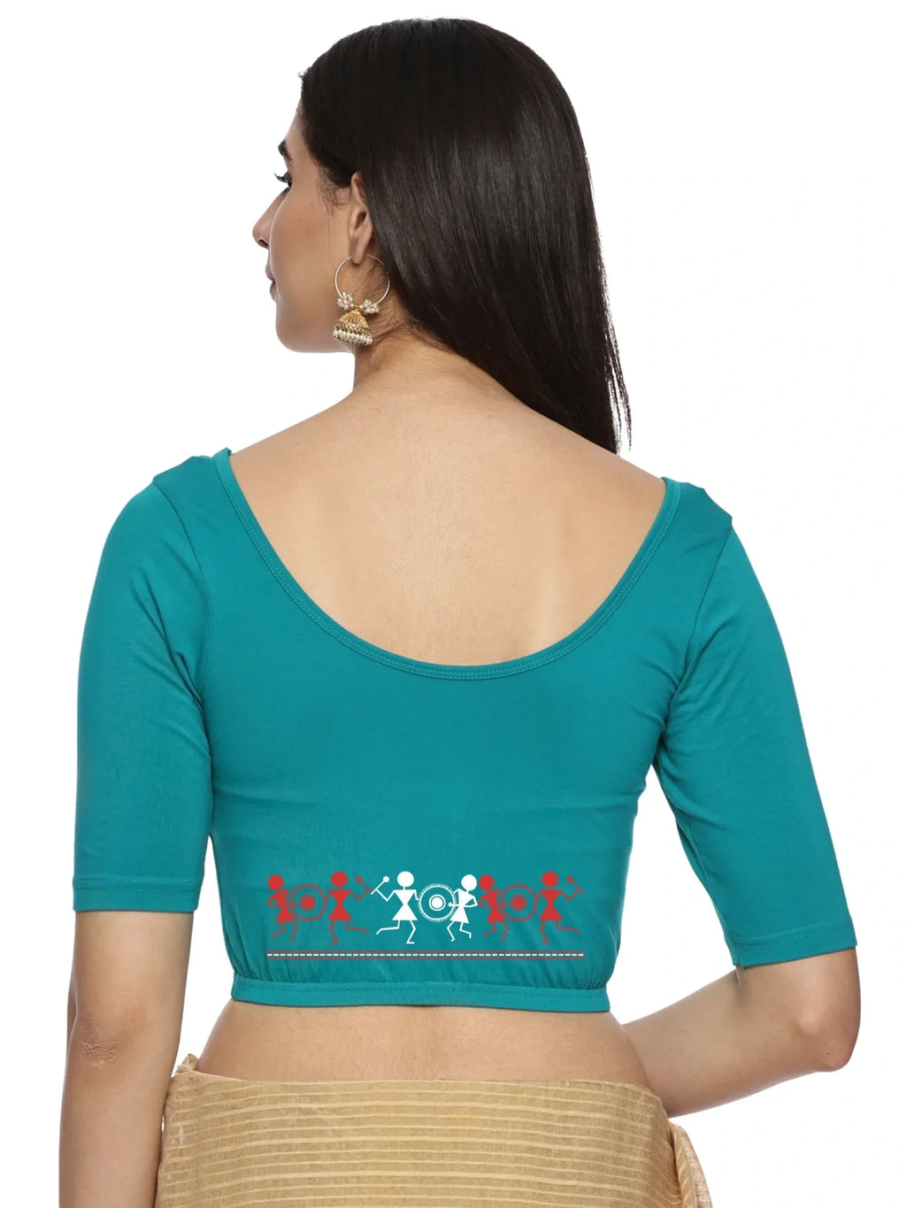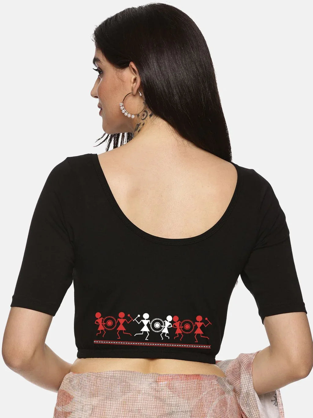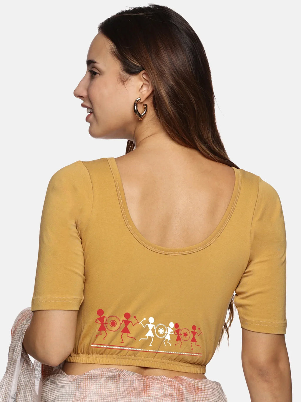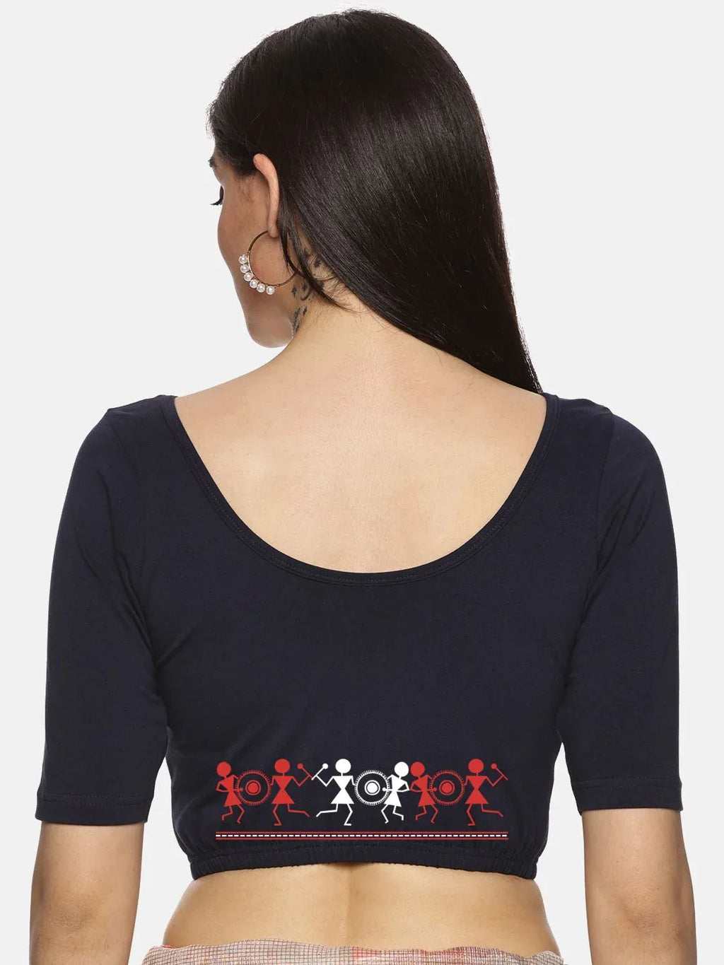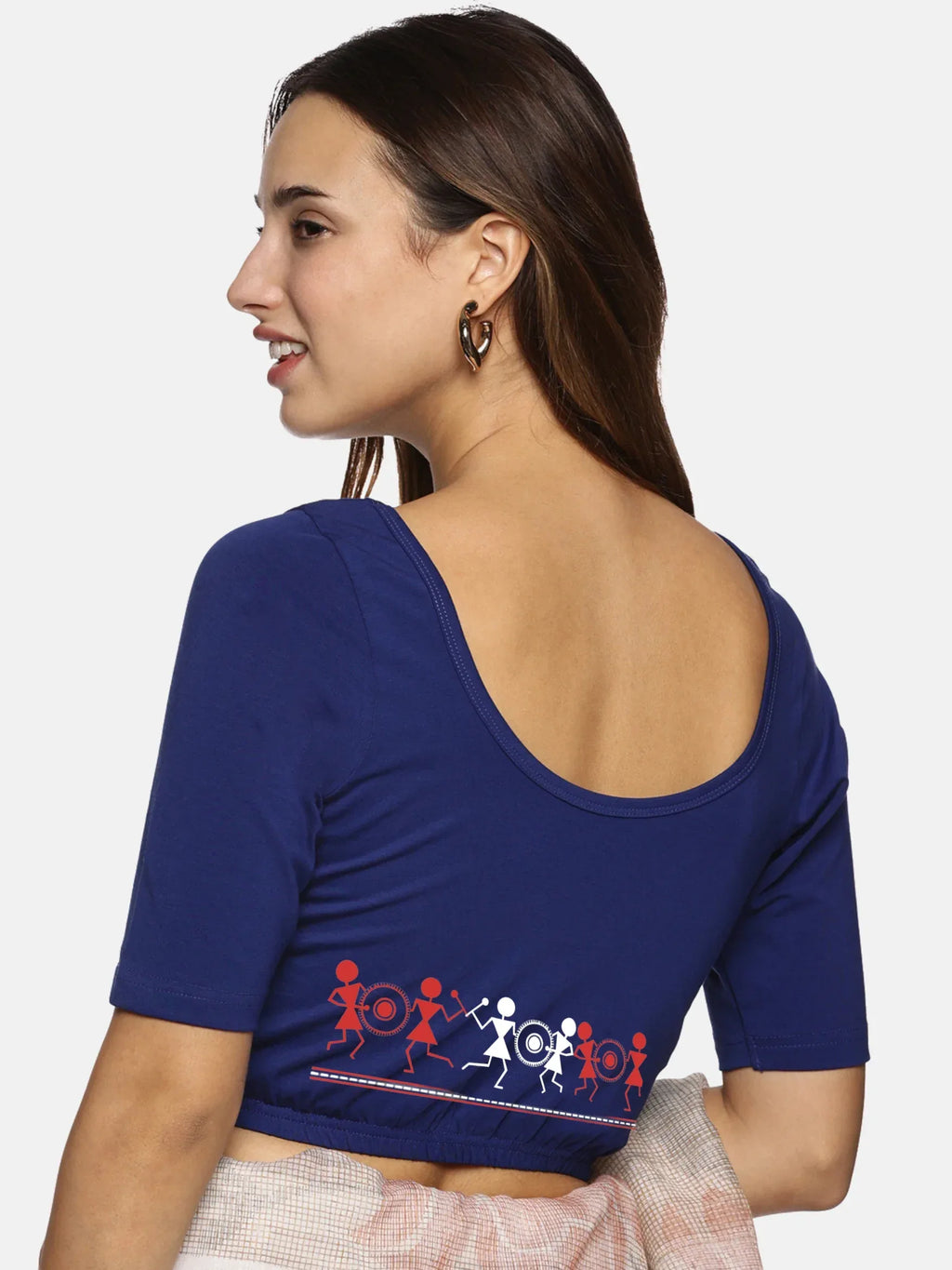 Solid blouse with back print in stretchable soft cotton, has a round neckline, has 2 front darts for best fitting, sleeve length till the elbow. The blouse has an elasticated bottom to avoid spillage
