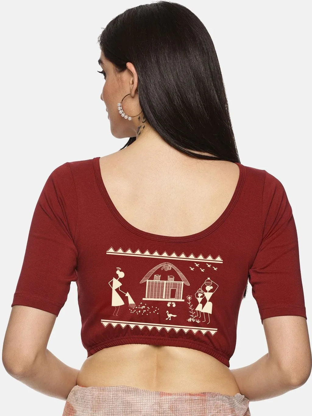 Solid blouse with back print in stretchable soft cotton, has a round neckline, has 2 front darts for best fitting, sleeve length till the elbow. The blouse has an elasticated bottom to avoid spillage
