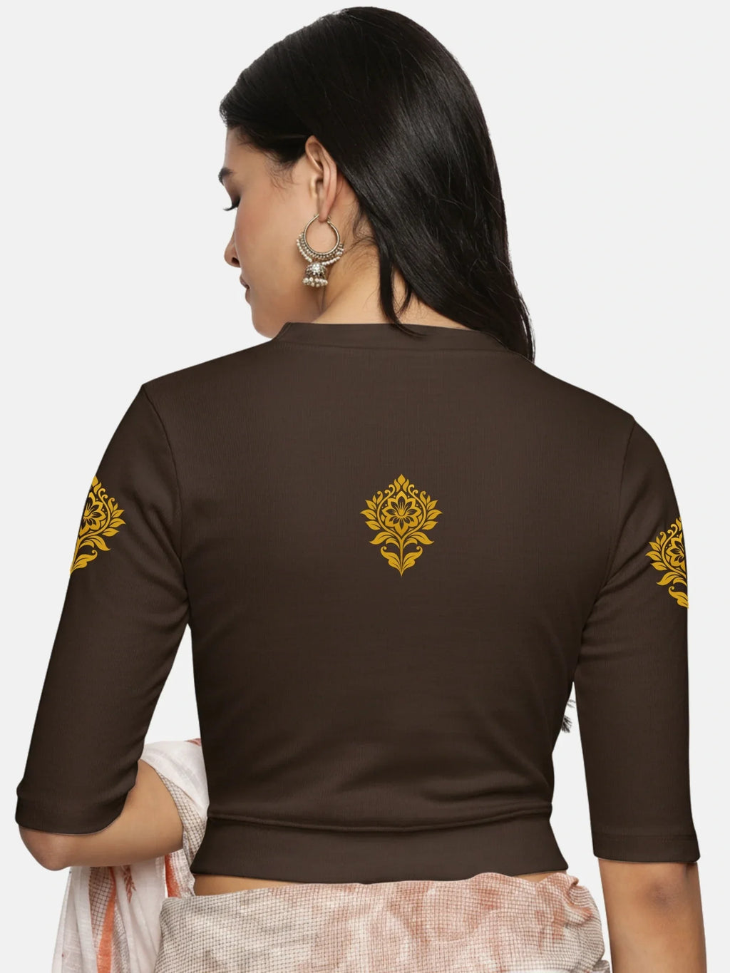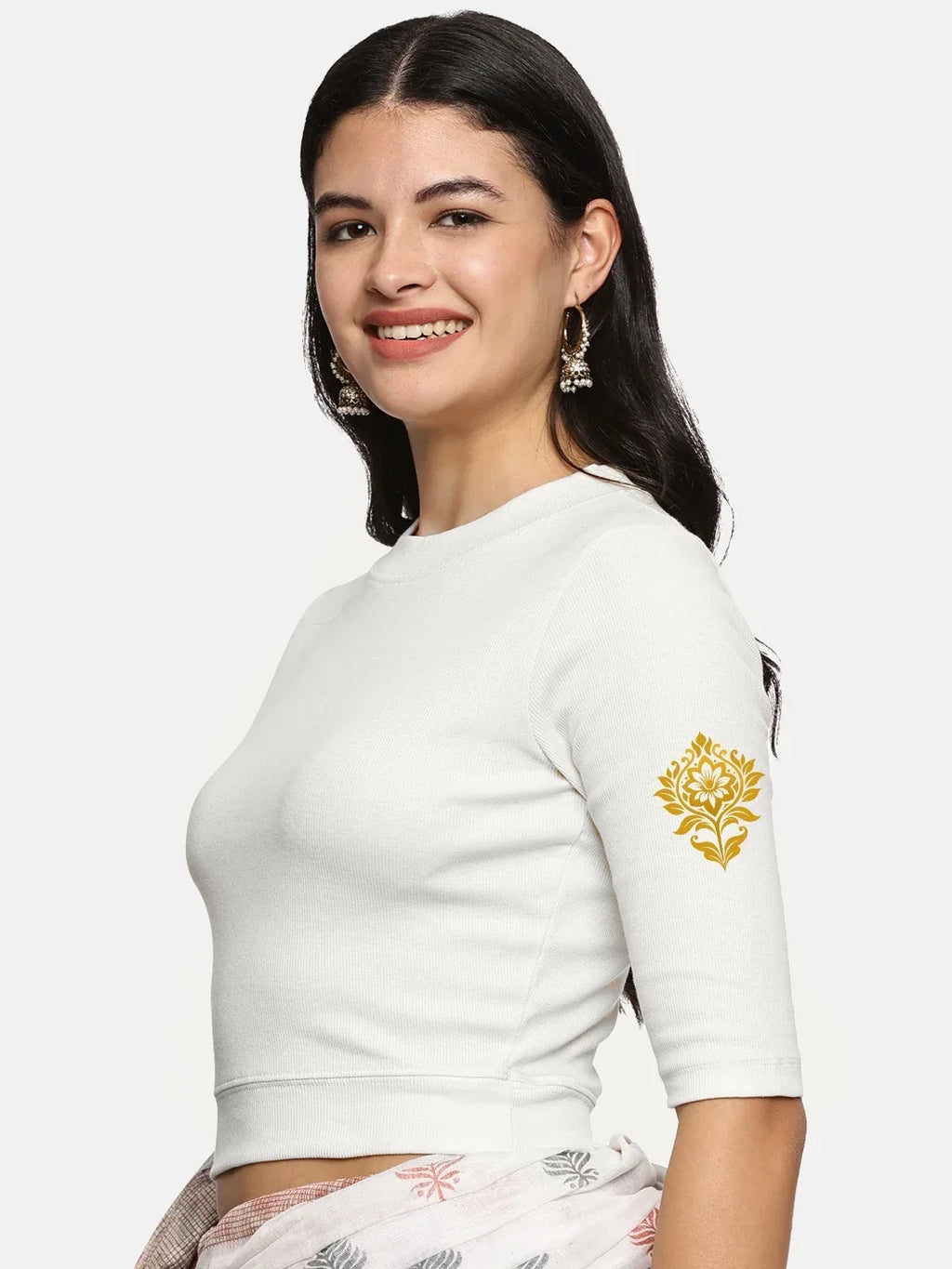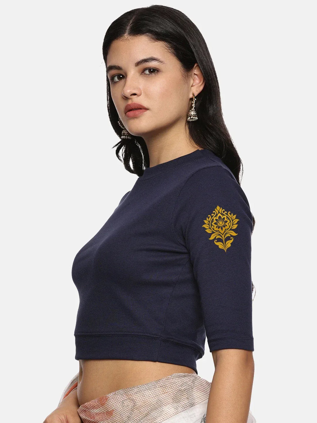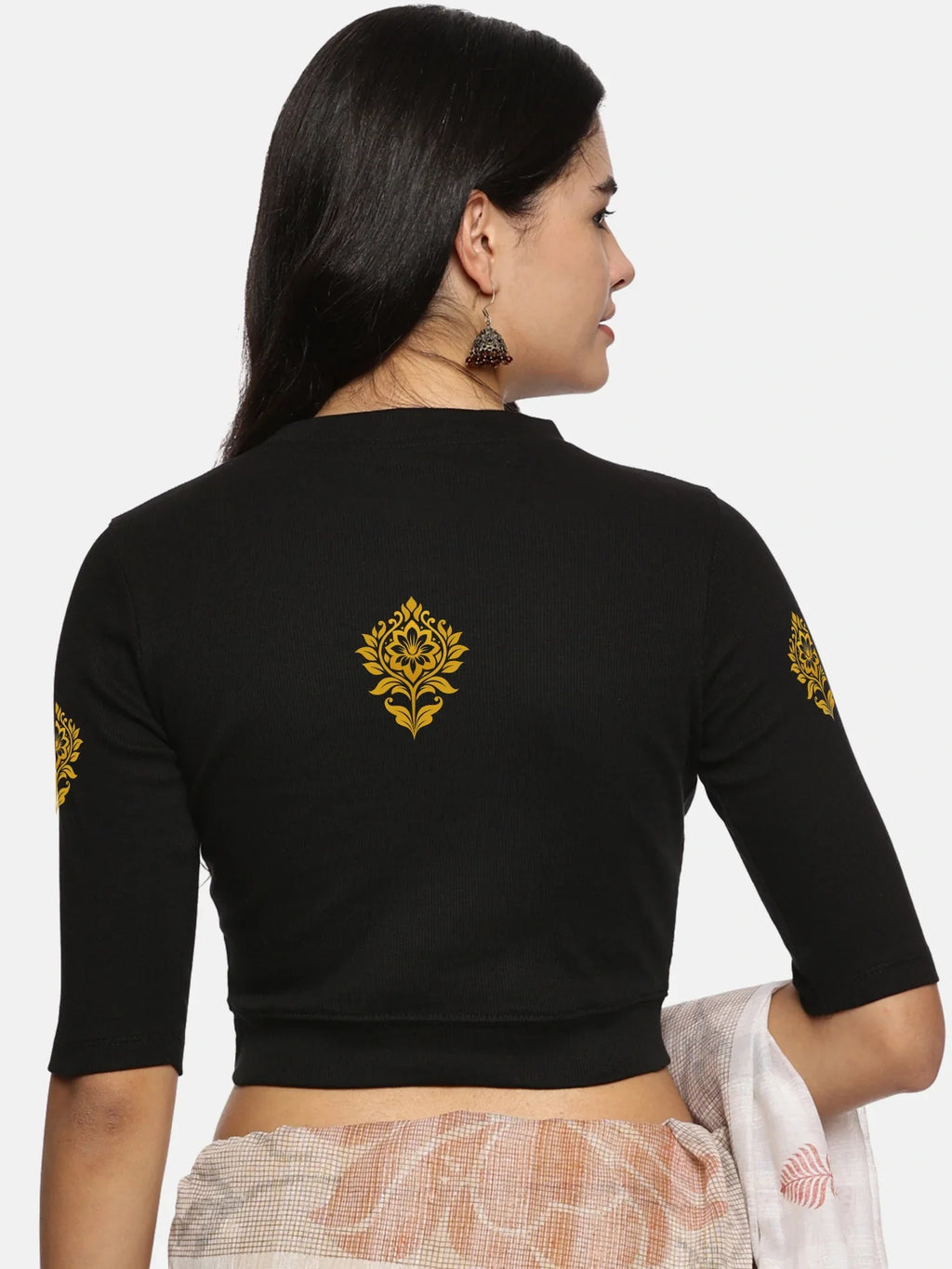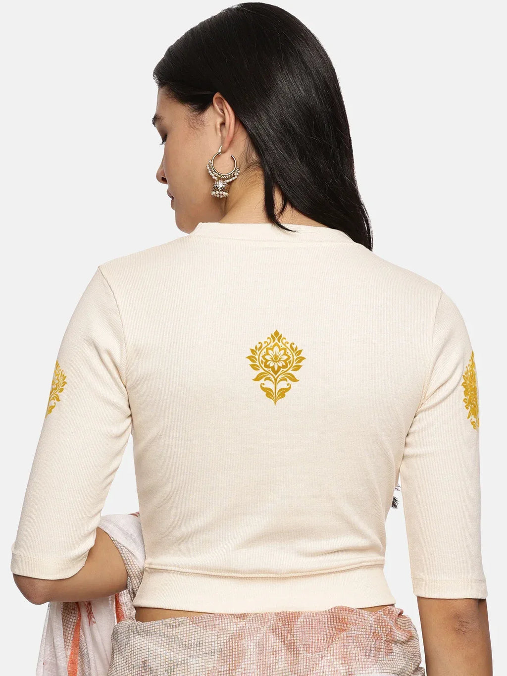 RIB blouse with back print in  stretchable soft cotton, has a round neckline, sleeve length till the elbow. The blouse has a Rib double fold band at waist bottom to avoid spillage