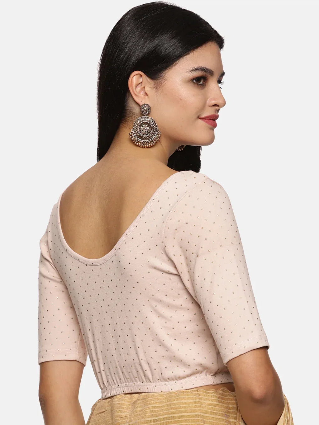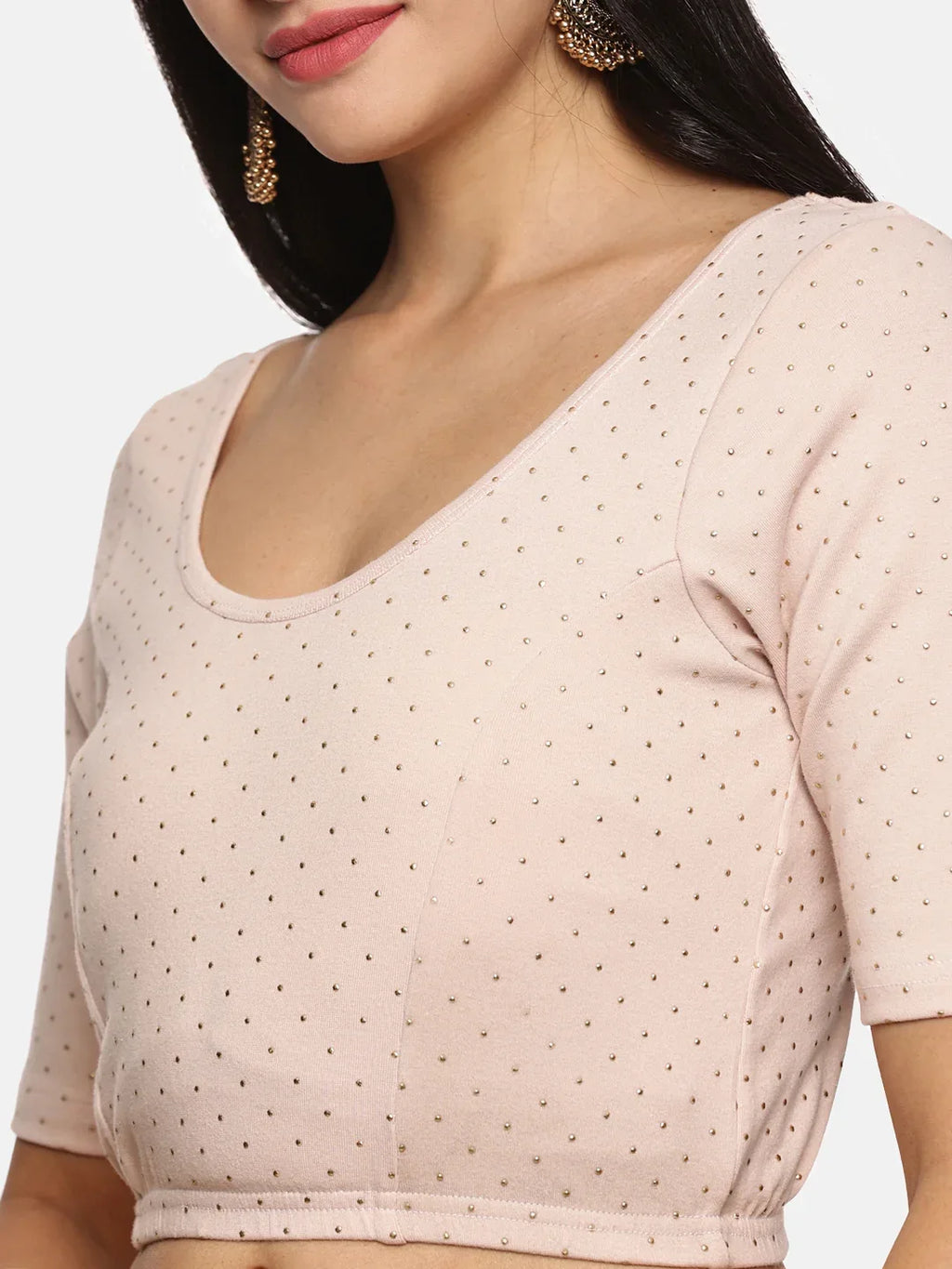 Allover Dotted blouse in stretchable soft cotton, has a round neckline, has 2 front darts for best fitting, sleeve length till the elbow. The blouse has an elasticated bottom to avoid spillage