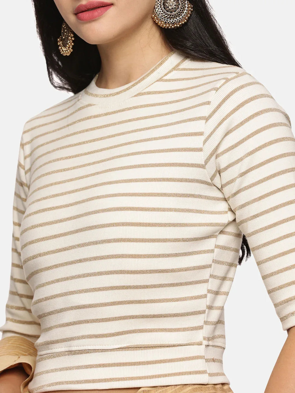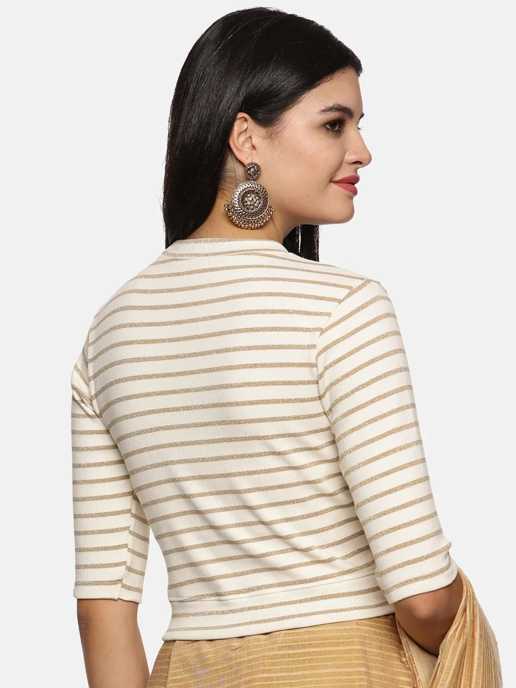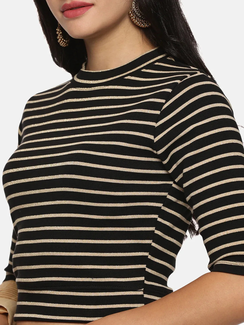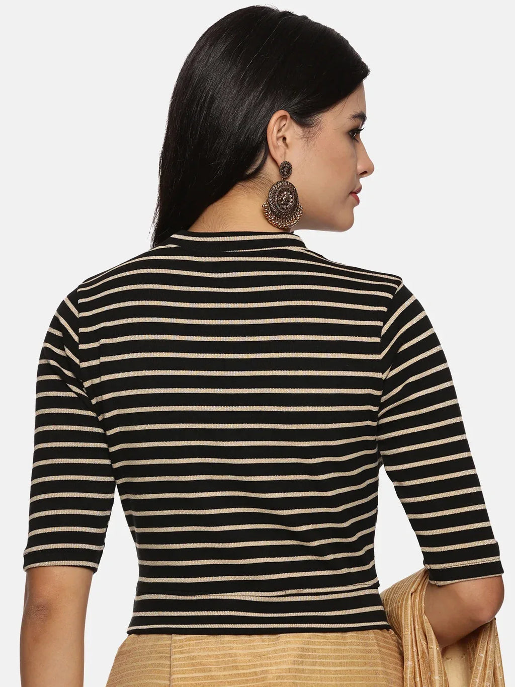RIB blouse with Yarn Dyed in stretchable soft cotton & Gold Lurex , has a round neckline, sleeve length till the elbow. The blouse has a Rib double fold band at waist bottom to avoid spillage