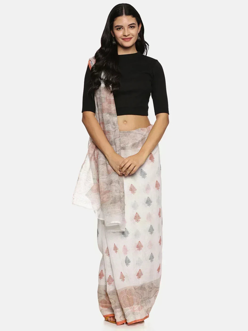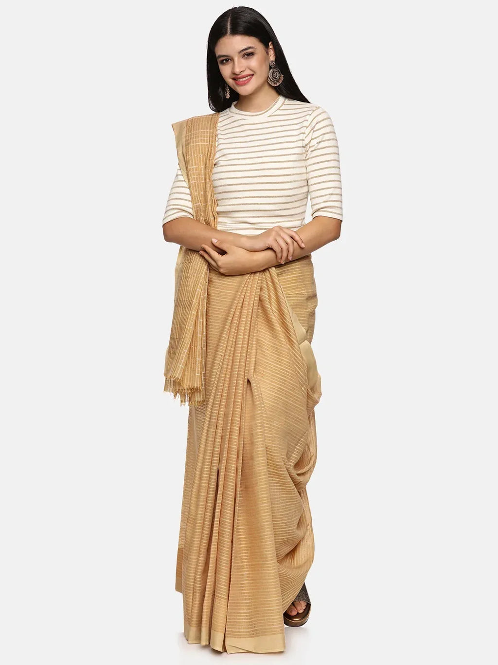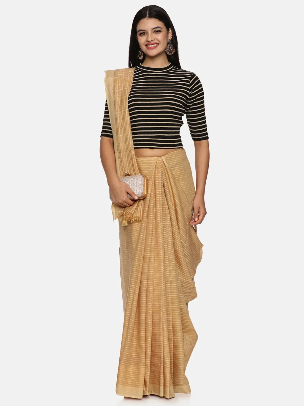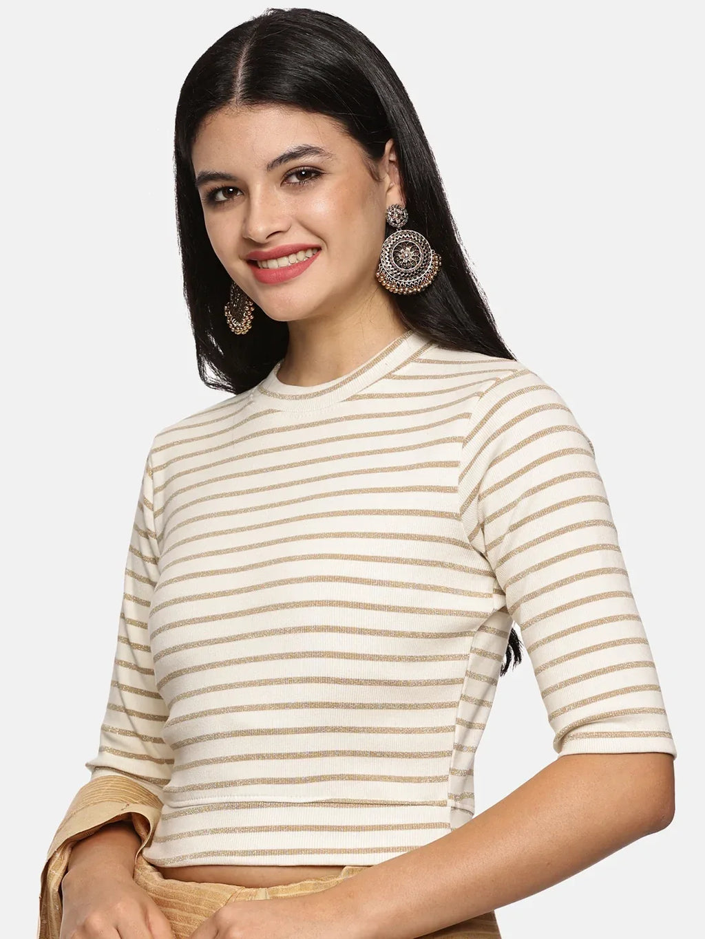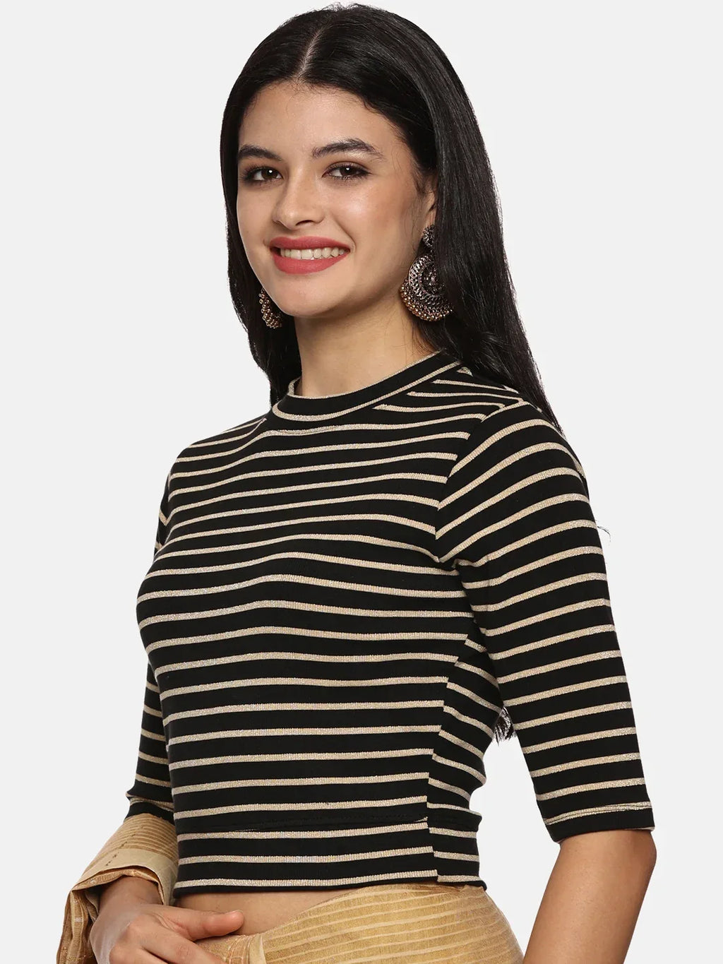 RIB blouse with Yarn Dyed in stretchable soft cotton & Gold Lurex , has a round neckline, sleeve length till the elbow. The blouse has a Rib double fold band at waist bottom to avoid spillage