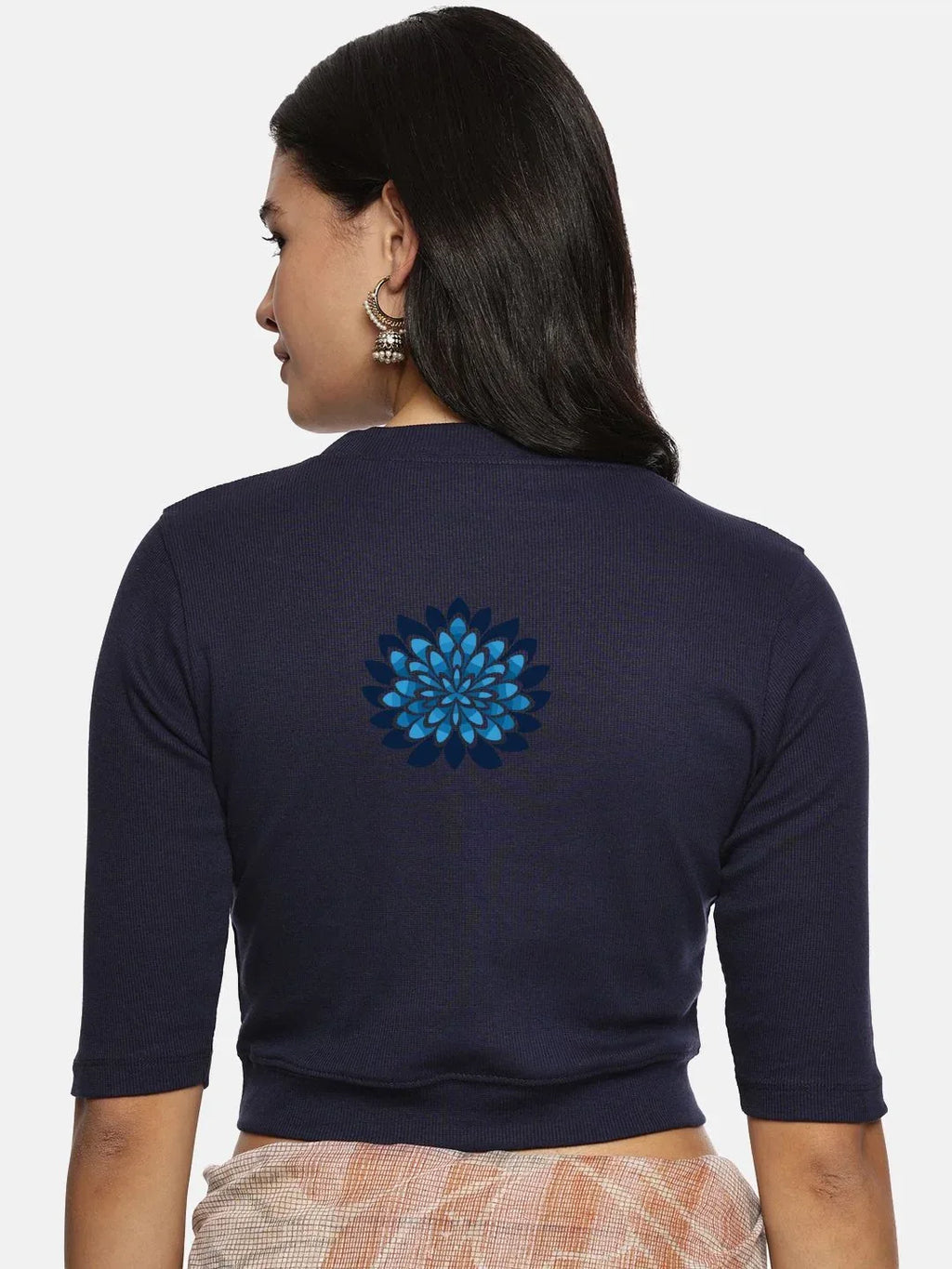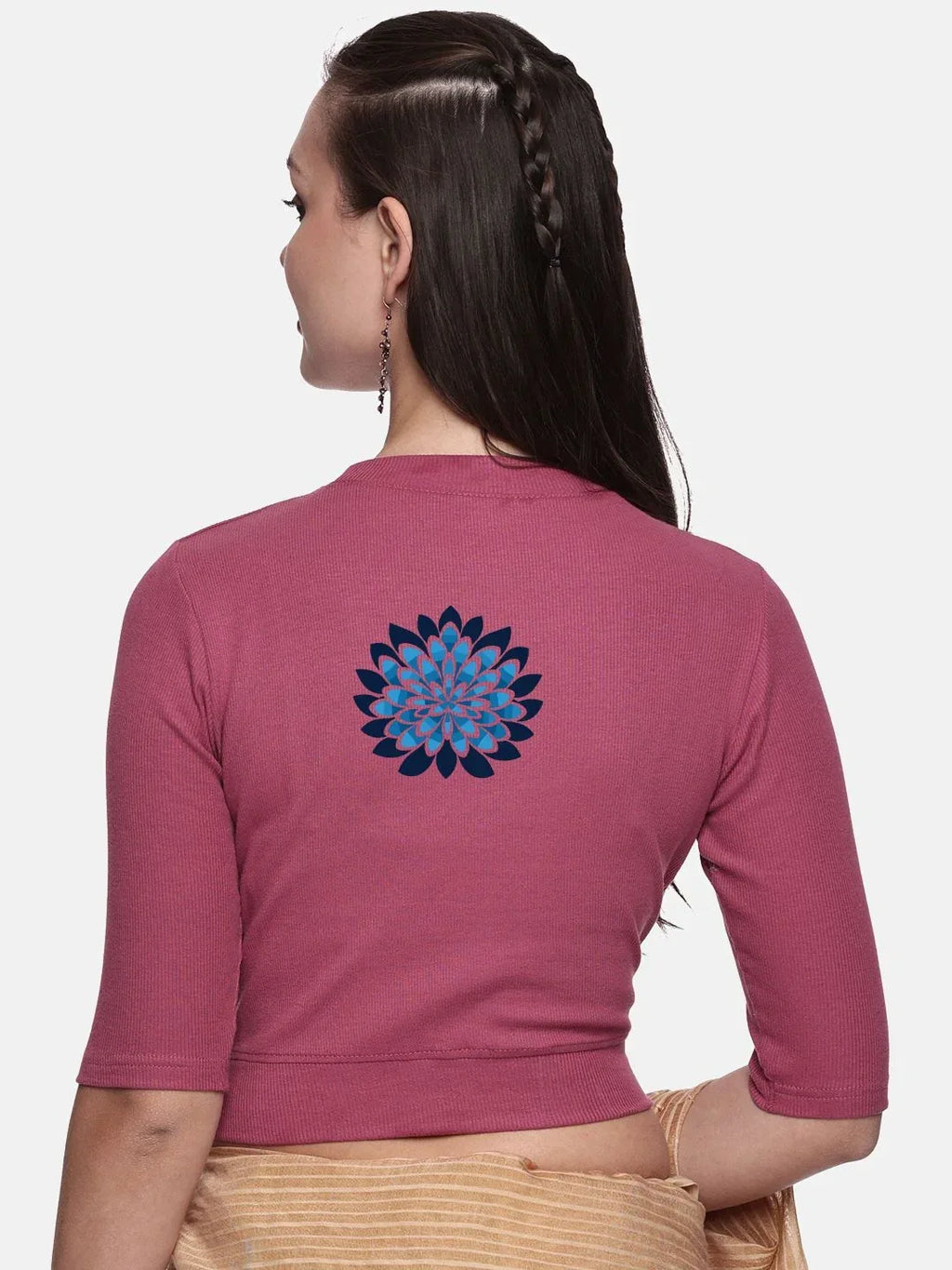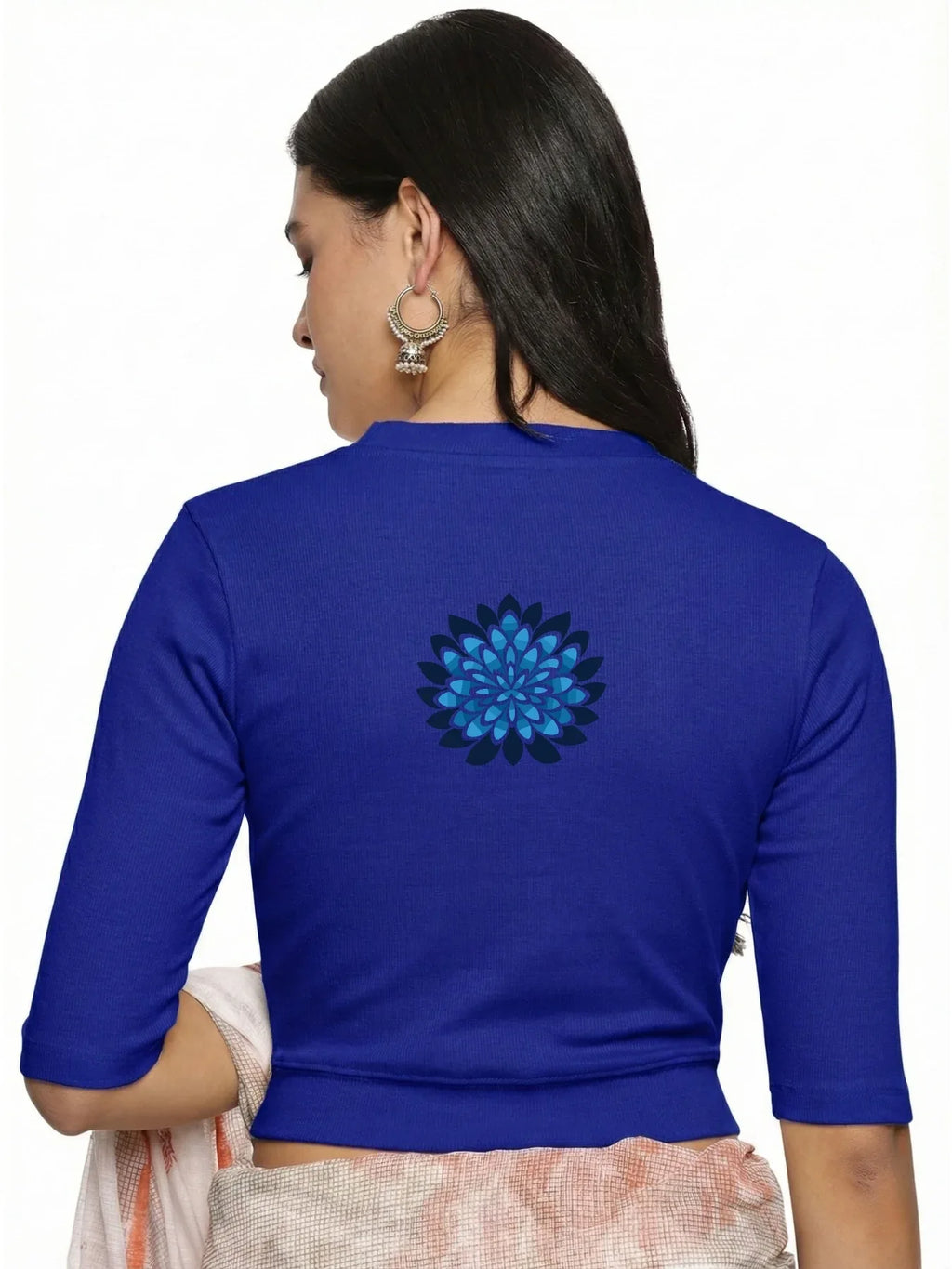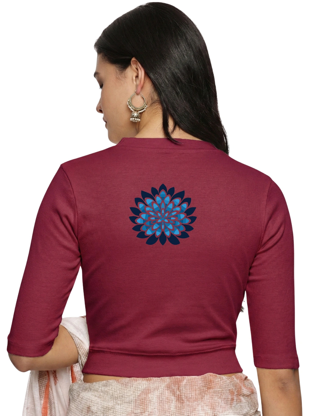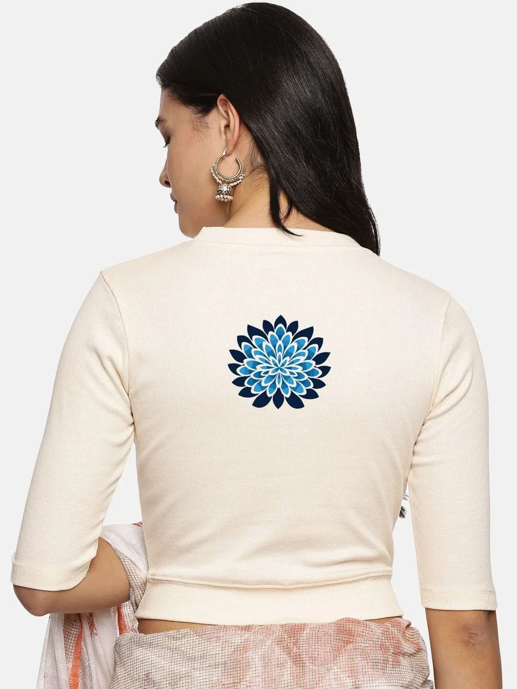 RIB blouse with back print in  stretchable soft cotton, has a round neckline, sleeve length till the elbow. The blouse has a Rib double fold band at waist bottom to avoid spillage