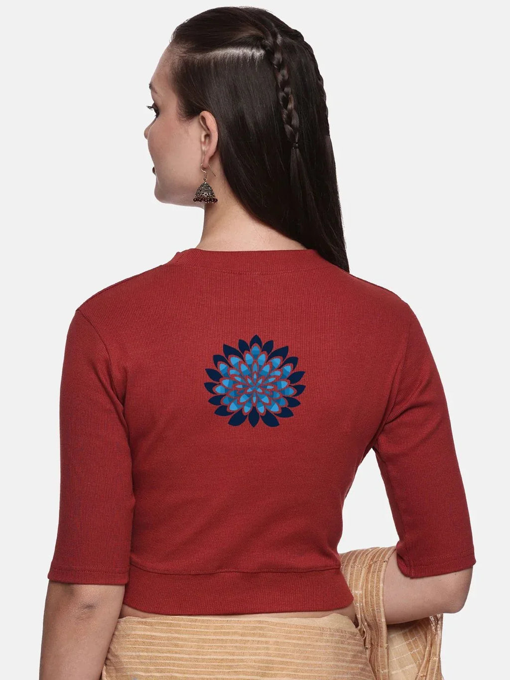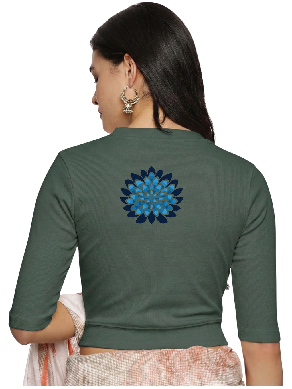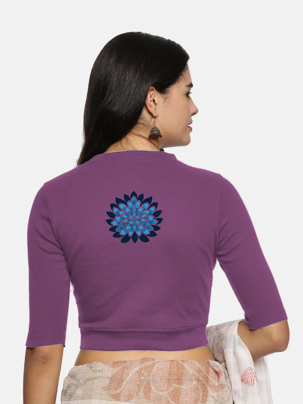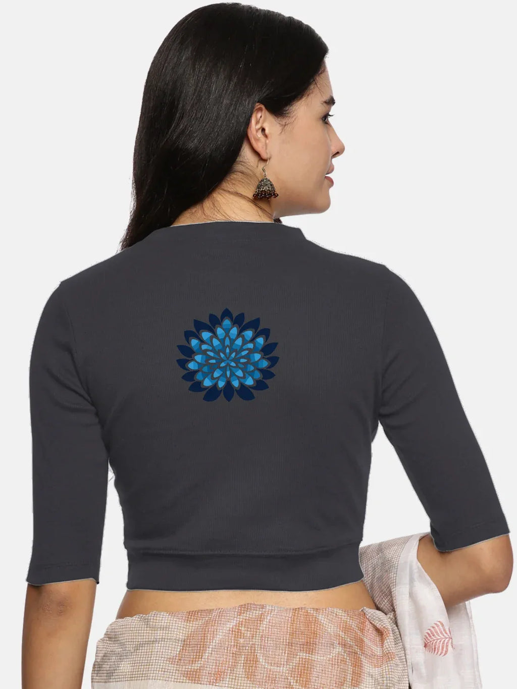RIB blouse with back print in  stretchable soft cotton, has a round neckline, sleeve length till the elbow. The blouse has a Rib double fold band at waist bottom to avoid spillage