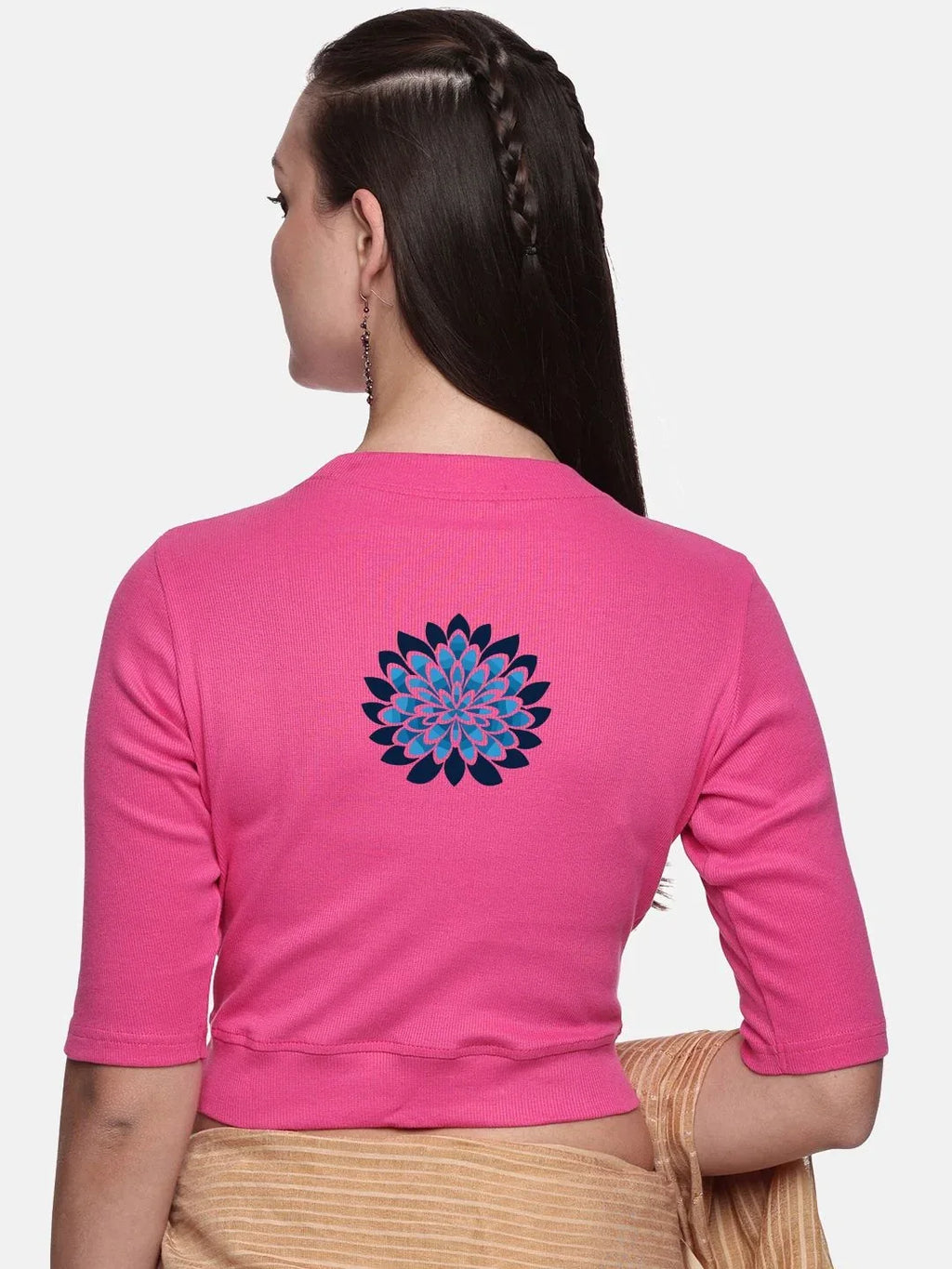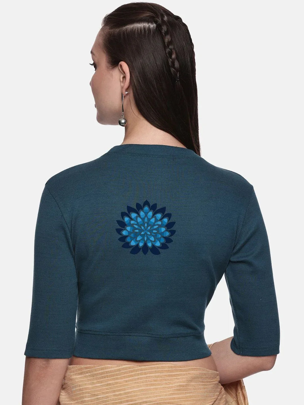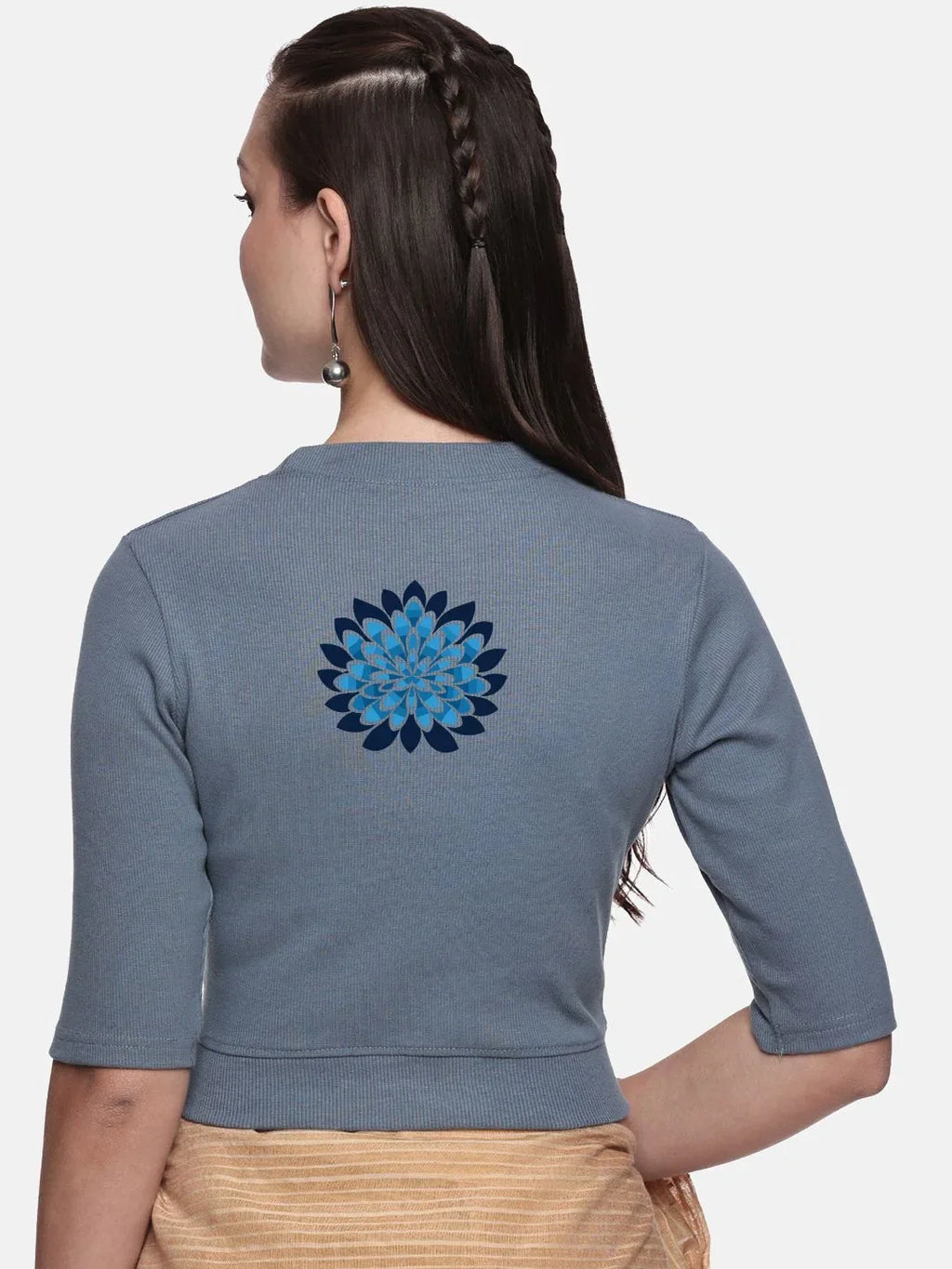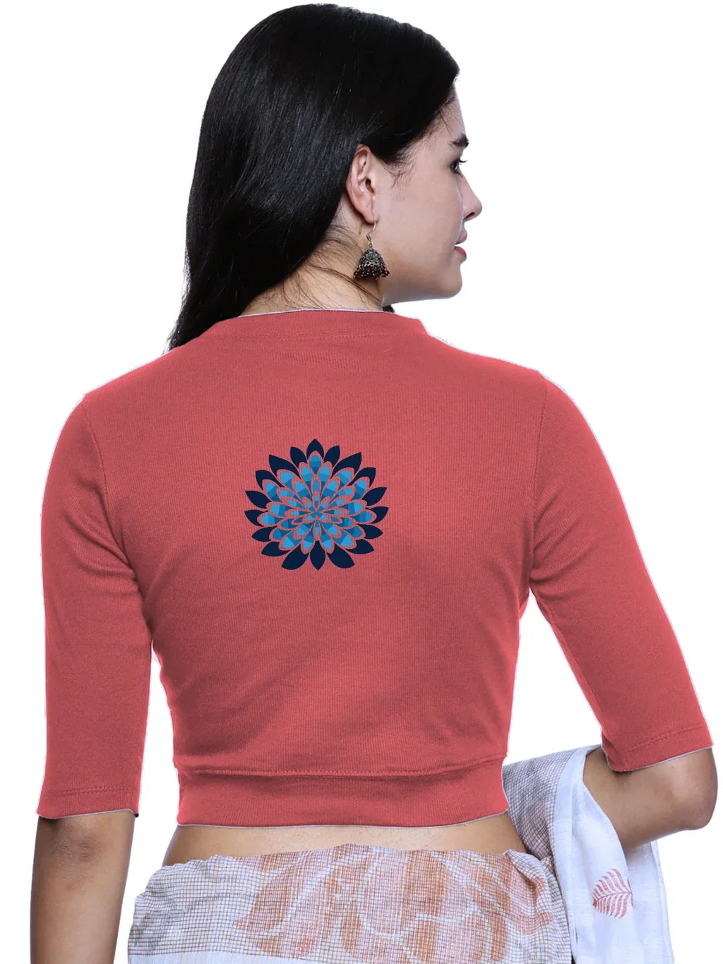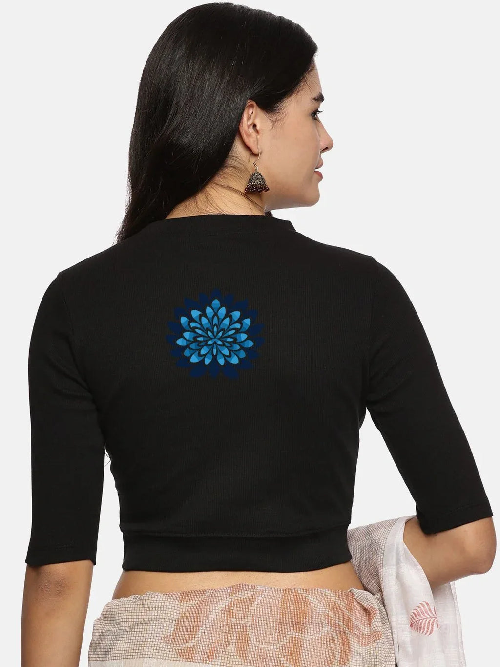 RIB blouse with back print in  stretchable soft cotton, has a round neckline, sleeve length till the elbow. The blouse has a Rib double fold band at waist bottom to avoid spillage