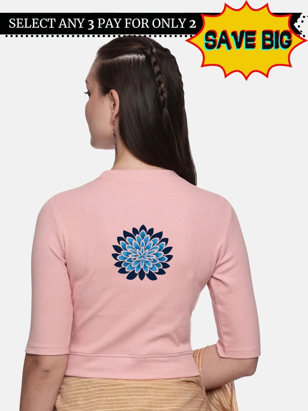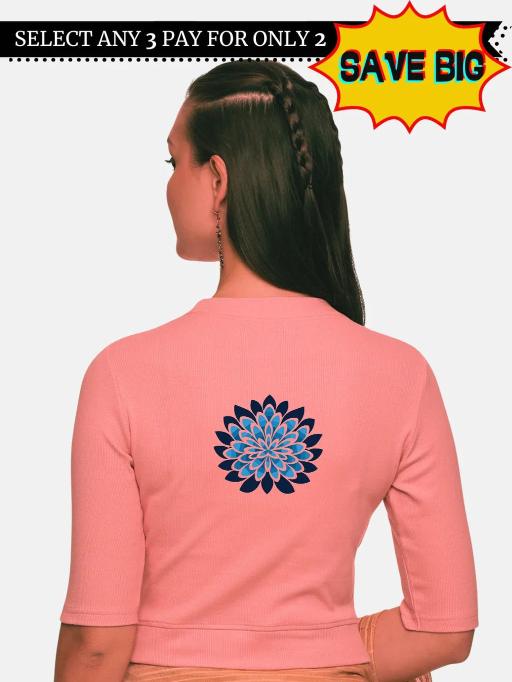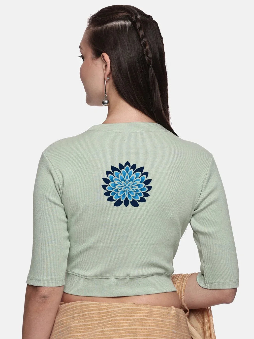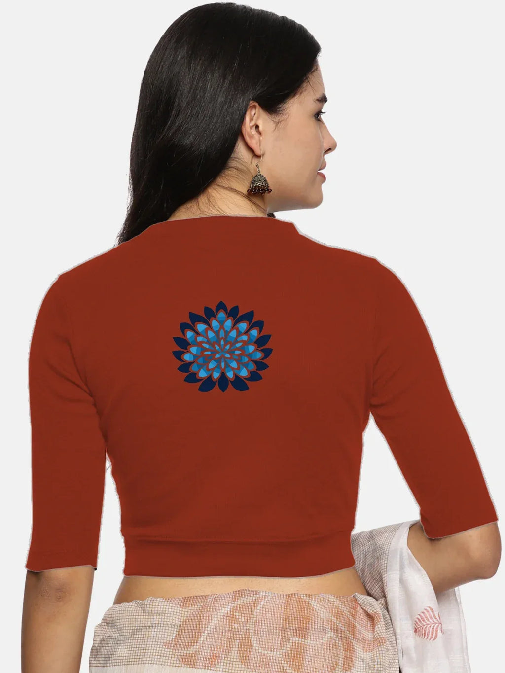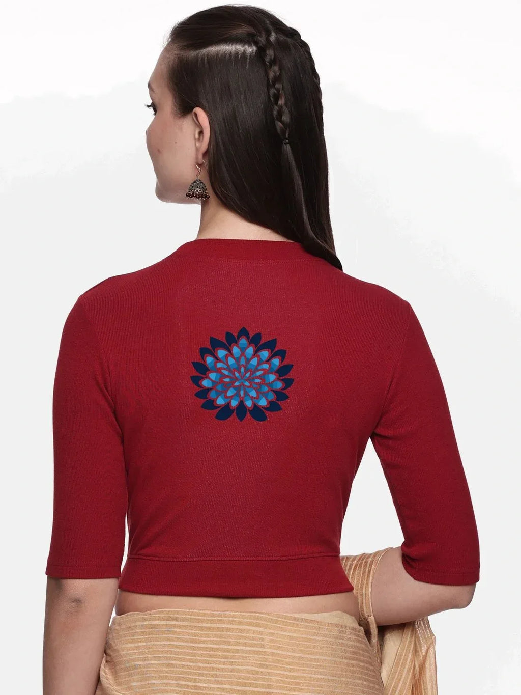 RIB blouse with back print in  stretchable soft cotton, has a round neckline, sleeve length till the elbow. The blouse has a Rib double fold band at waist bottom to avoid spillage