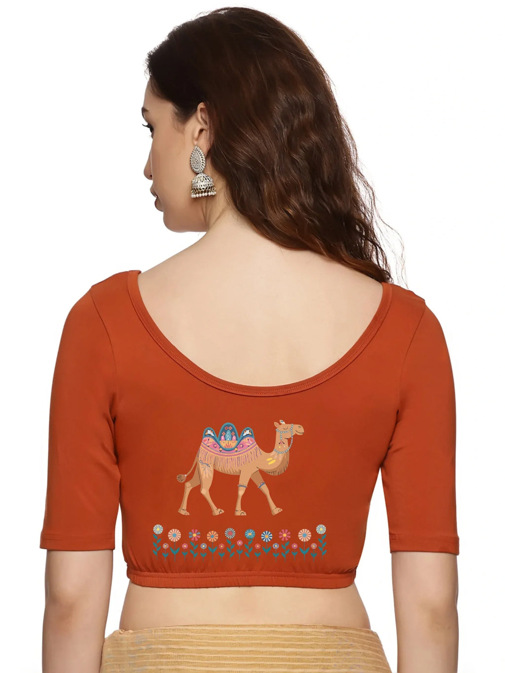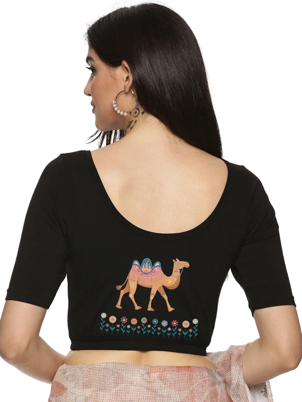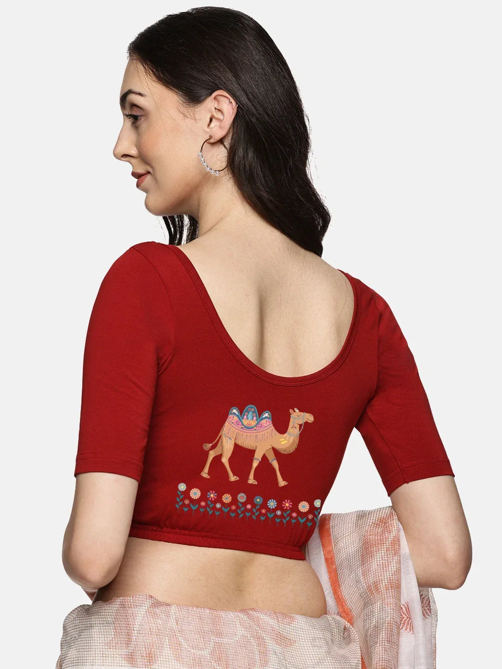 Solid blouse with back print in stretchable soft cotton, has a round neckline, has 2 front darts for best fitting, sleeve length till the elbow. The blouse has an elasticated bottom to avoid spillage