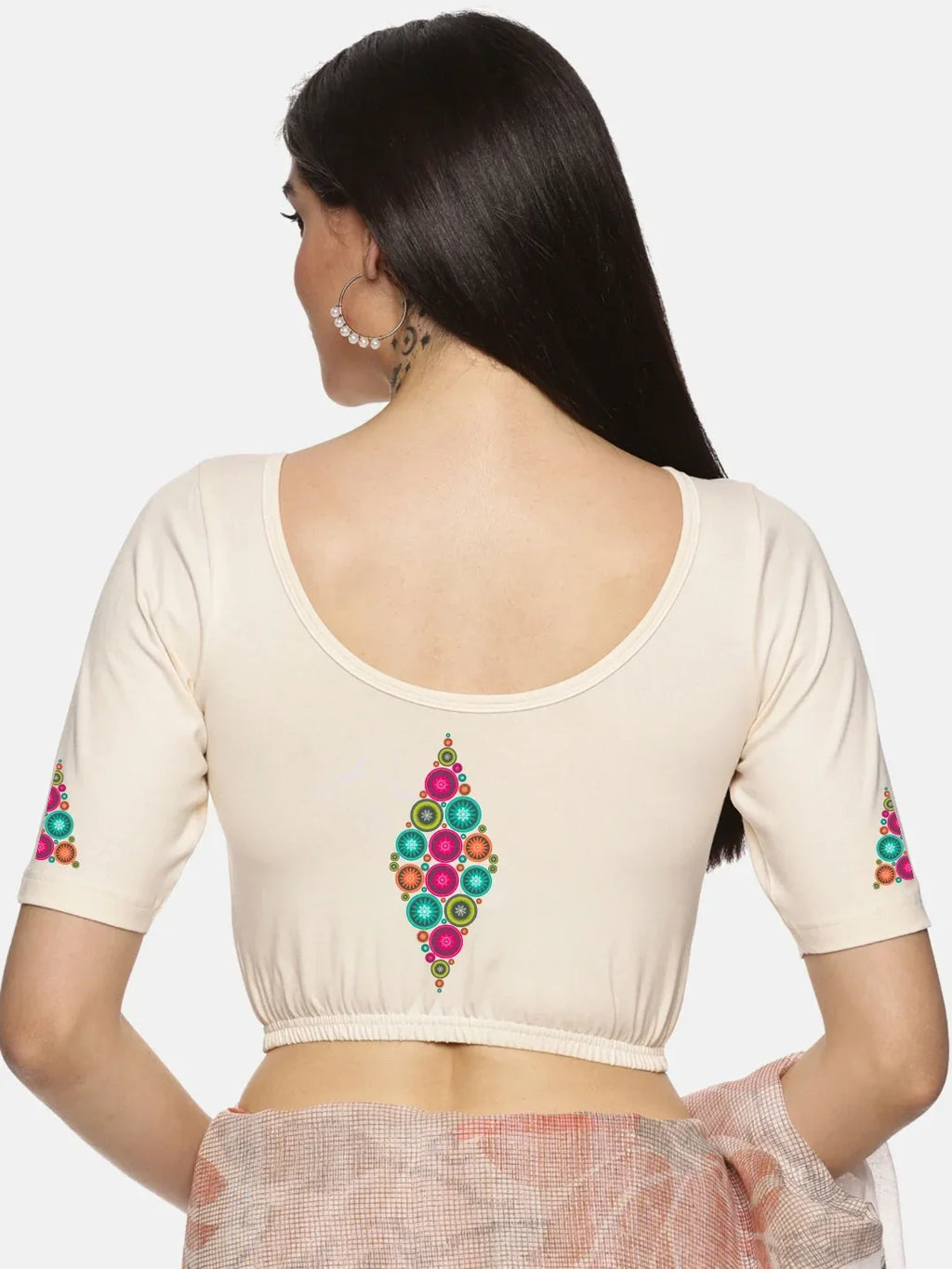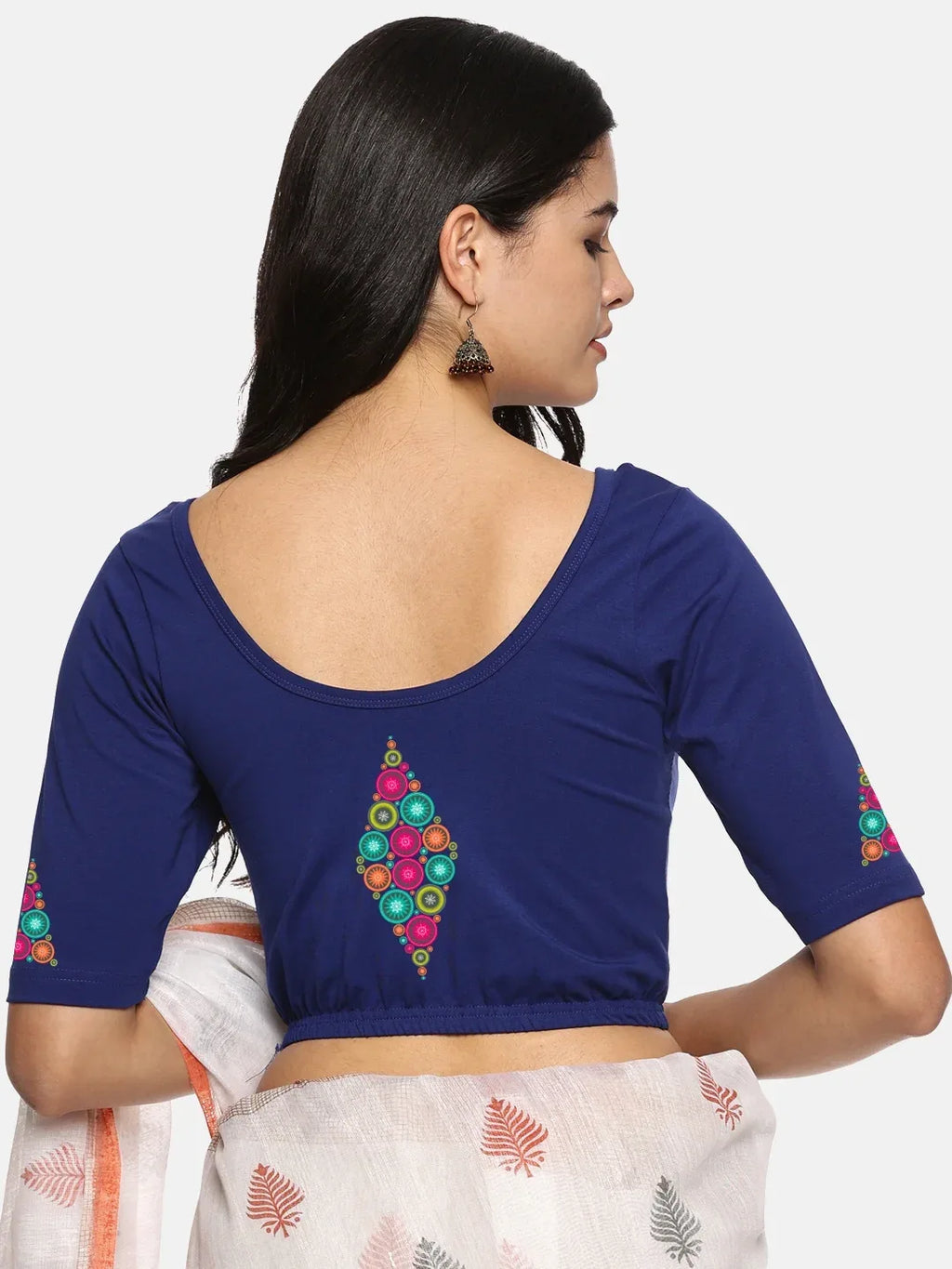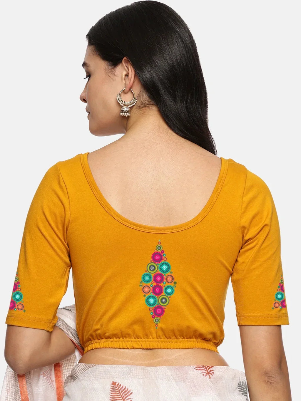Solid blouse with back print in stretchable soft cotton, has a round neckline, has 2 front darts for best fitting, sleeve length till the elbow. The blouse has an elasticated bottom to avoid spillage