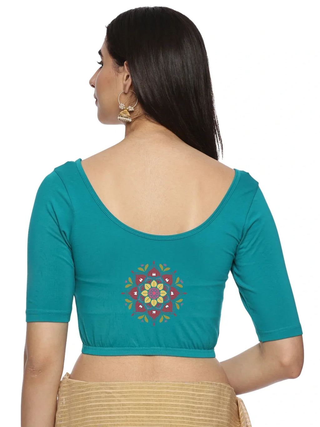 Solid blouse with back print in stretchable soft cotton, has a round neckline, has 2 front darts for best fitting, sleeve length till the elbow. The blouse has an elasticated bottom to avoid spillage