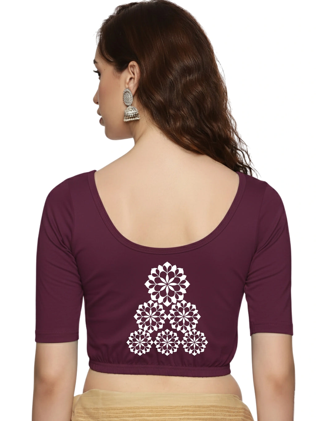 Solid blouse with back print in stretchable soft cotton, has a round neckline, has 2 front darts for best fitting, sleeve length till the elbow. The blouse has an elasticated bottom to avoid spillage