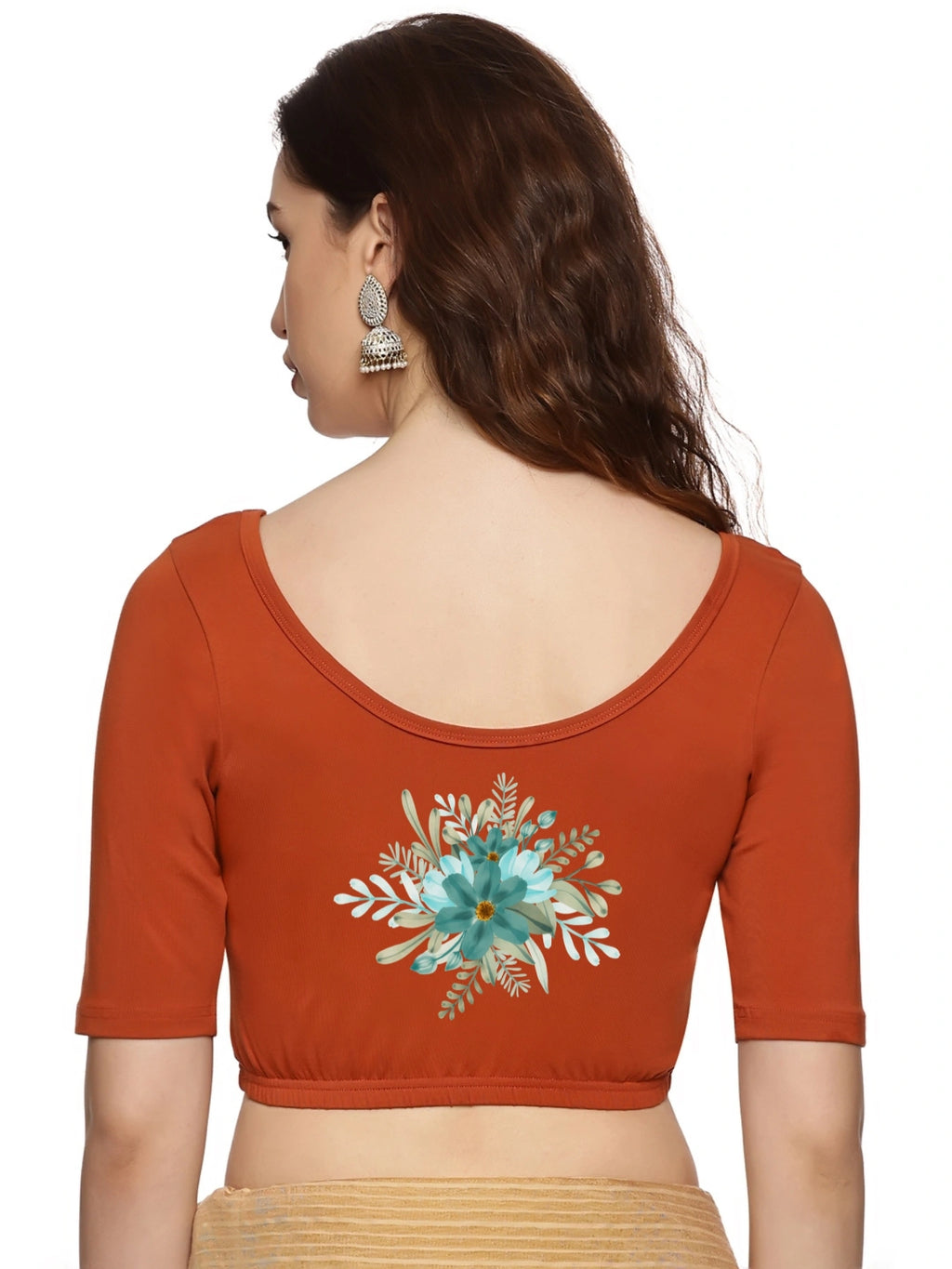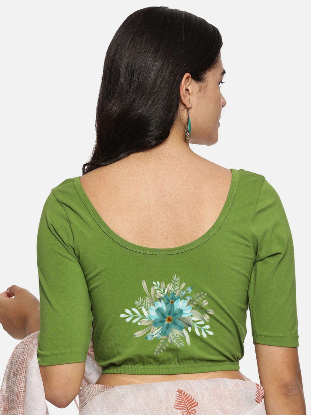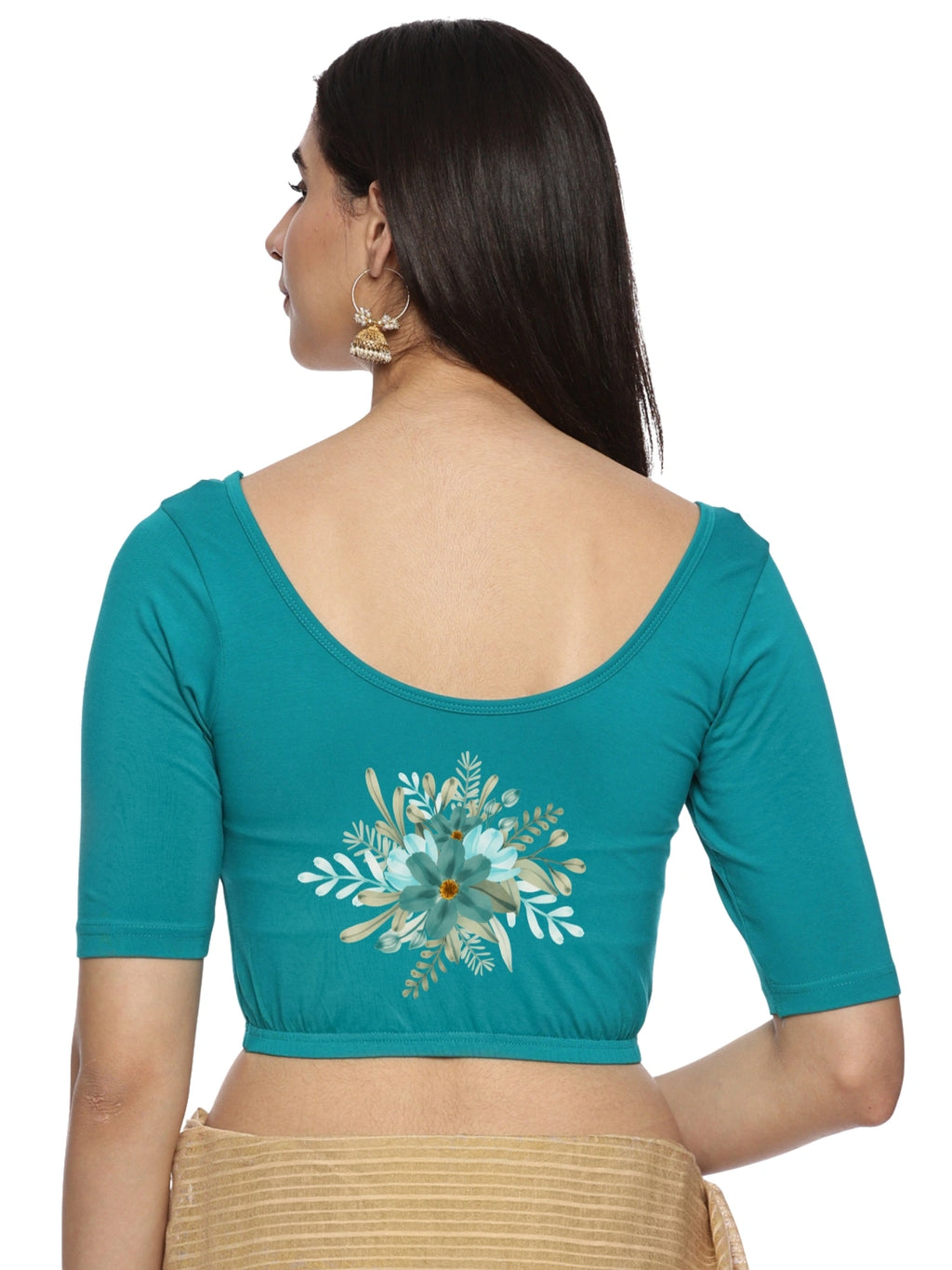 Solid blouse with back print in stretchable soft cotton, has a round neckline, has 2 front darts for best fitting, sleeve length till the elbow. The blouse has an elasticated bottom to avoid spillage