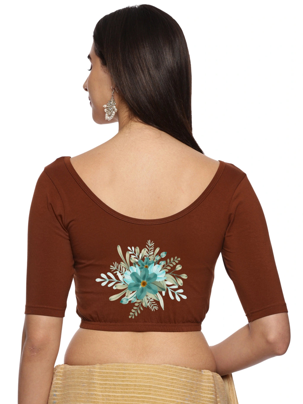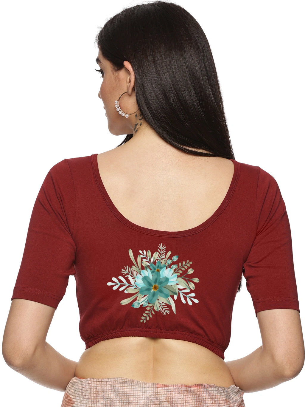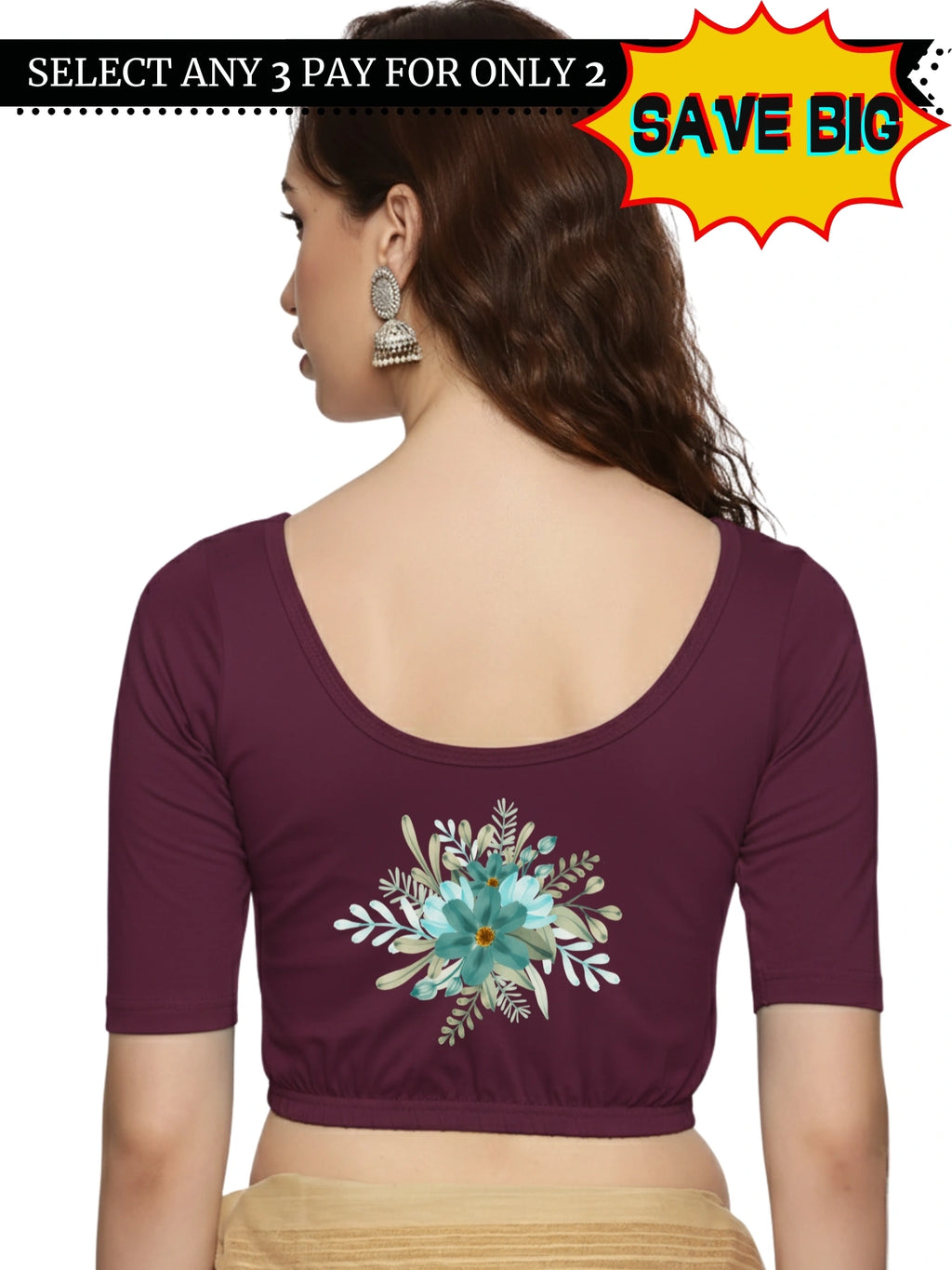 Solid blouse with back print in stretchable soft cotton, has a round neckline, has 2 front darts for best fitting, sleeve length till the elbow. The blouse has an elasticated bottom to avoid spillage