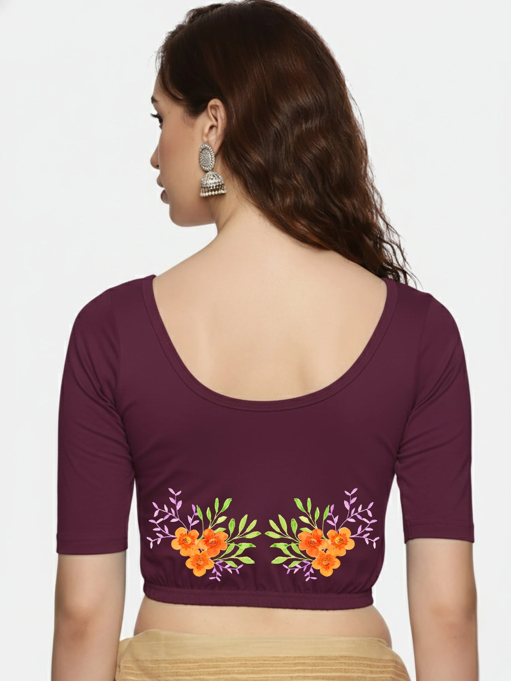 Solid blouse with back print in stretchable soft cotton, has a round neckline, has 2 front darts for best fitting, sleeve length till the elbow. The blouse has an elasticated bottom to avoid spillage