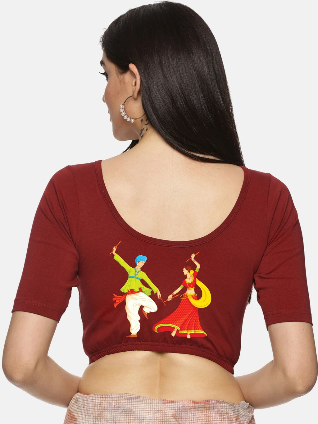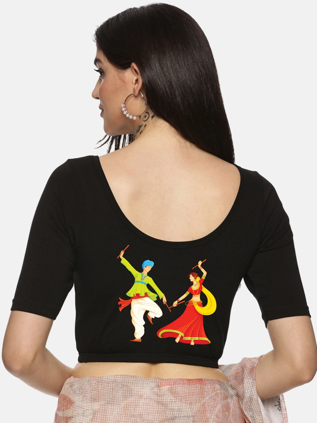 Solid blouse with back print in stretchable soft cotton, has a round neckline, has 2 front darts for best fitting, sleeve length till the elbow. The blouse has an elasticated bottom to avoid spillage