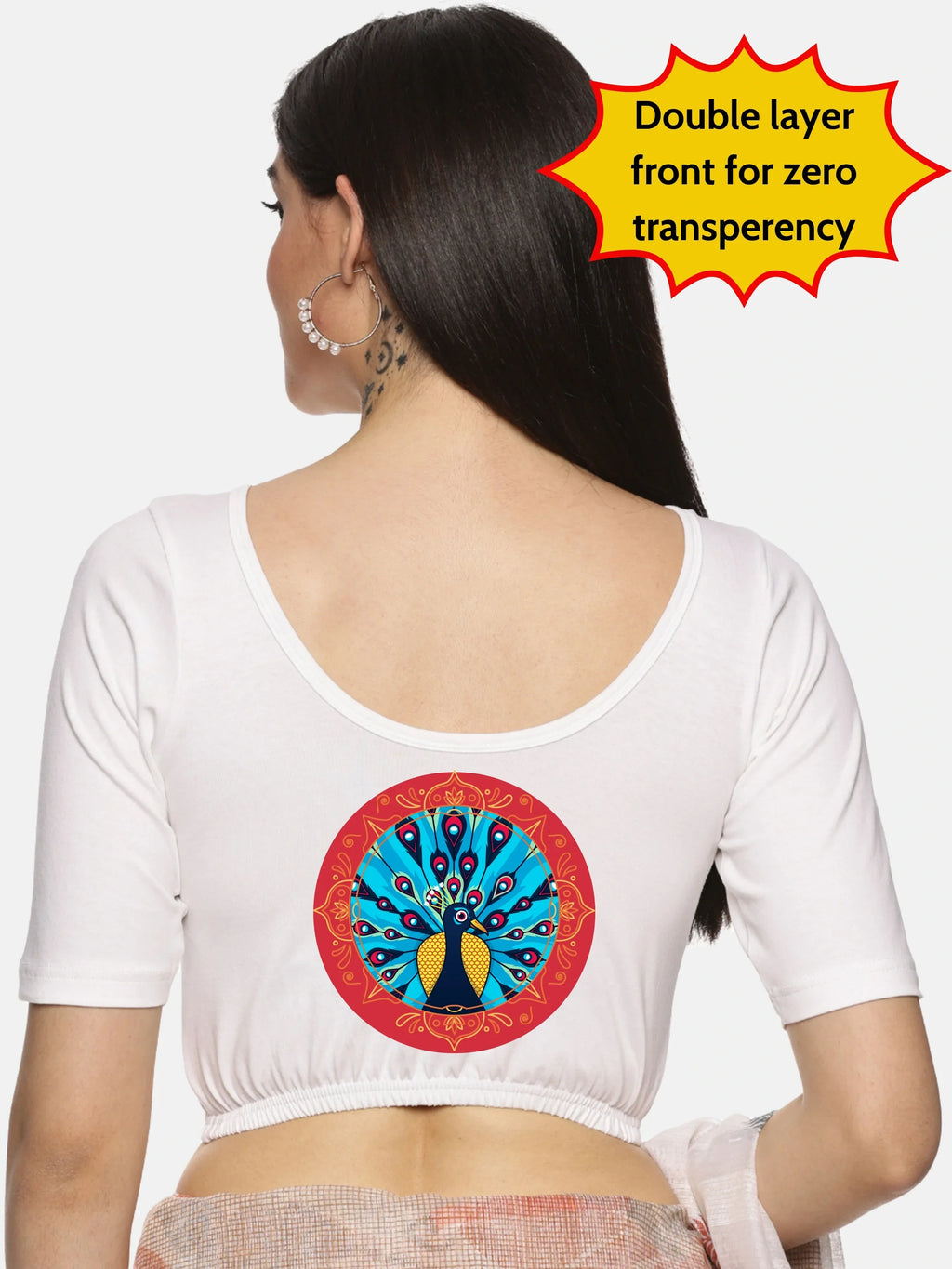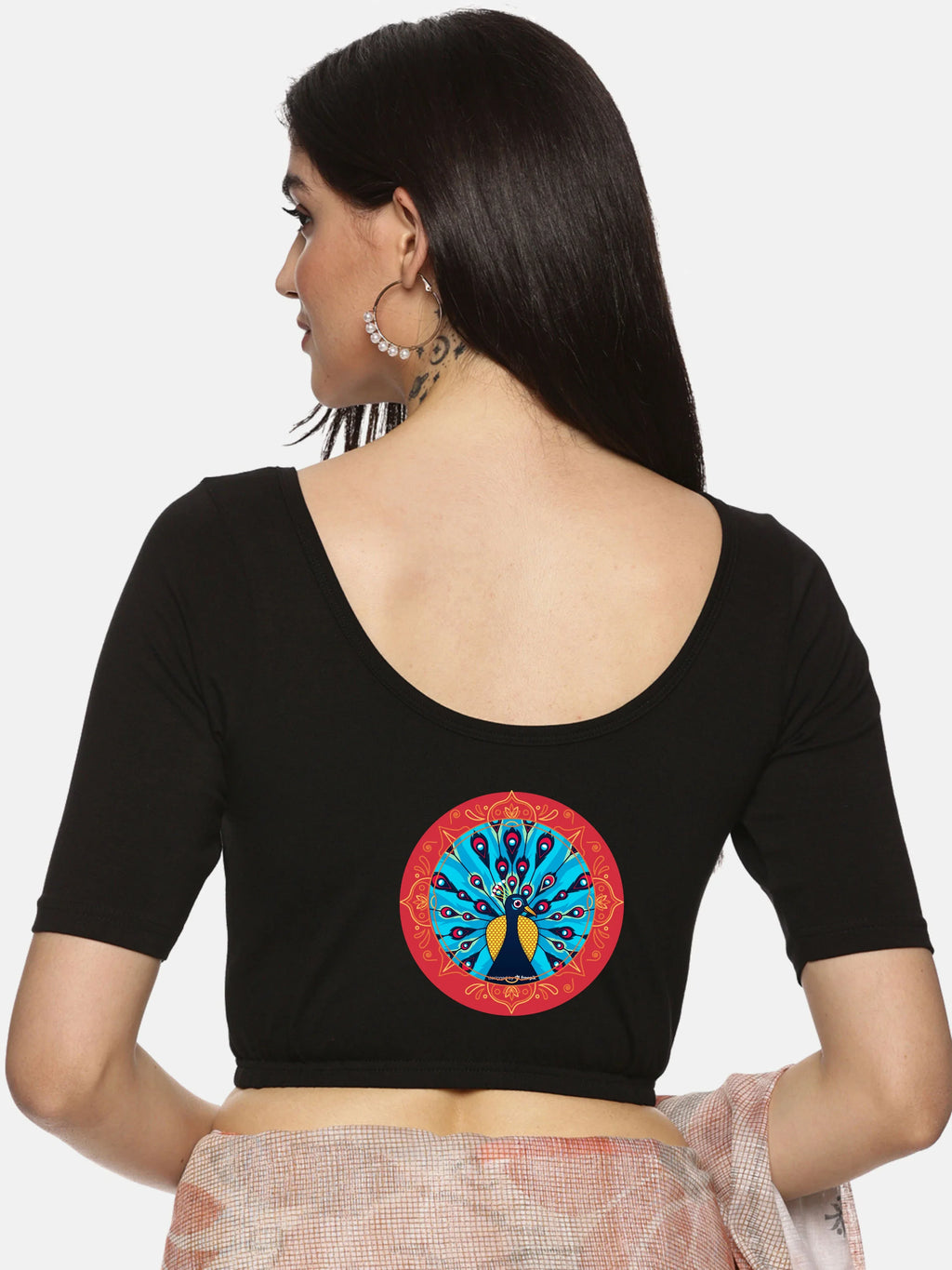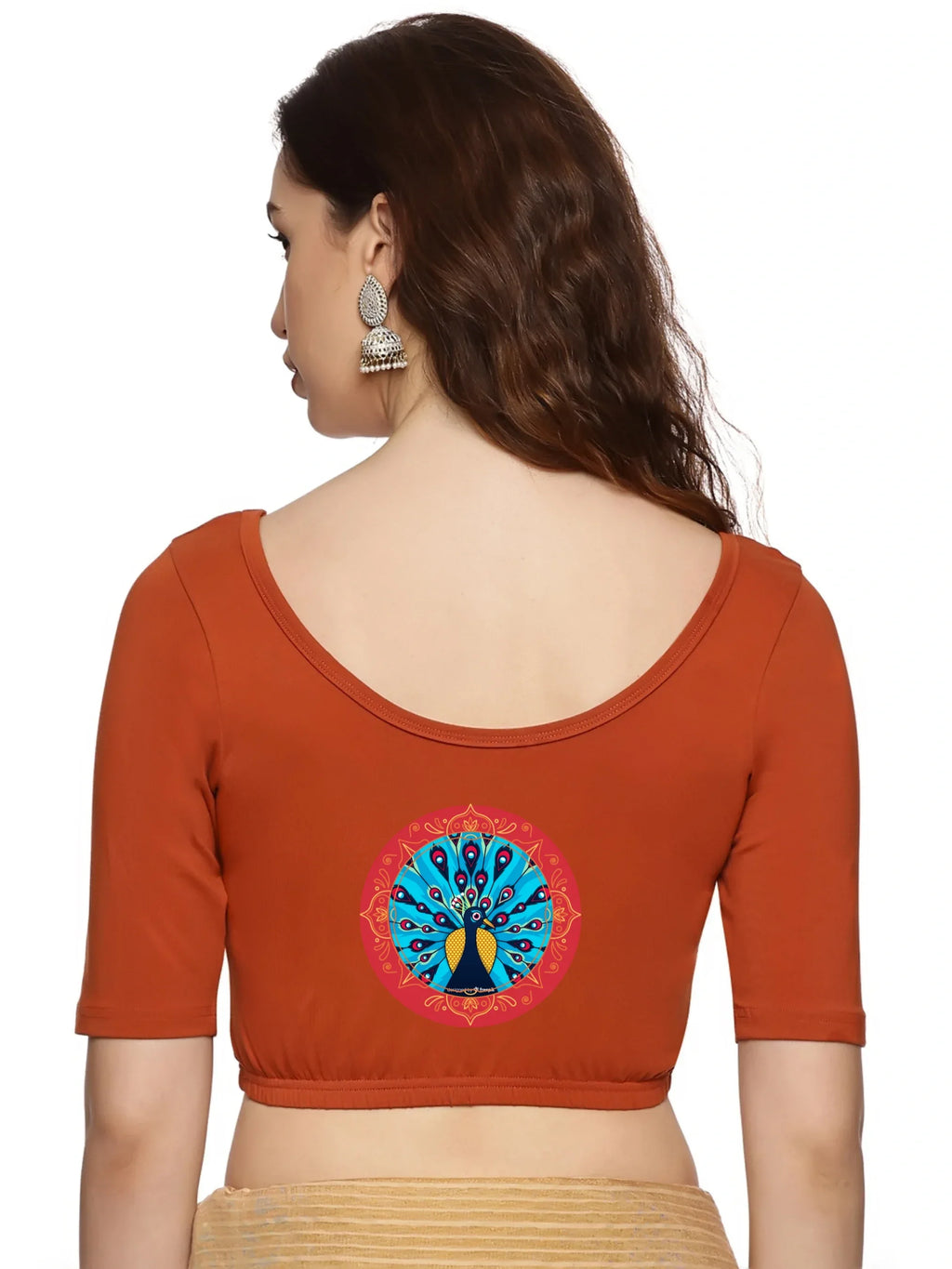 Solid blouse with back print in stretchable soft cotton, has a round neckline, has 2 front darts for best fitting, sleeve length till the elbow. The blouse has an elasticated bottom to avoid spillage