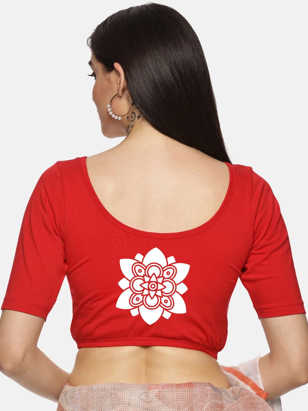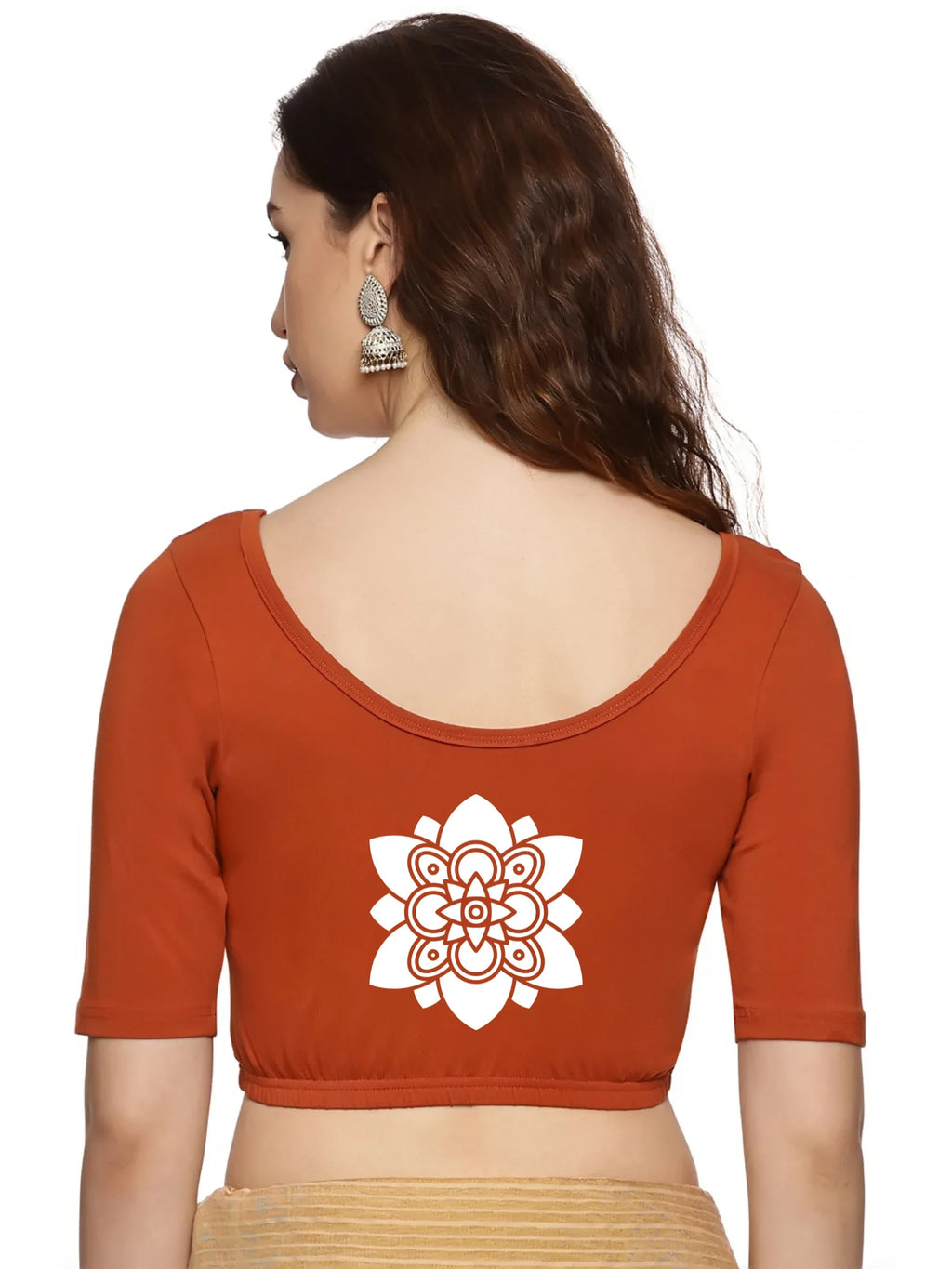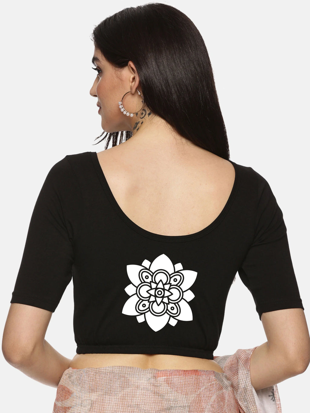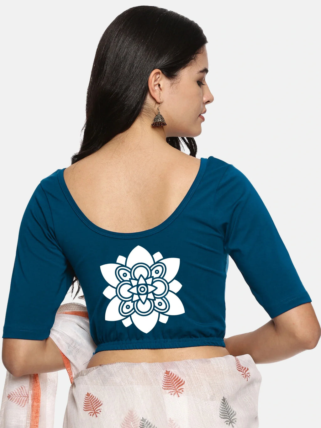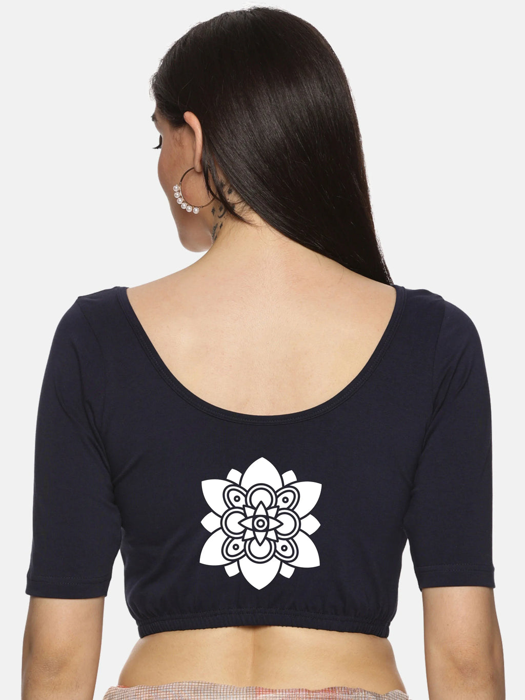 Solid blouse with back print in stretchable soft cotton, has a round neckline, has 2 front darts for best fitting, sleeve length till the elbow. The blouse has an elasticated bottom to avoid spillage