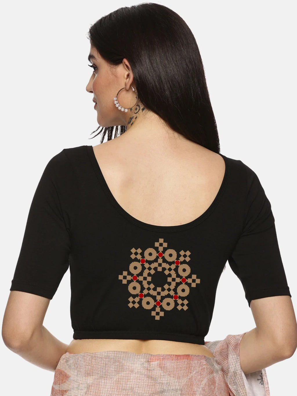 Solid blouse with back print in stretchable soft cotton, has a round neckline, has 2 front darts for best fitting, sleeve length till the elbow. The blouse has an elasticated bottom to avoid spillage