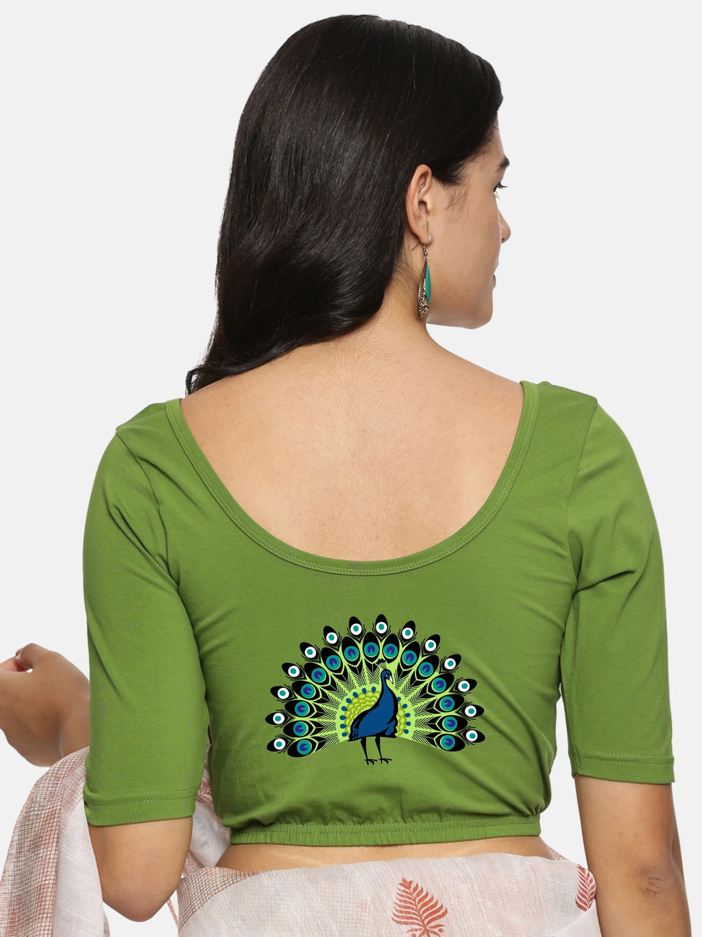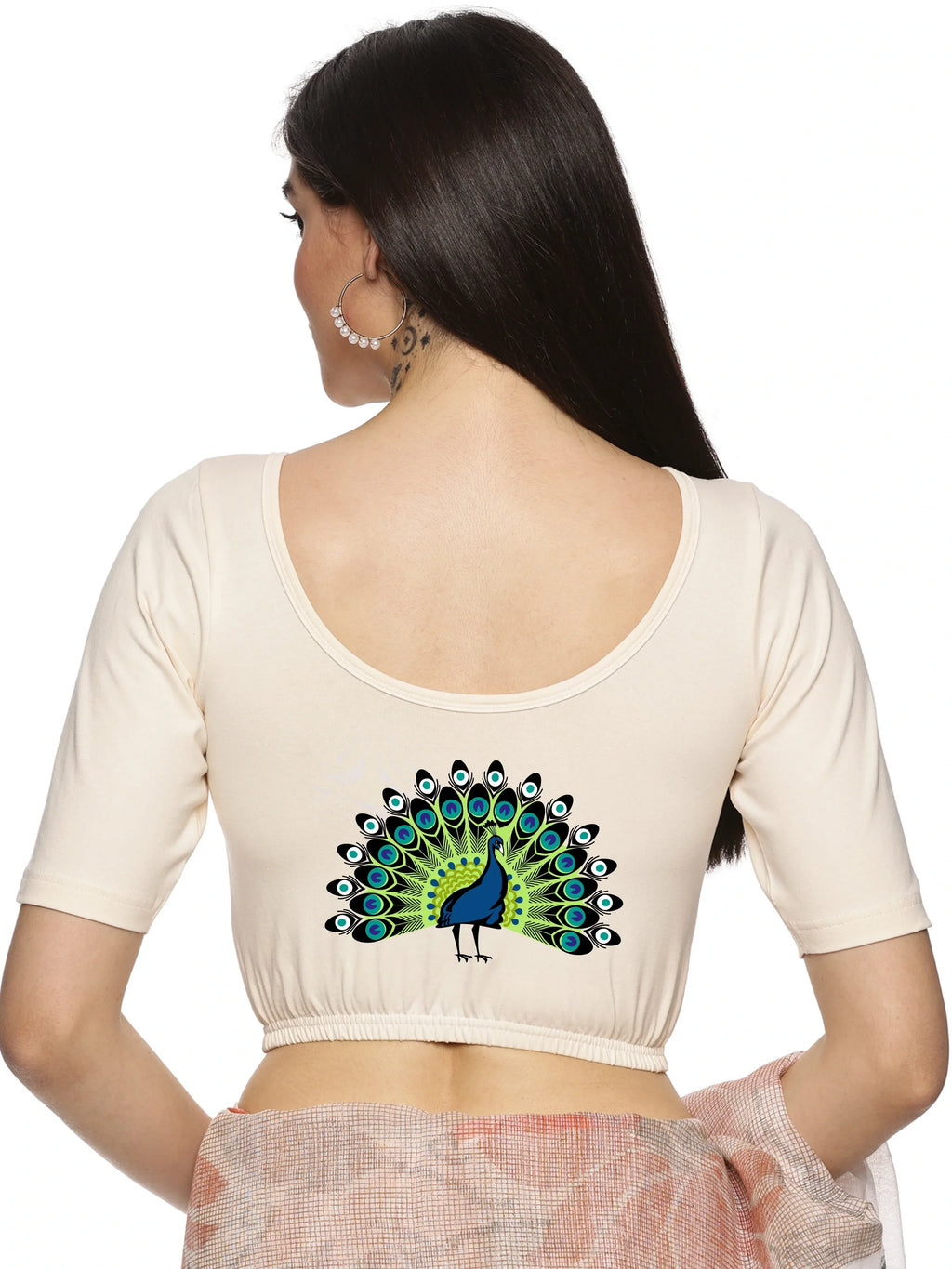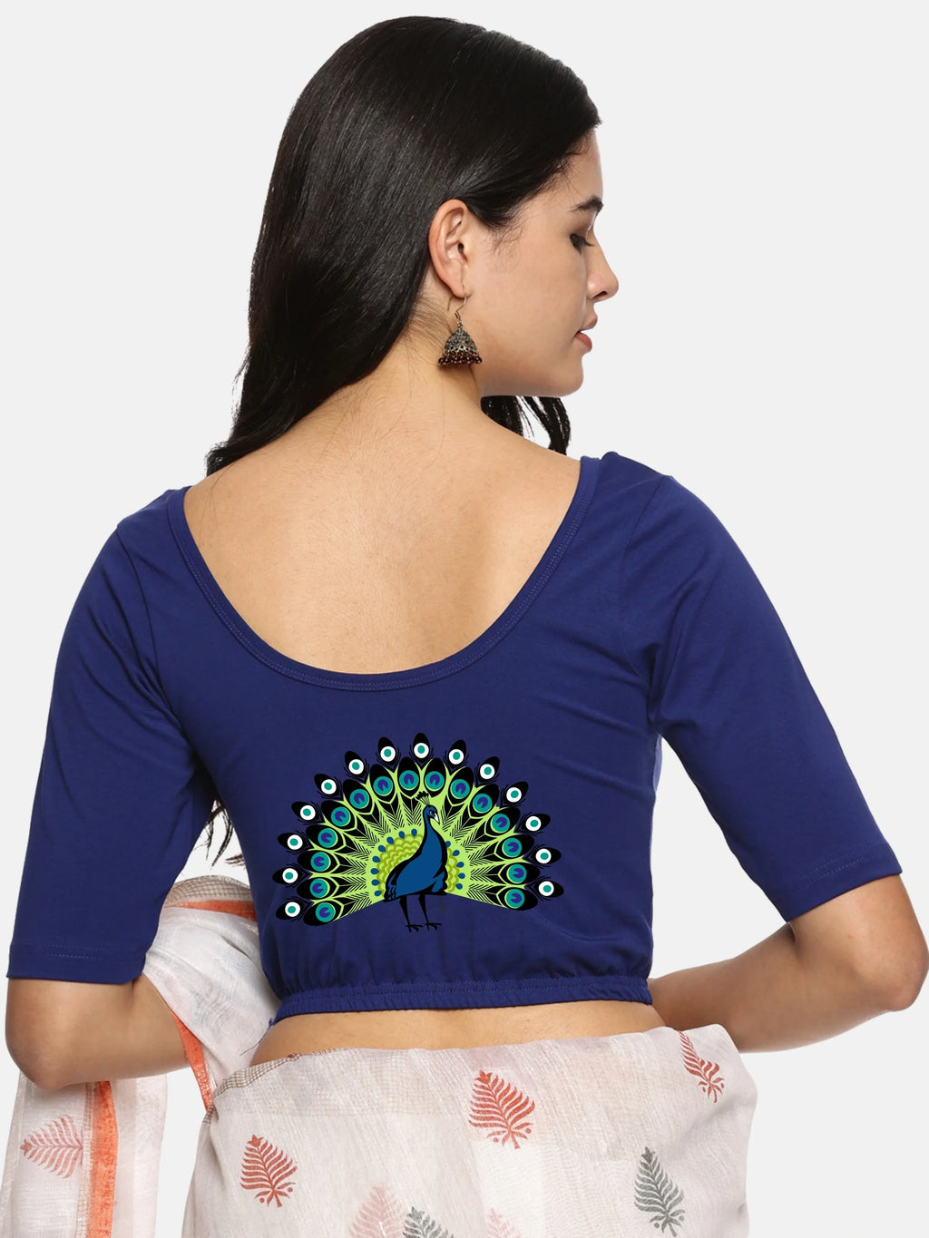 Solid blouse with back print in stretchable soft cotton, has a round neckline, has 2 front darts for best fitting, sleeve length till the elbow. The blouse has an elasticated bottom to avoid spillage