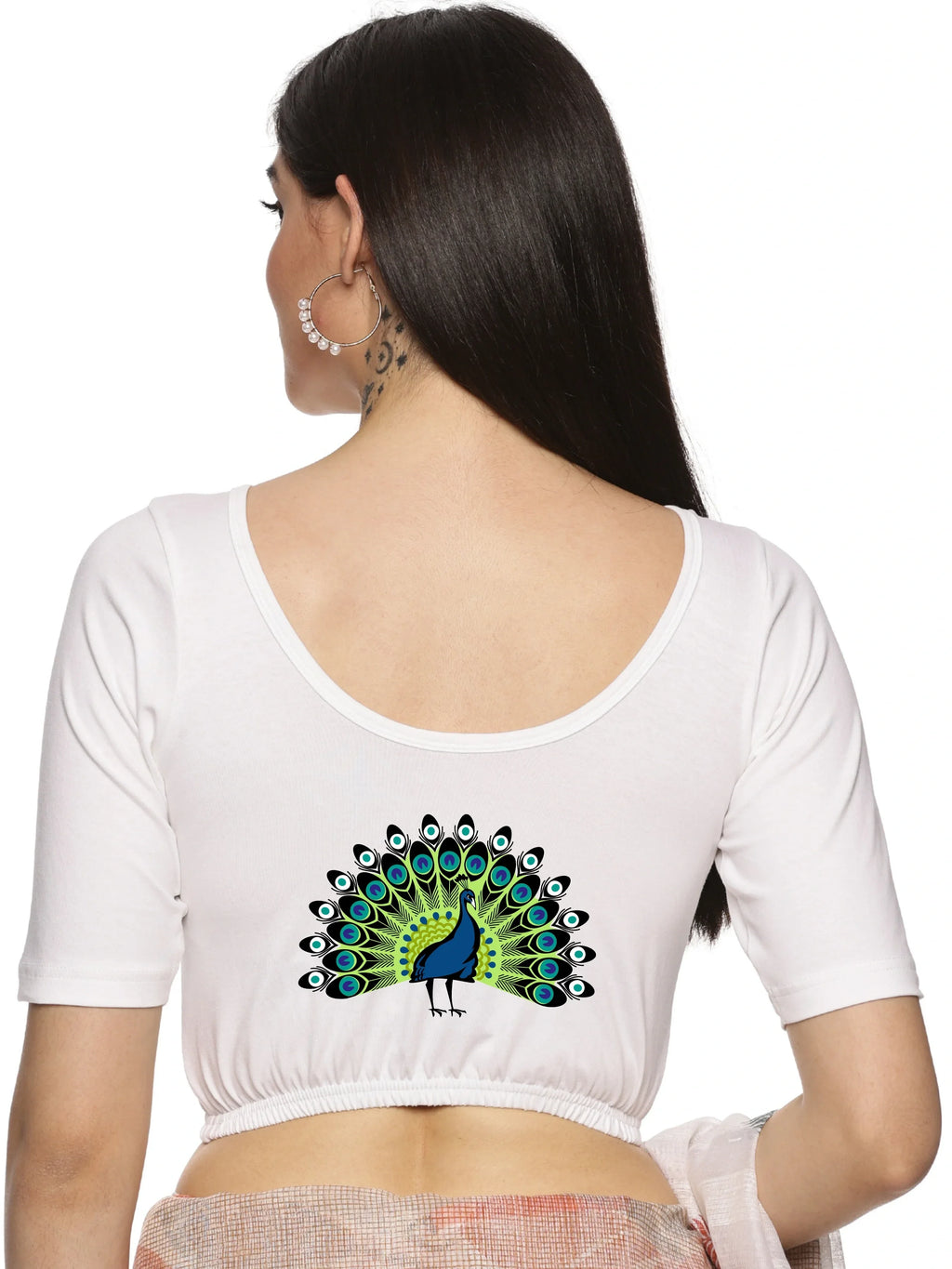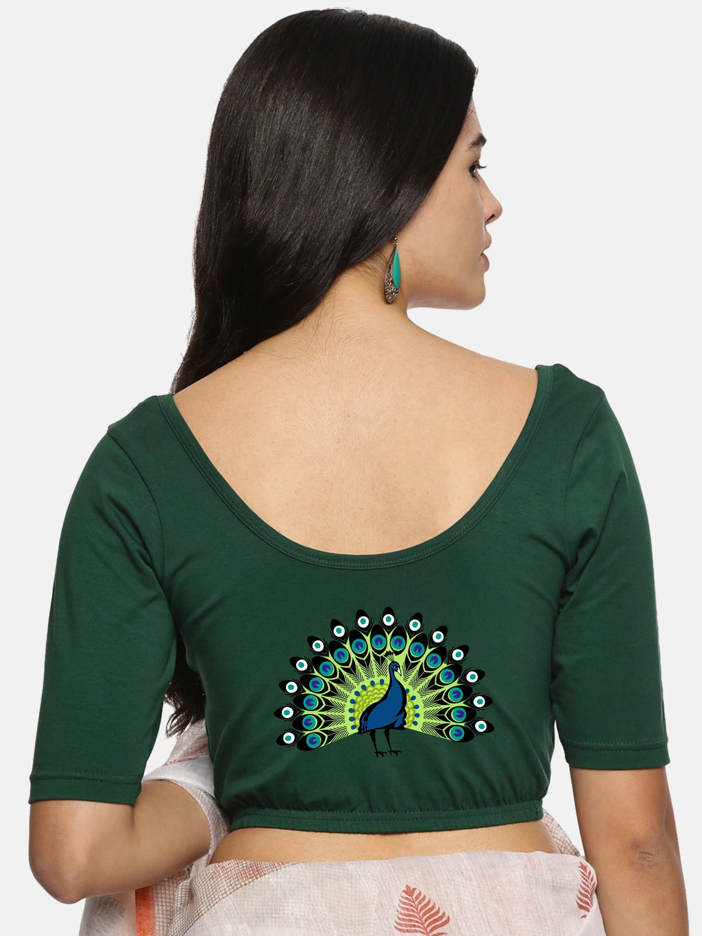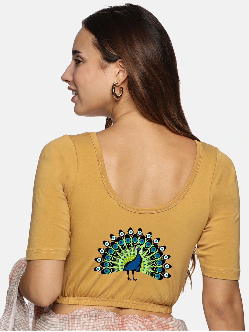 Solid blouse with back print in stretchable soft cotton, has a round neckline, has 2 front darts for best fitting, sleeve length till the elbow. The blouse has an elasticated bottom to avoid spillage