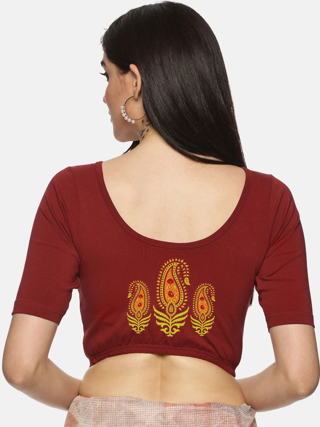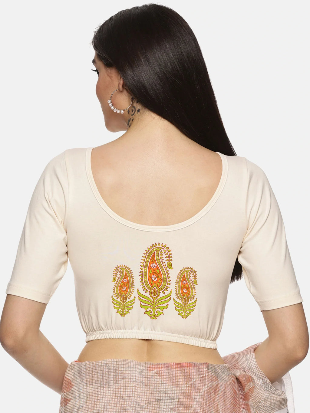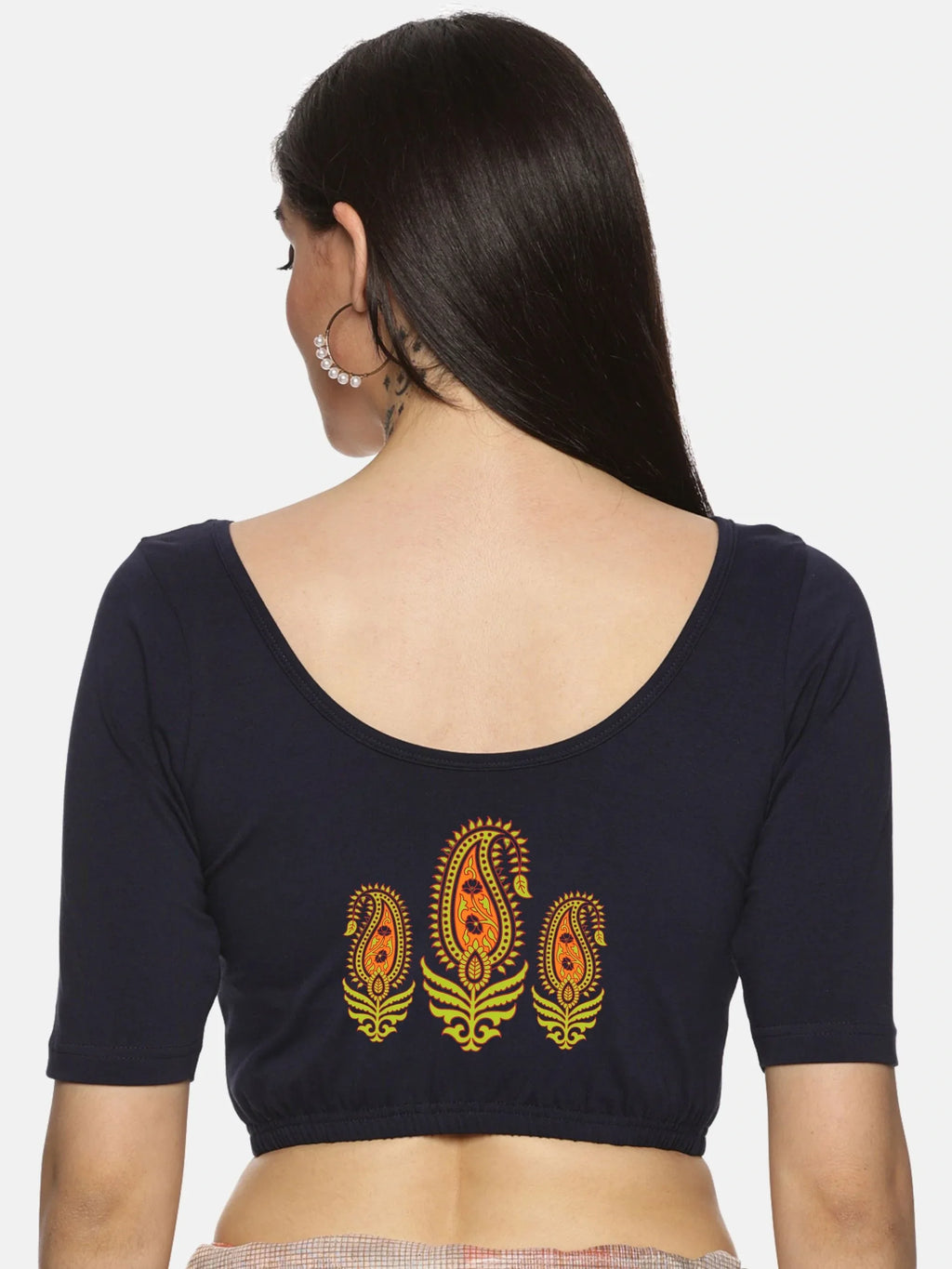 Solid blouse with back print in stretchable soft cotton, has a round neckline, has 2 front darts for best fitting, sleeve length till the elbow. The blouse has an elasticated bottom to avoid spillage