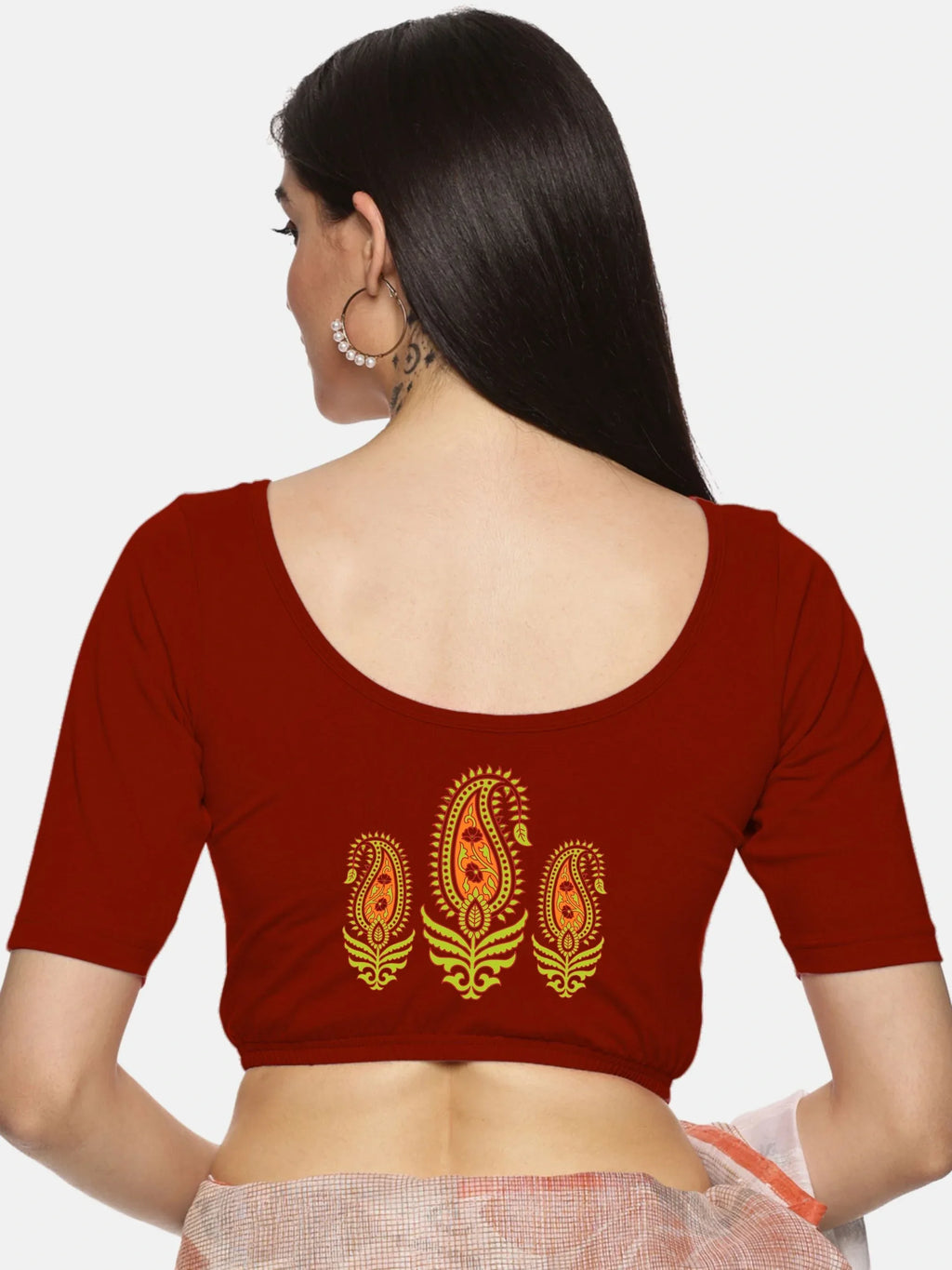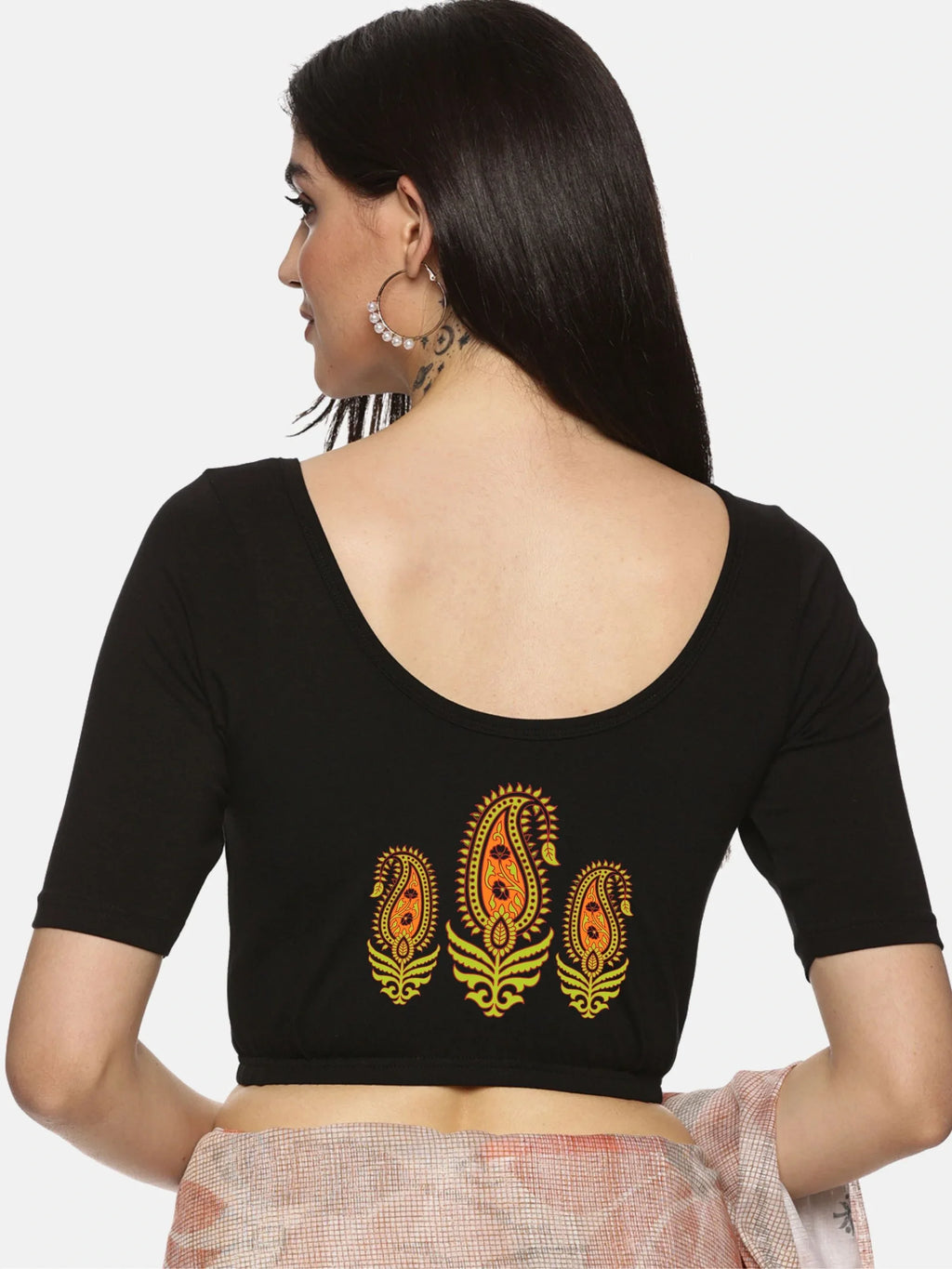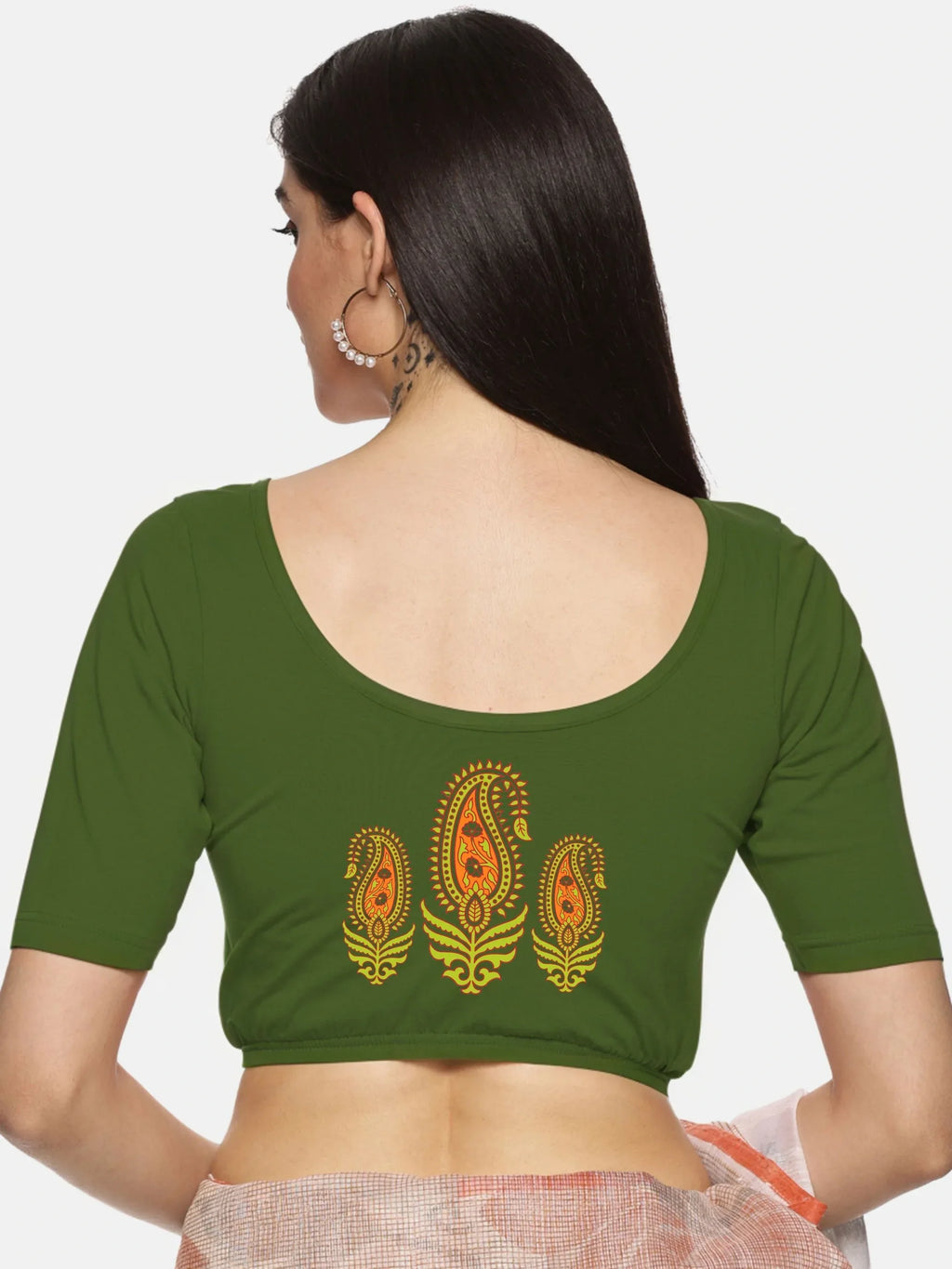 Solid blouse with back print in stretchable soft cotton, has a round neckline, has 2 front darts for best fitting, sleeve length till the elbow. The blouse has an elasticated bottom to avoid spillage