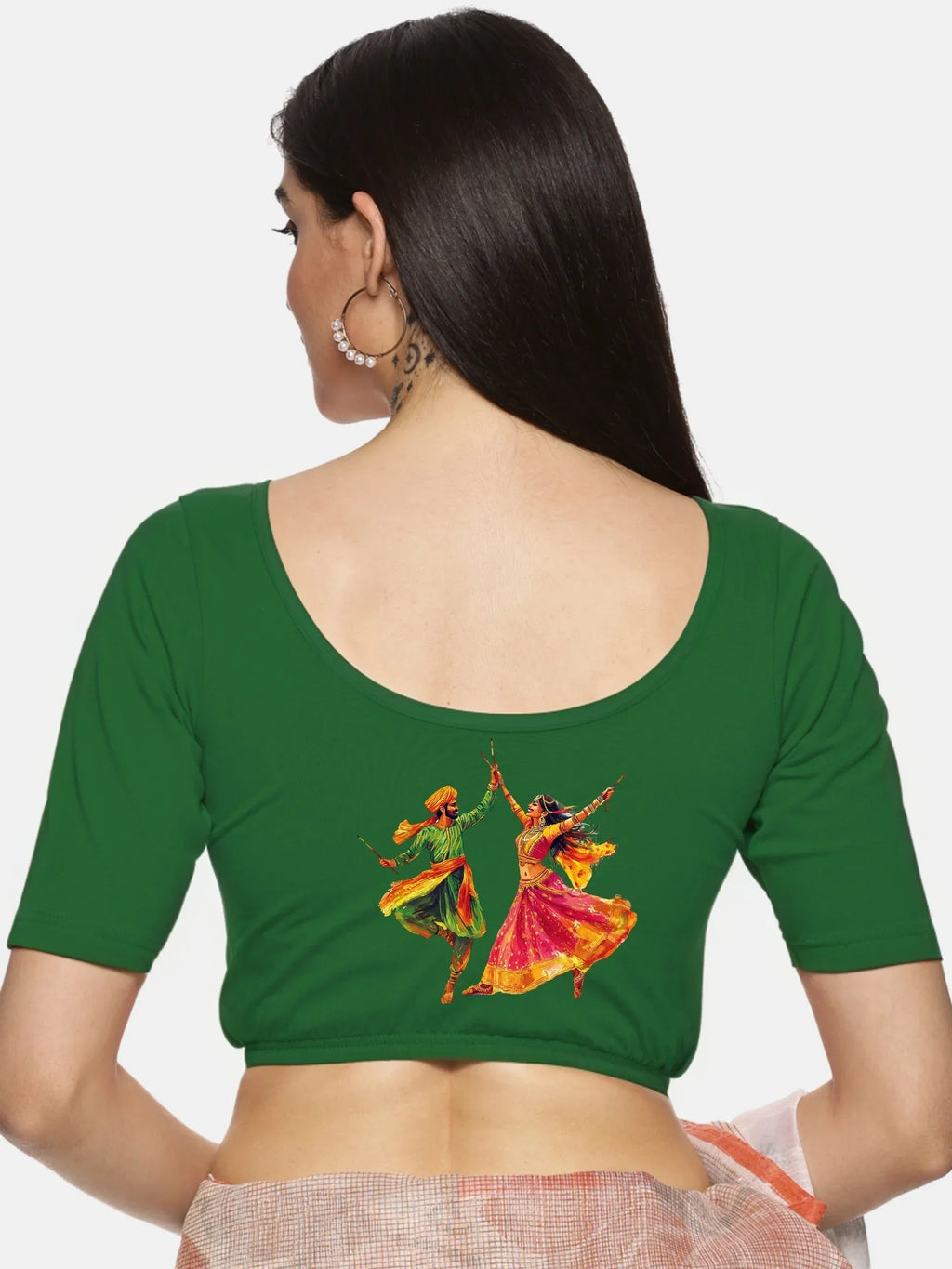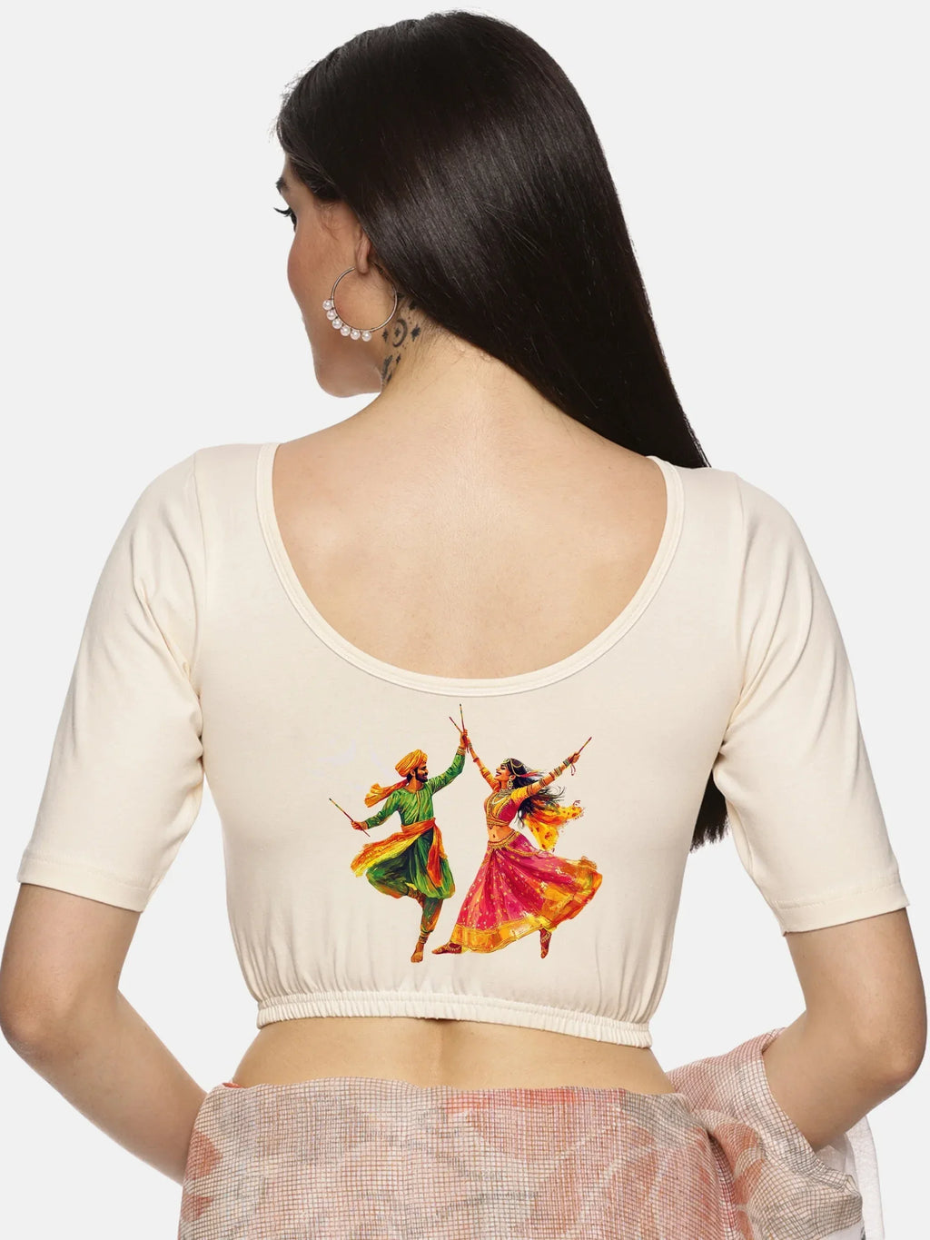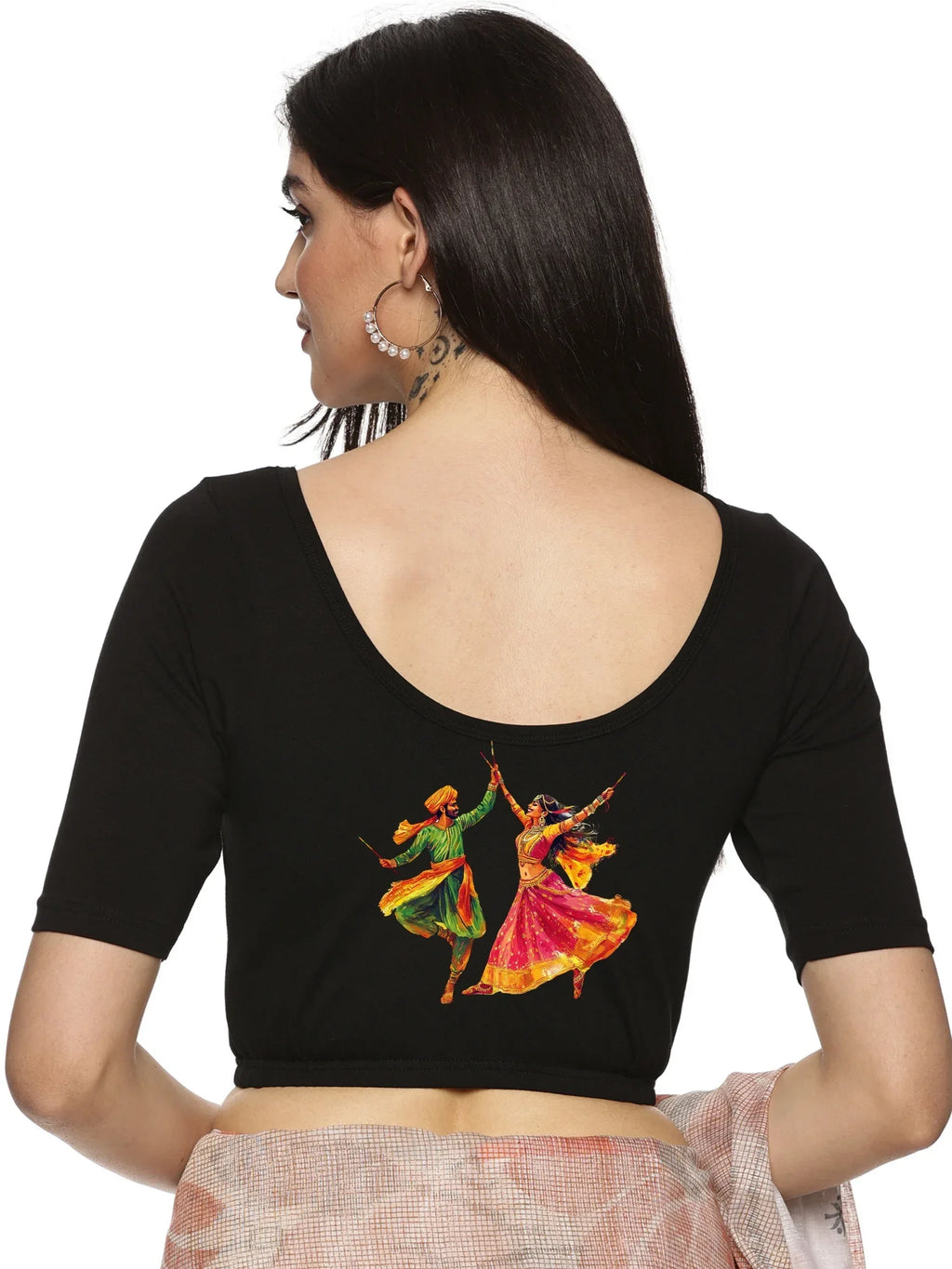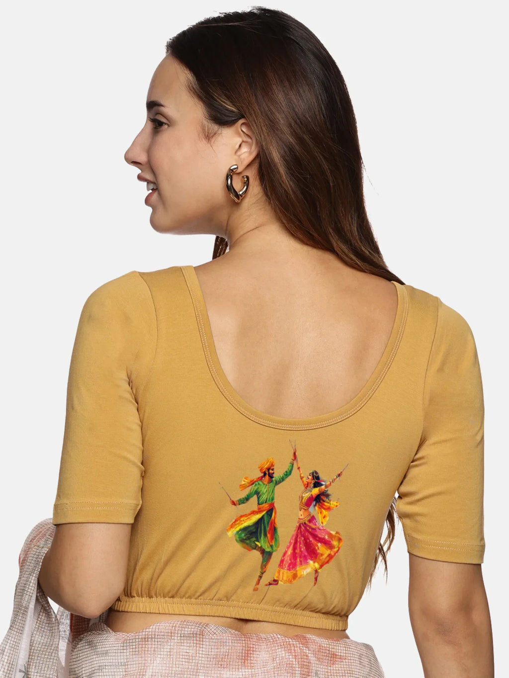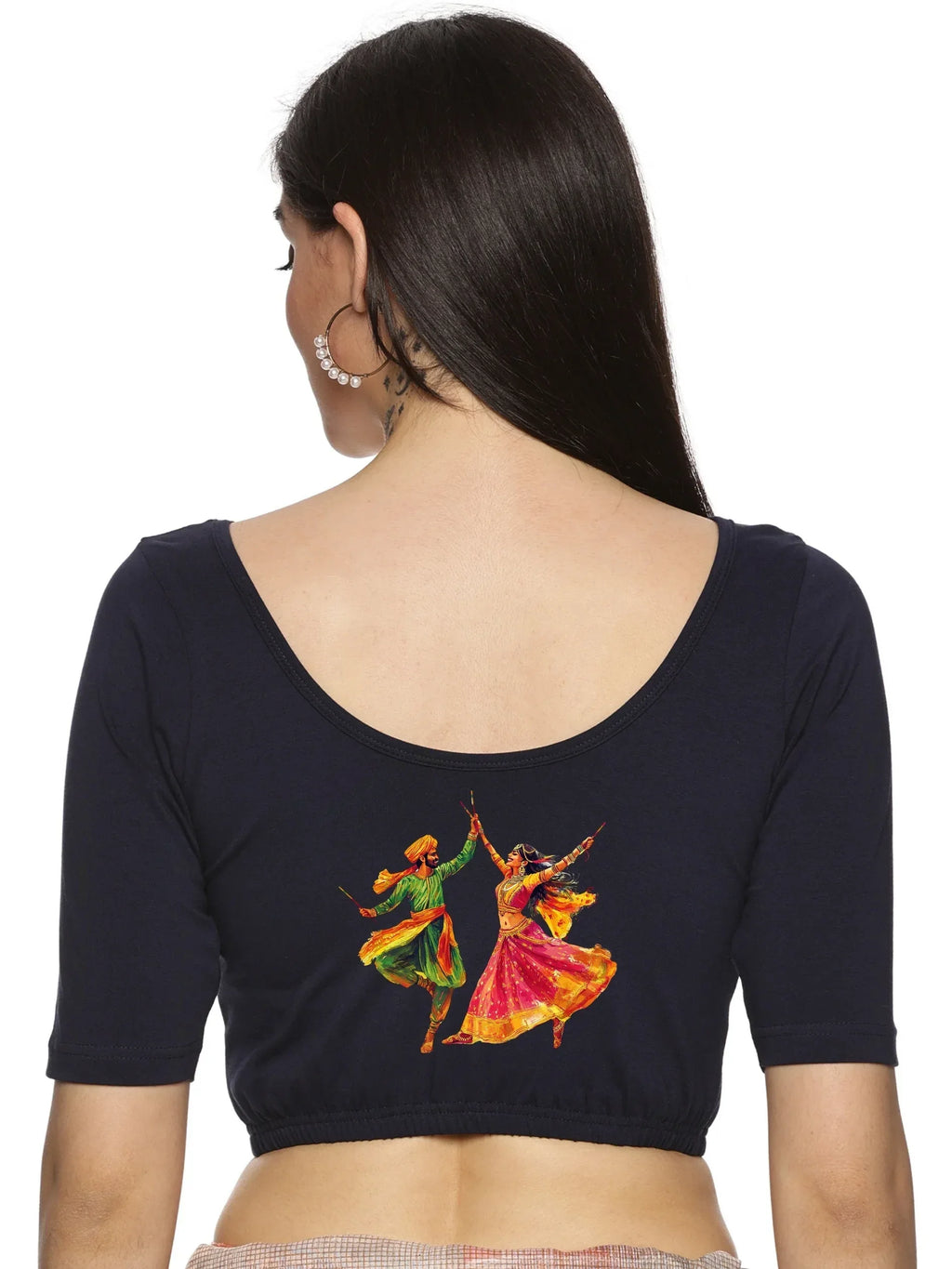 Solid blouse with back print in stretchable soft cotton, has a round neckline, has 2 front darts for best fitting, sleeve length till the elbow. The blouse has an elasticated bottom to avoid spillage