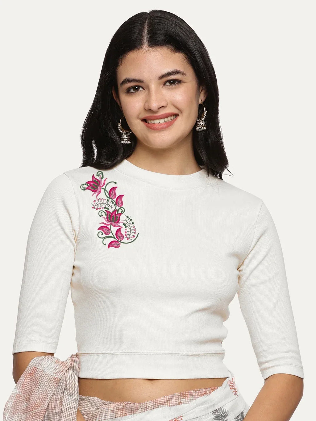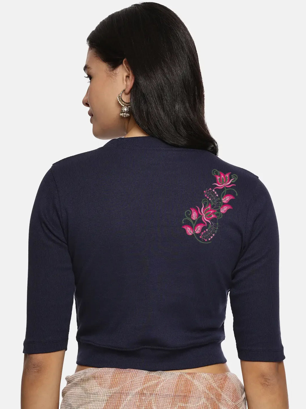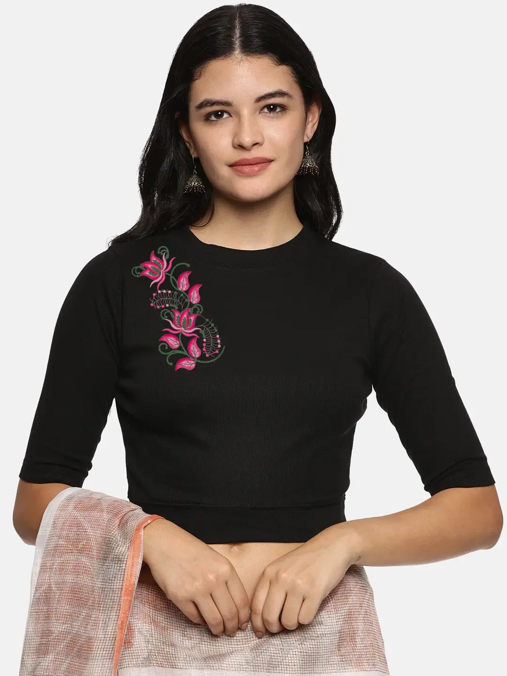 RIB blouse with back print in stretchable soft cotton, has a round neckline, sleeve length till the elbow. The blouse has a Rib double fold band at waist bottom to avoid spillage