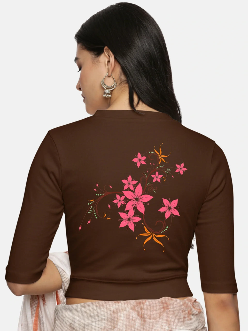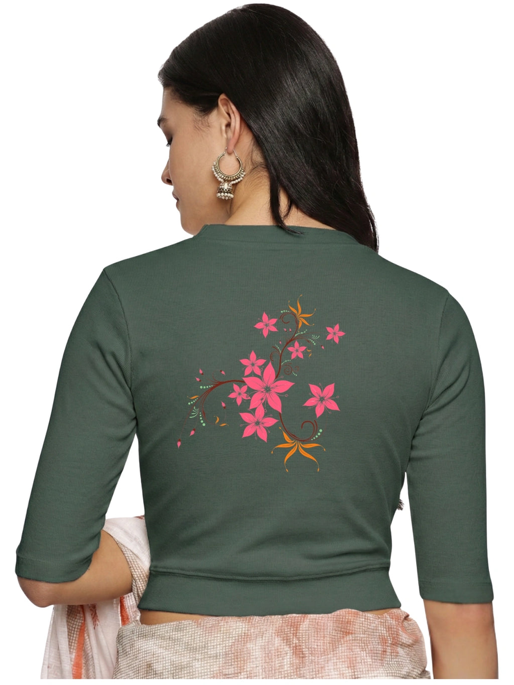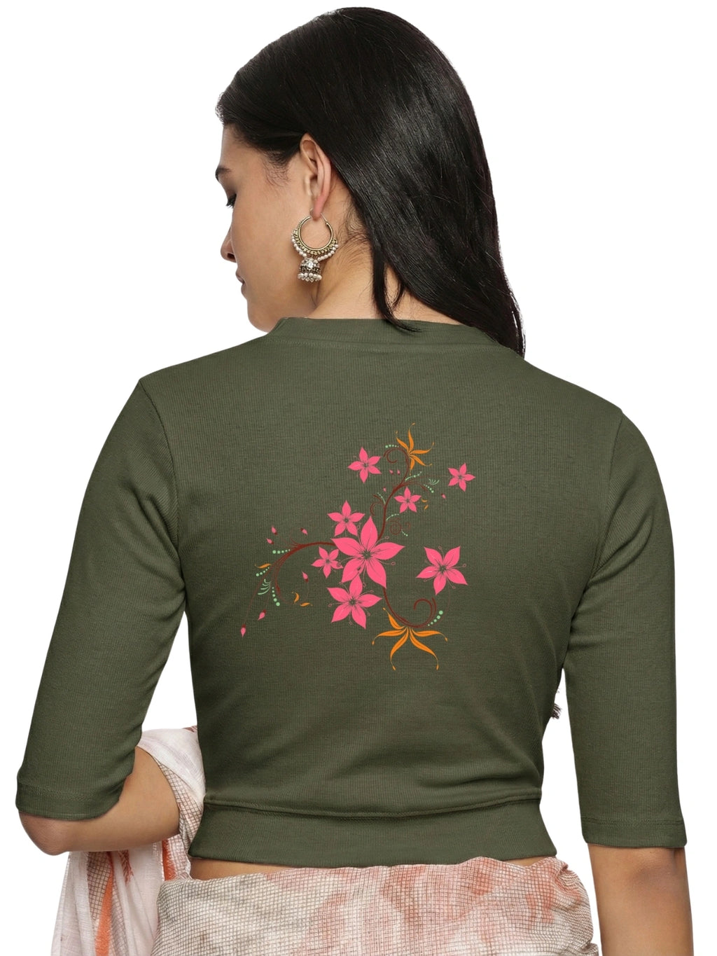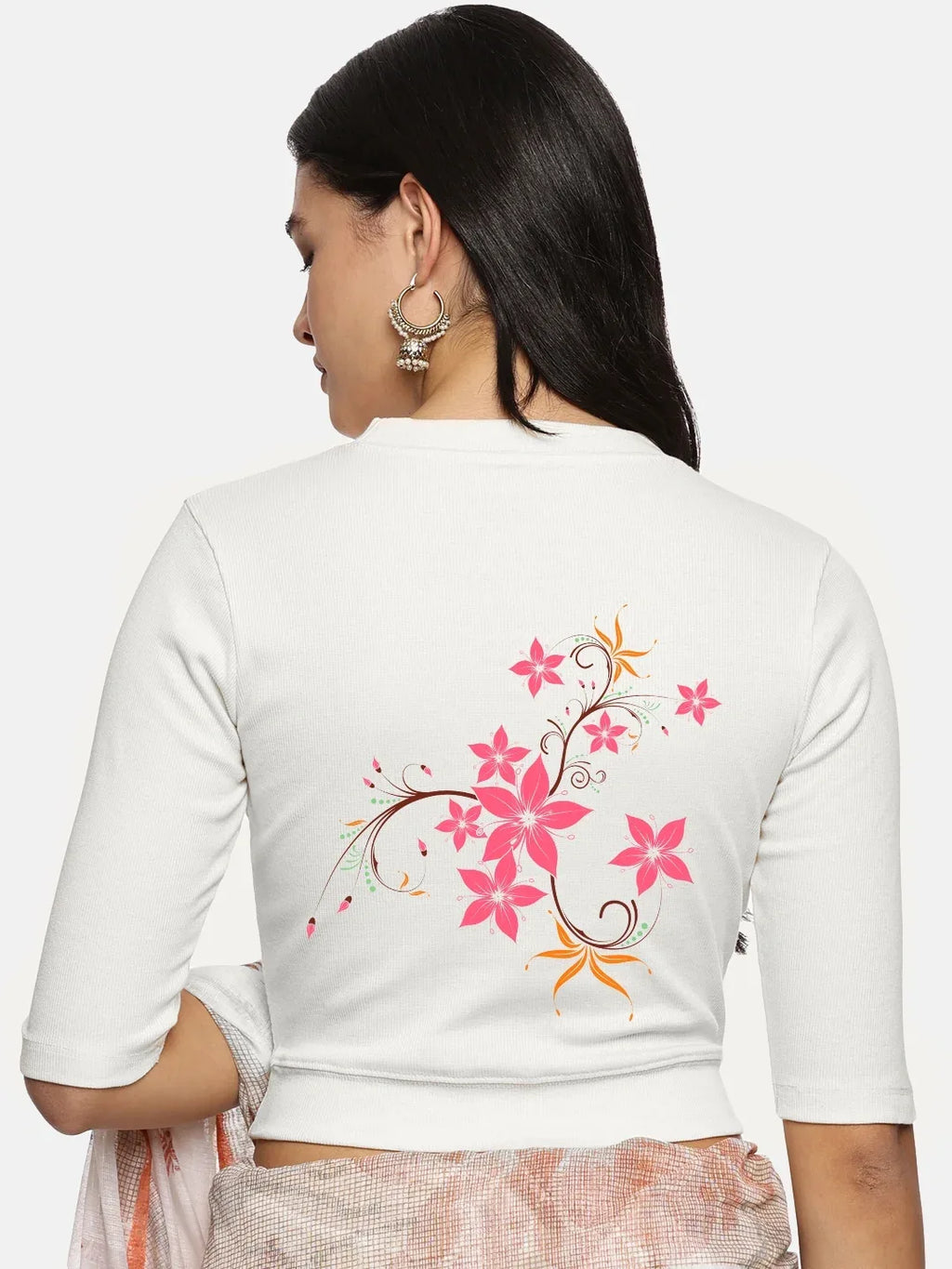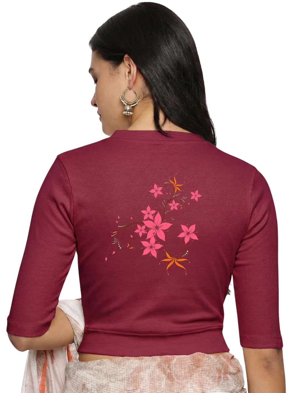 RIB blouse with back print in stretchable soft cotton, has a round neckline, sleeve length till the elbow. The blouse has a Rib double fold band at waist bottom to avoid spillage