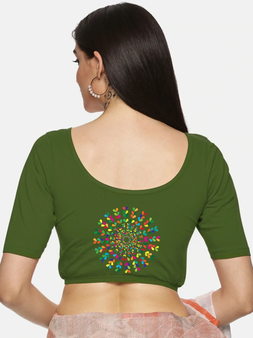 Solid blouse with back print in stretchable soft cotton, has a round neckline, has 2 front darts for best fitting, sleeve length till the elbow. The blouse has an elasticated bottom to avoid spillage