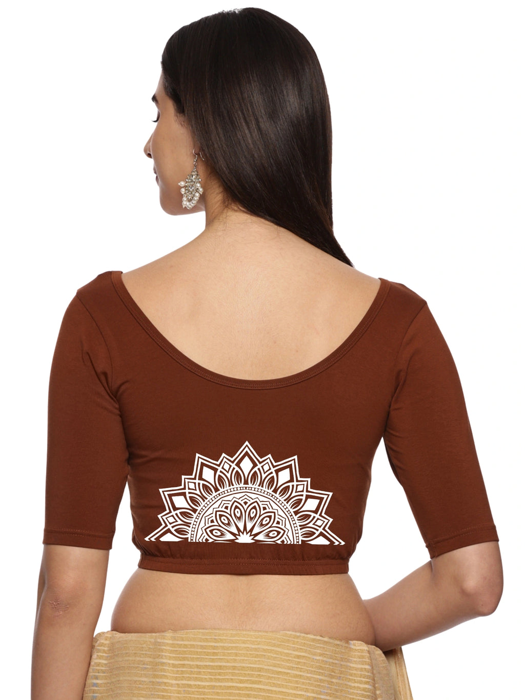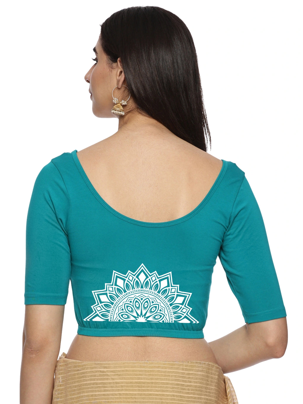Solid blouse with back print in stretchable soft cotton, has a round neckline, has 2 front darts for best fitting, sleeve length till the elbow. The blouse has an elasticated bottom to avoid spillage