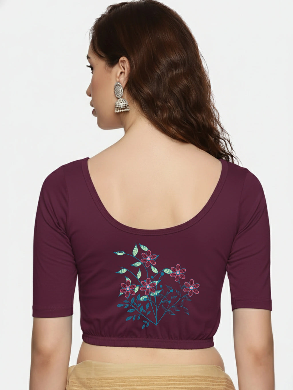 Solid blouse with back print in stretchable soft cotton, has a round neckline, has 2 front darts for best fitting, sleeve length till the elbow. The blouse has an elasticated bottom to avoid spillage