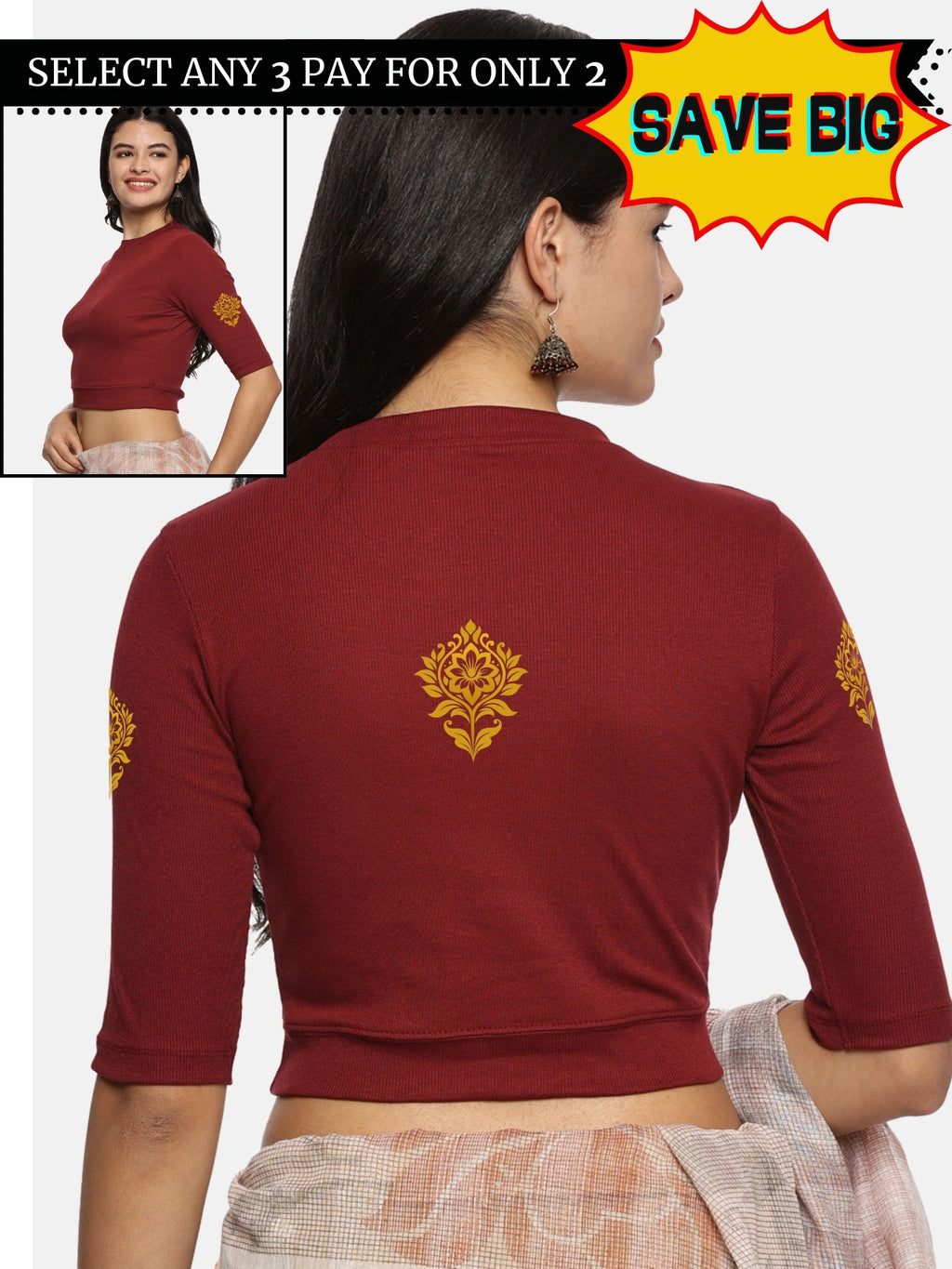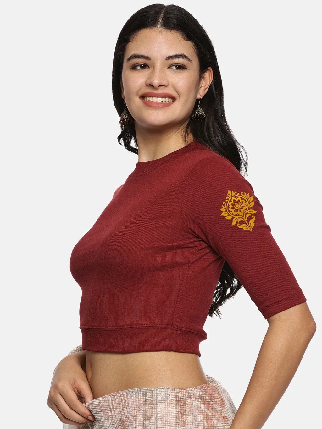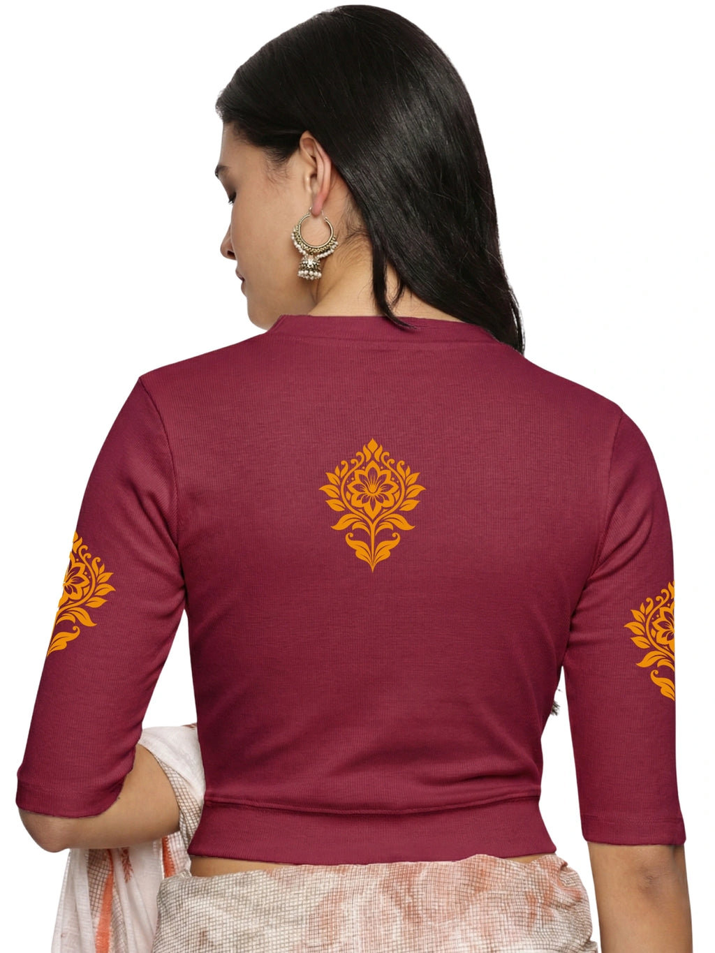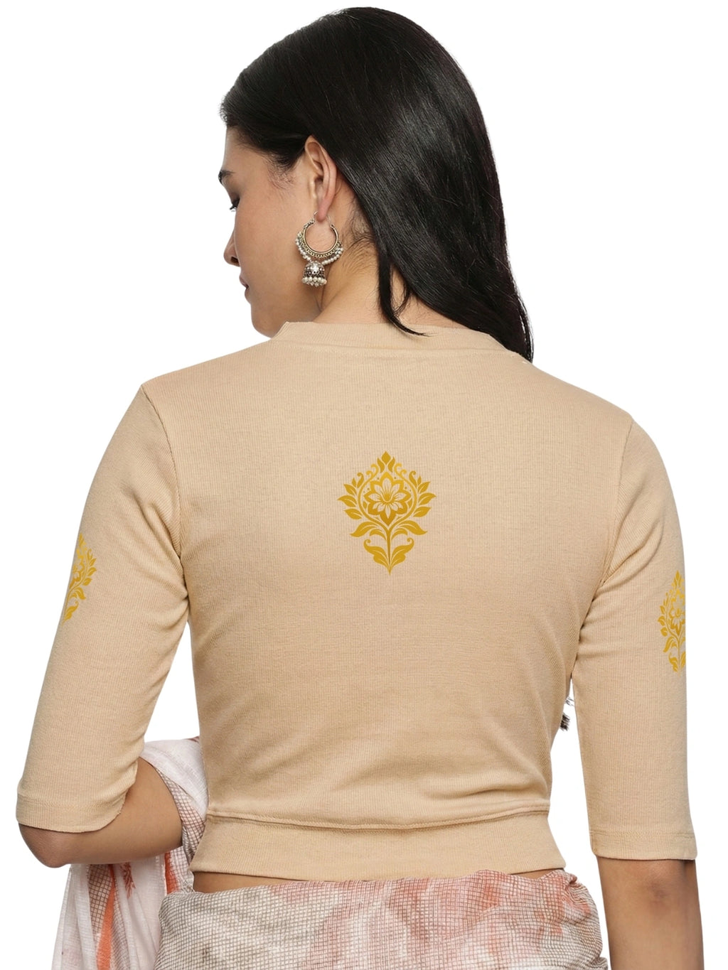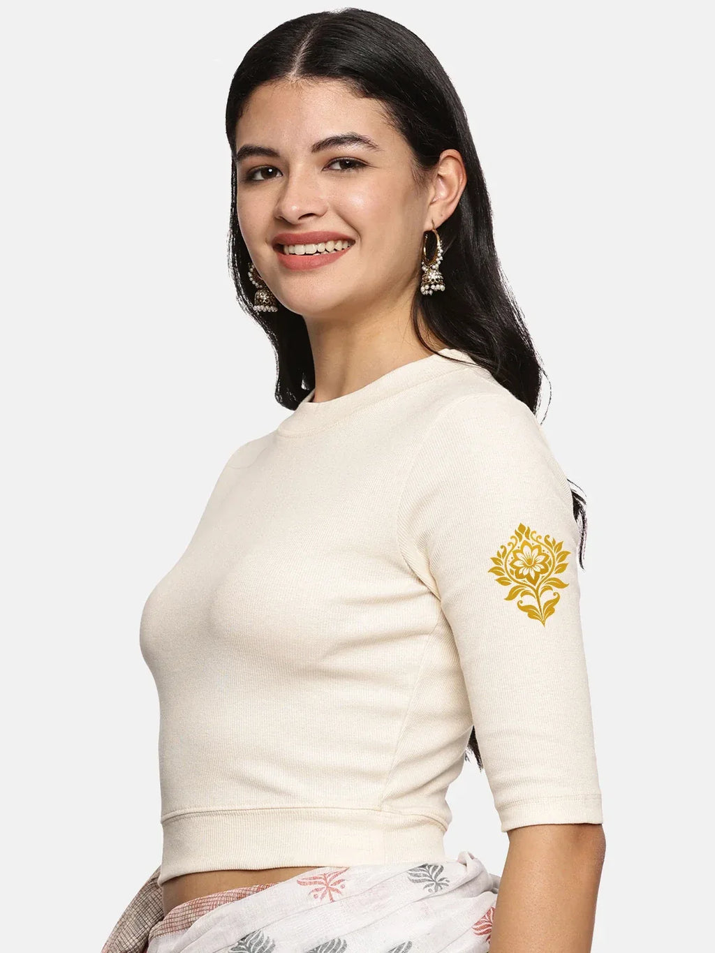 RIB blouse with back print in  stretchable soft cotton, has a round neckline, sleeve length till the elbow. The blouse has a Rib double fold band at waist bottom to avoid spillage