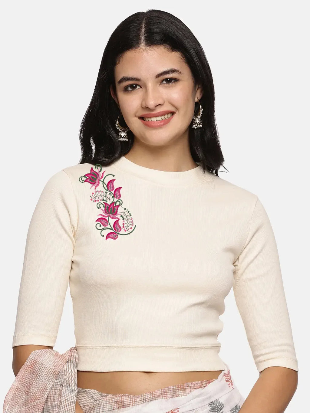 RIB blouse with back print in stretchable soft cotton, has a round neckline, sleeve length till the elbow. The blouse has a Rib double fold band at waist bottom to avoid spillage