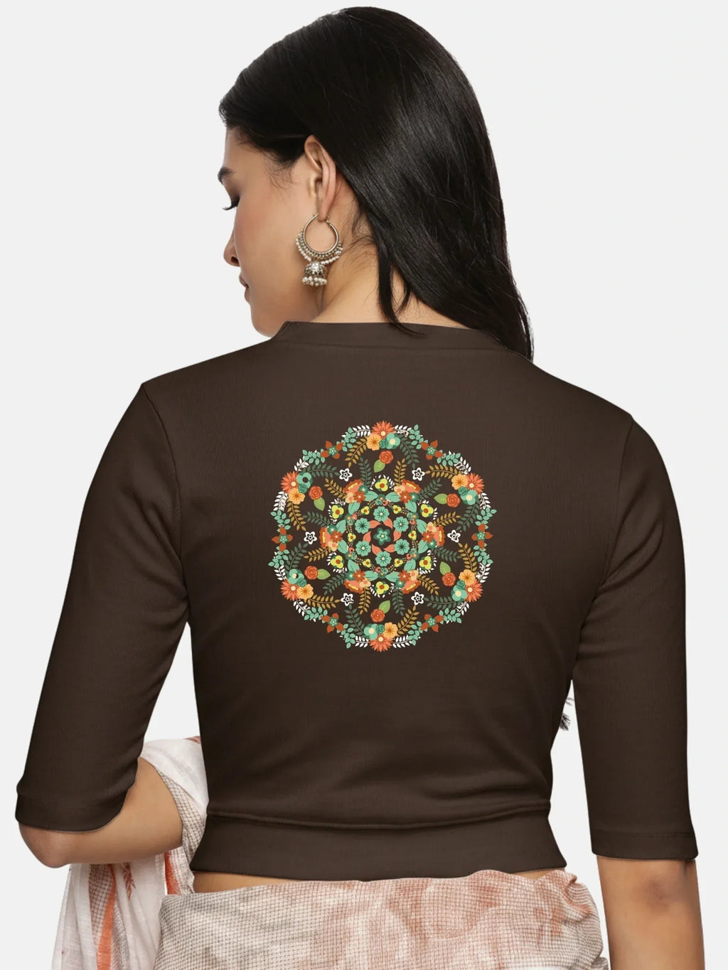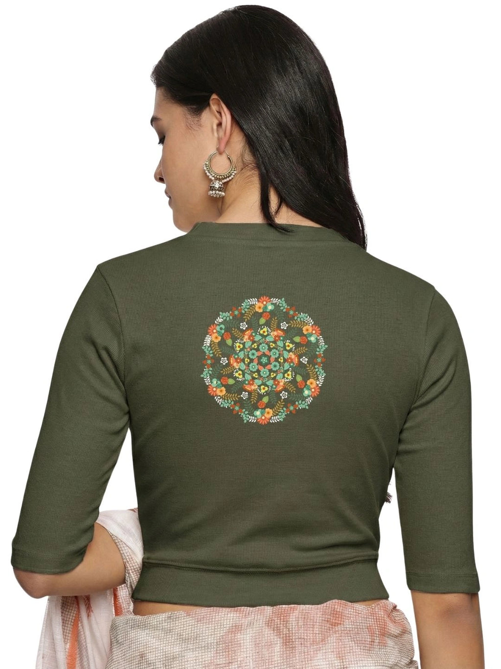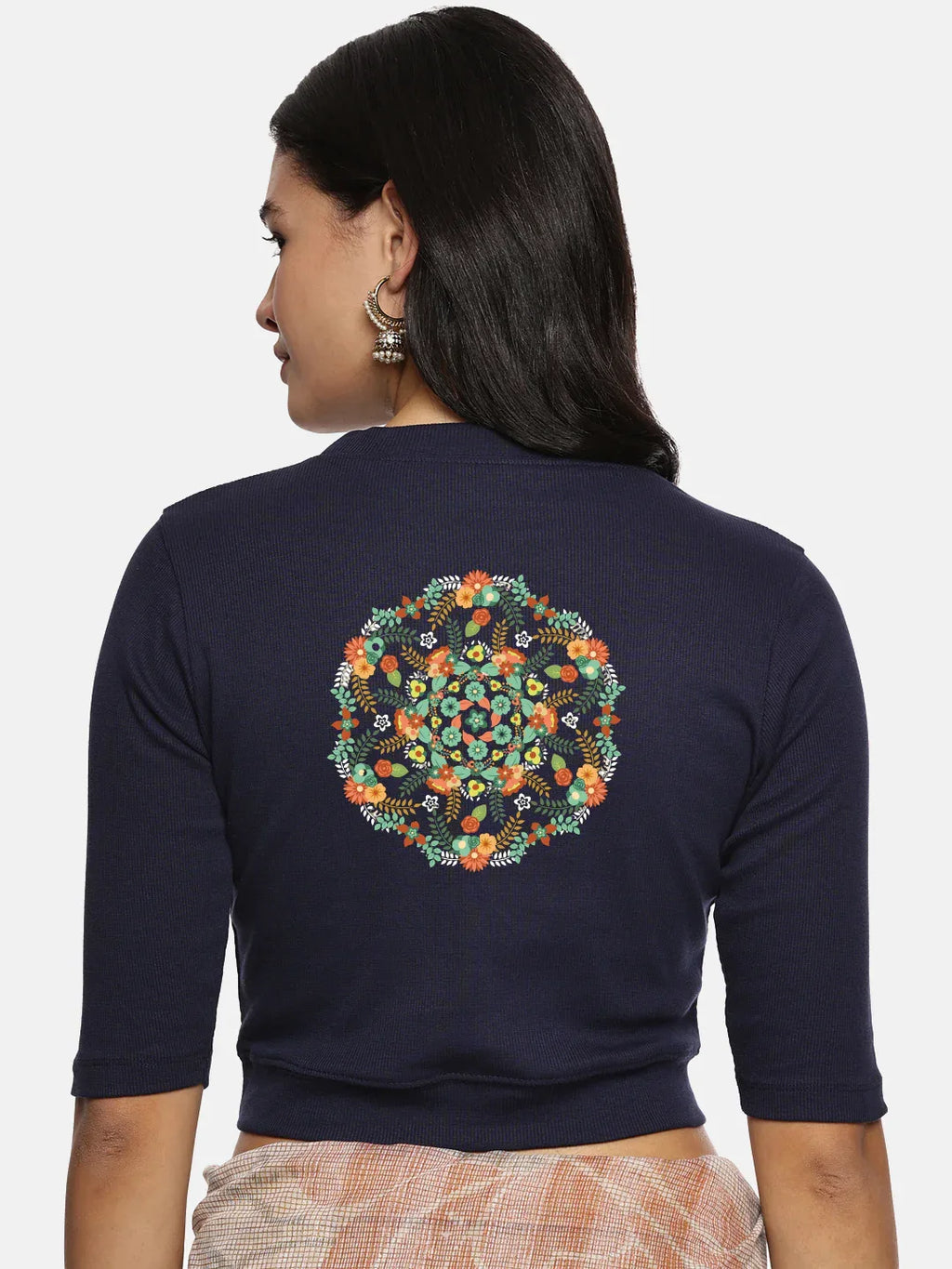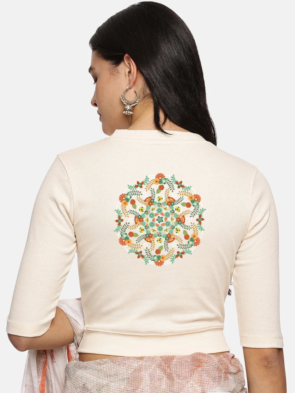 RIB blouse with back print in stretchable soft cotton, has a round neckline, sleeve length till the elbow. The blouse has a Rib double fold band at waist bottom to avoid spillage