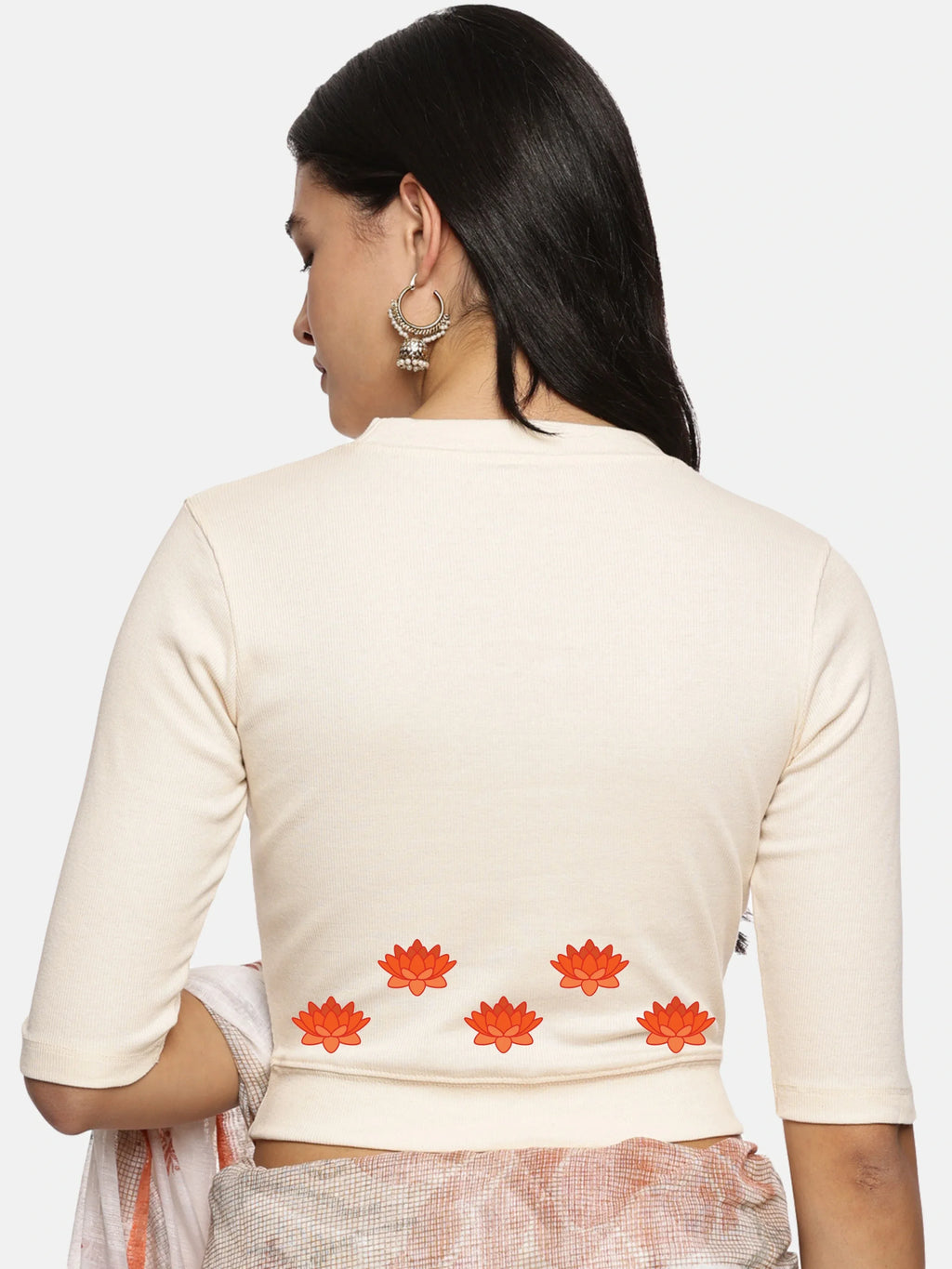RIB blouse with back print in stretchable soft cotton, has a round neckline, sleeve length till the elbow. The blouse has a Rib double fold band at waist bottom to avoid spillage