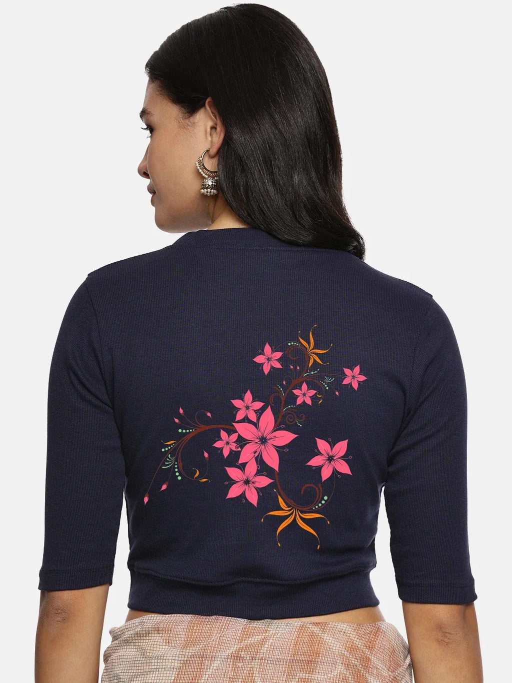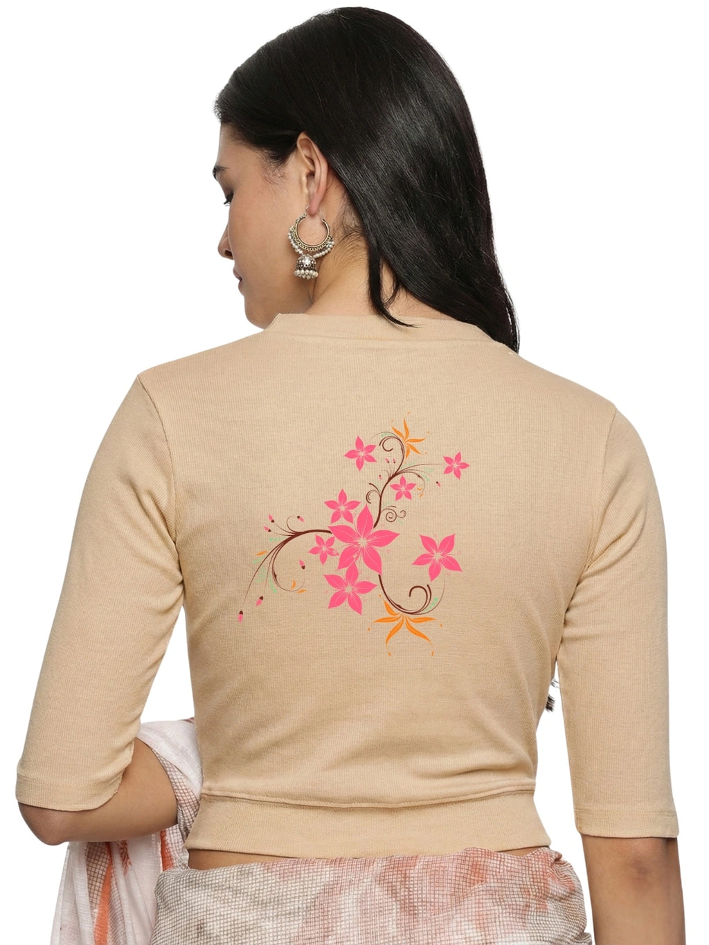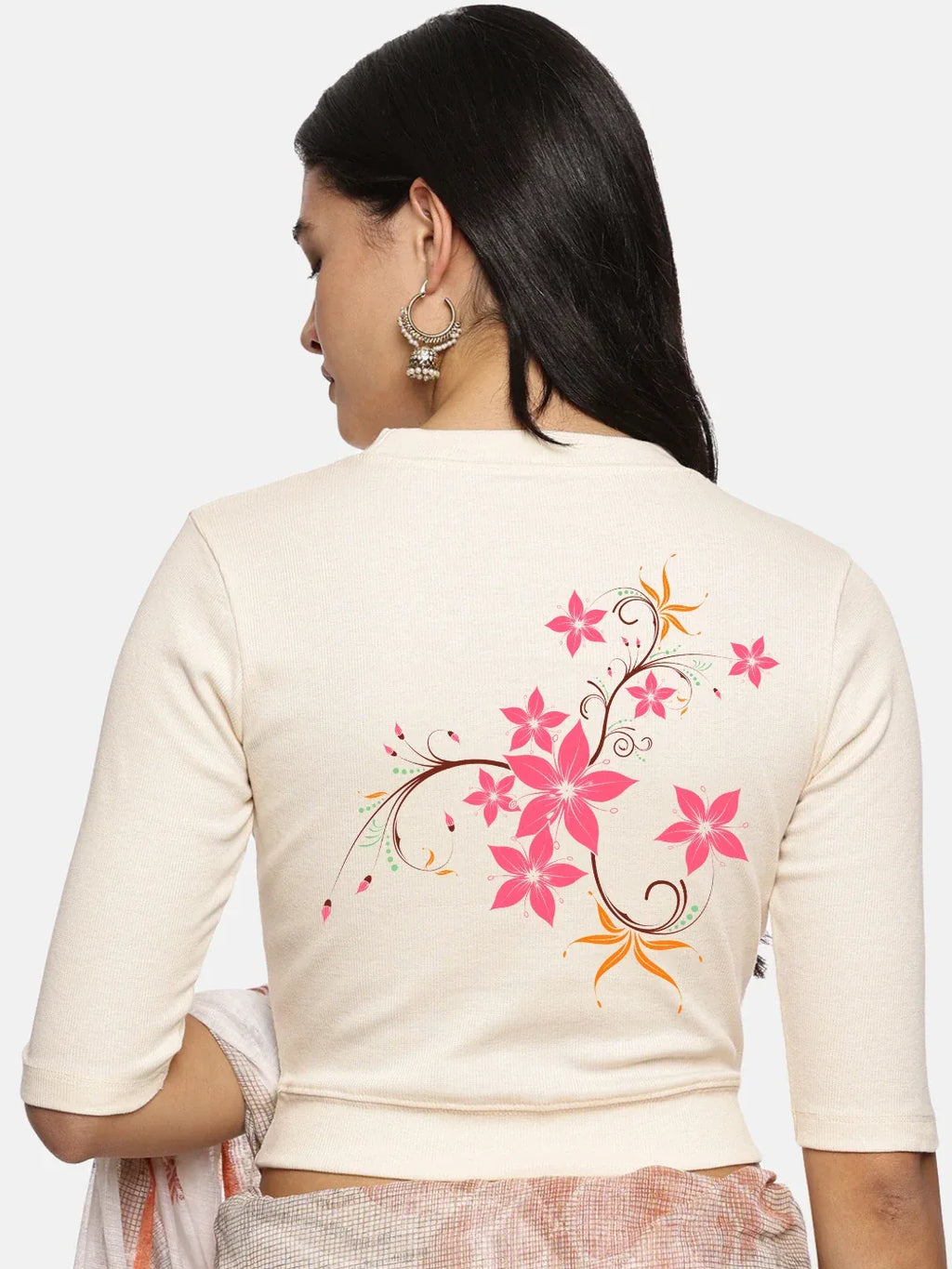 RIB blouse with back print in stretchable soft cotton, has a round neckline, sleeve length till the elbow. The blouse has a Rib double fold band at waist bottom to avoid spillage