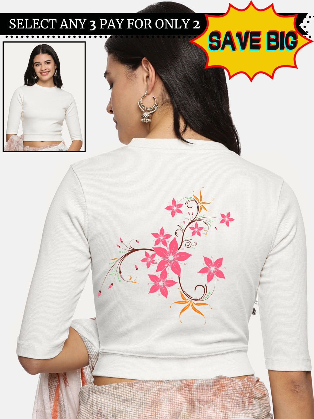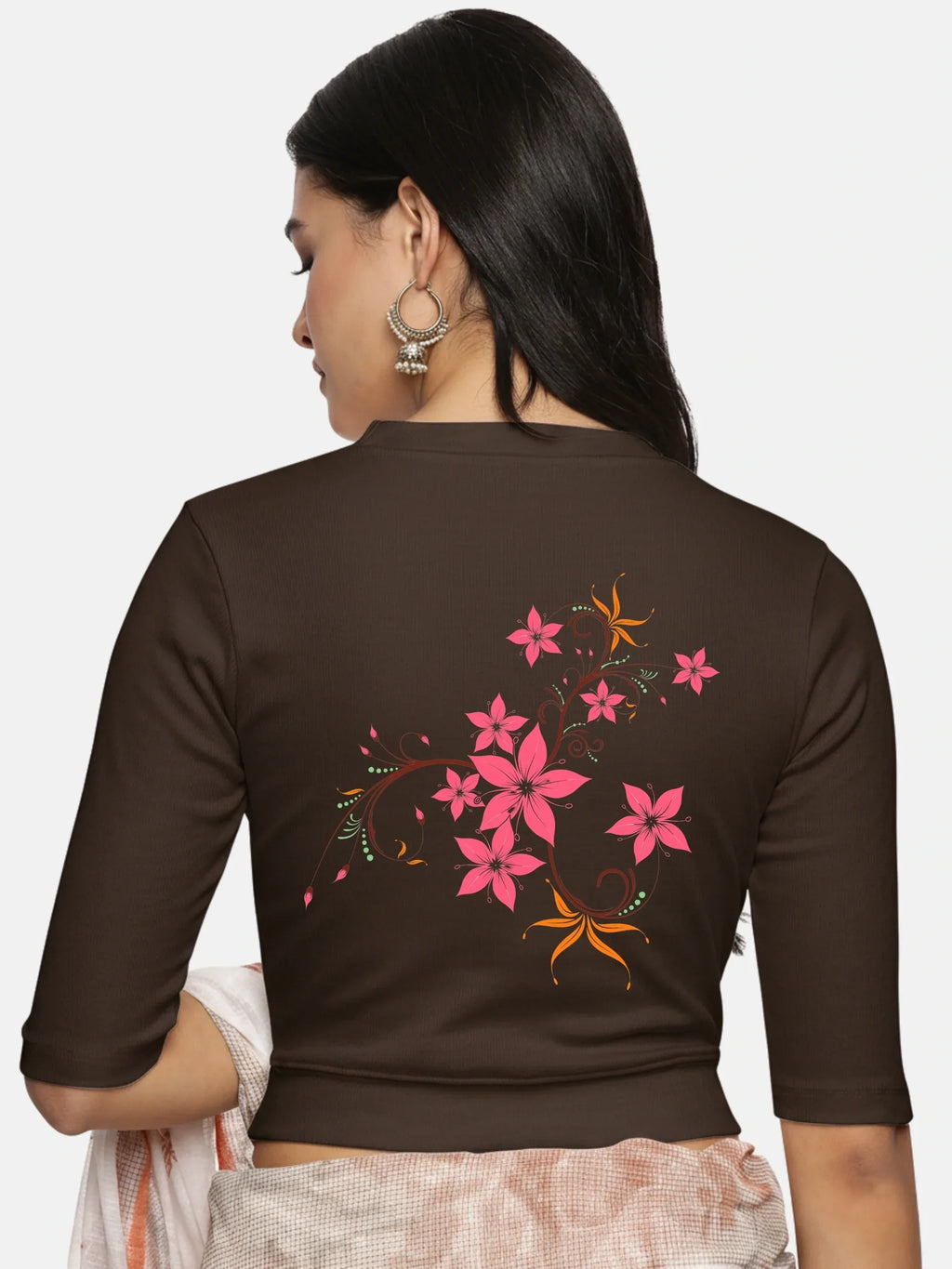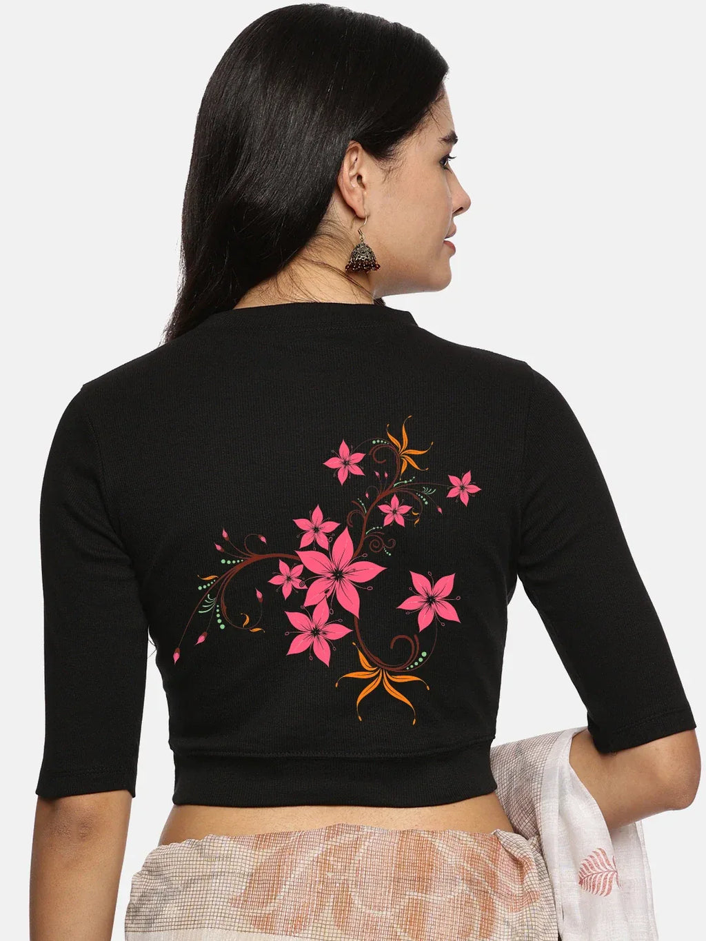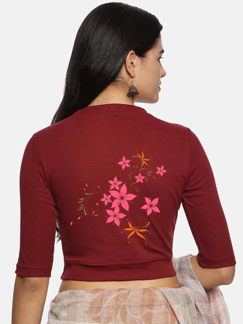 RIB blouse with back print in stretchable soft cotton, has a round neckline, sleeve length till the elbow. The blouse has a Rib double fold band at waist bottom to avoid spillage