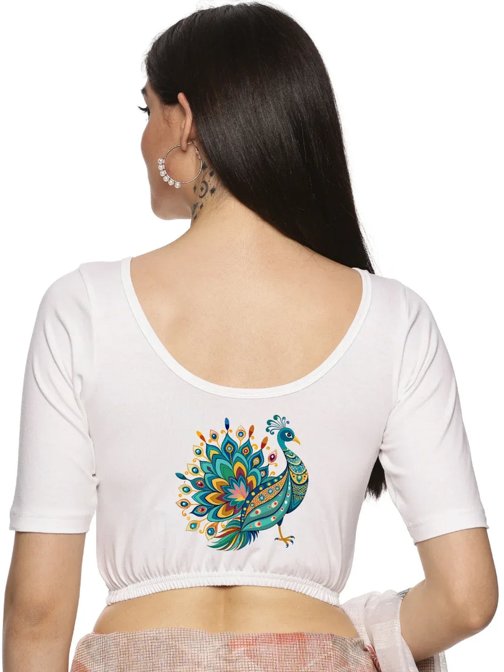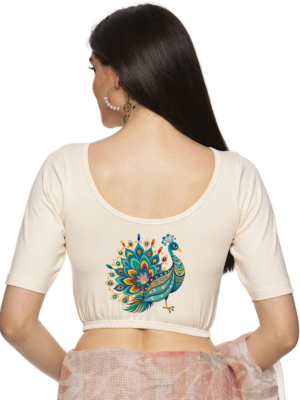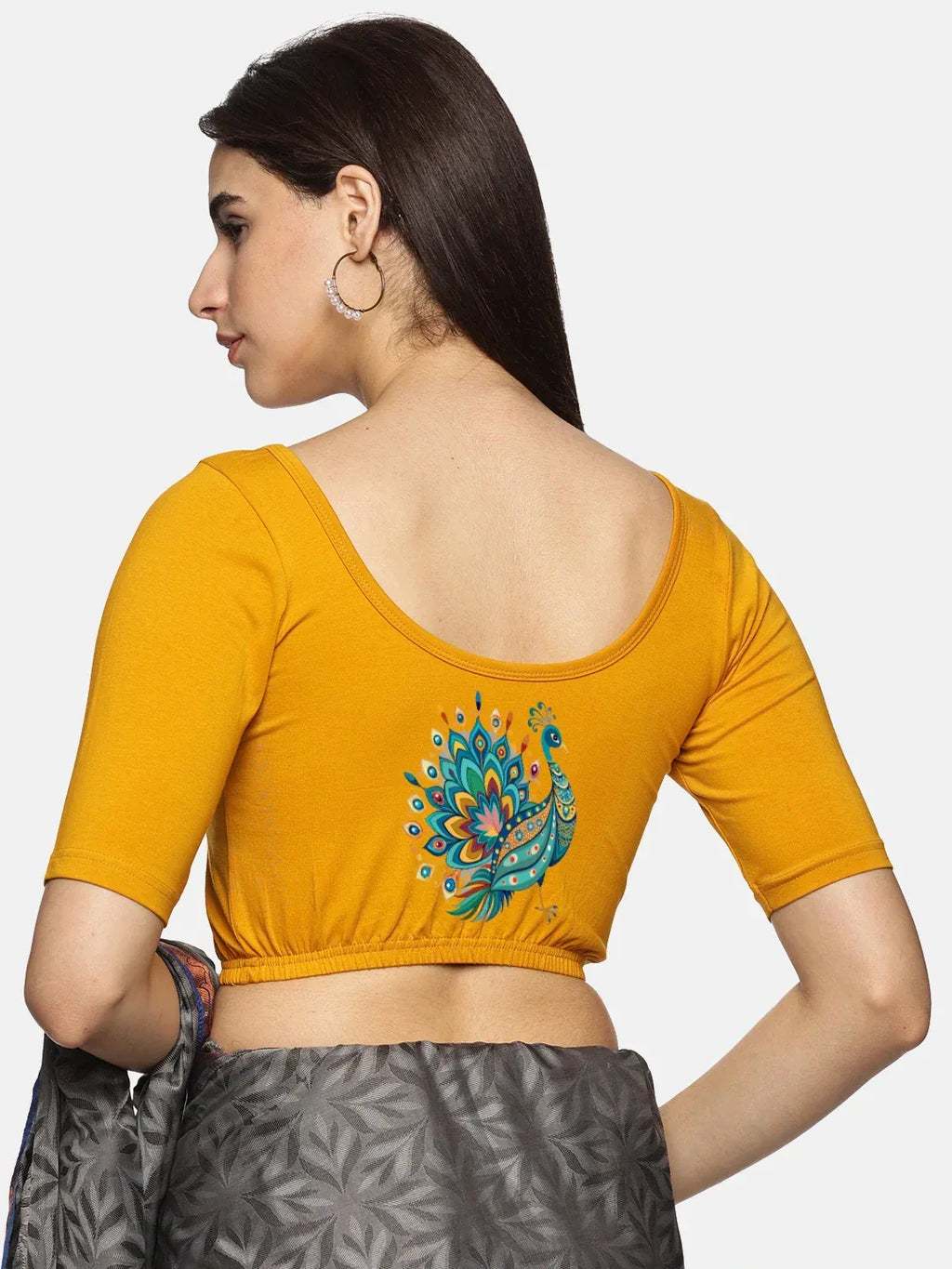 Solid blouse with back print in stretchable soft cotton, has a round neckline, has 2 front darts for best fitting, sleeve length till the elbow. The blouse has an elasticated bottom to avoid spillage