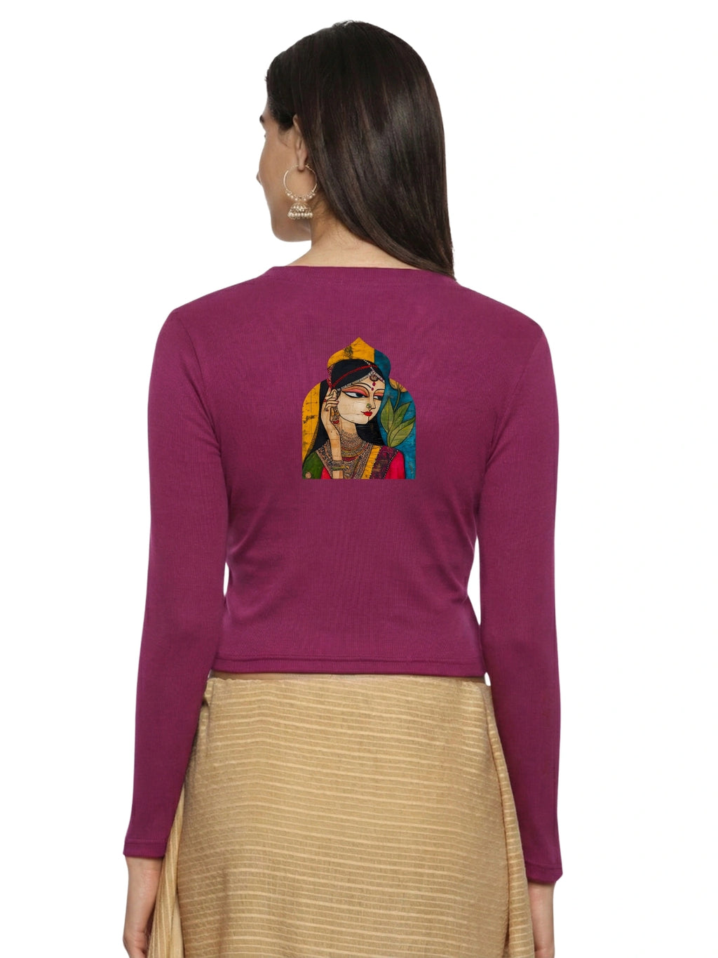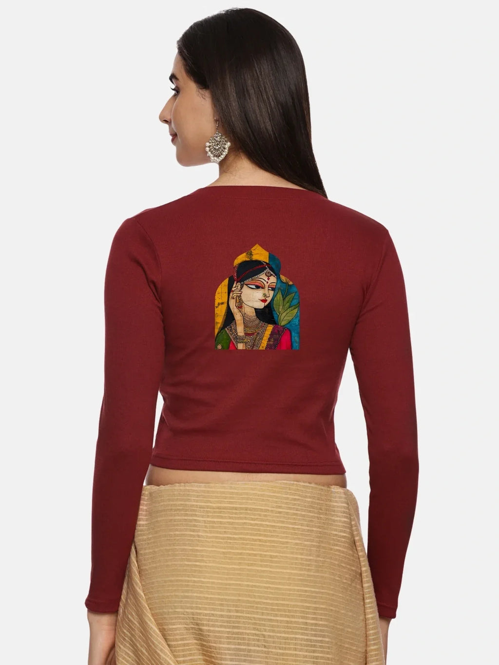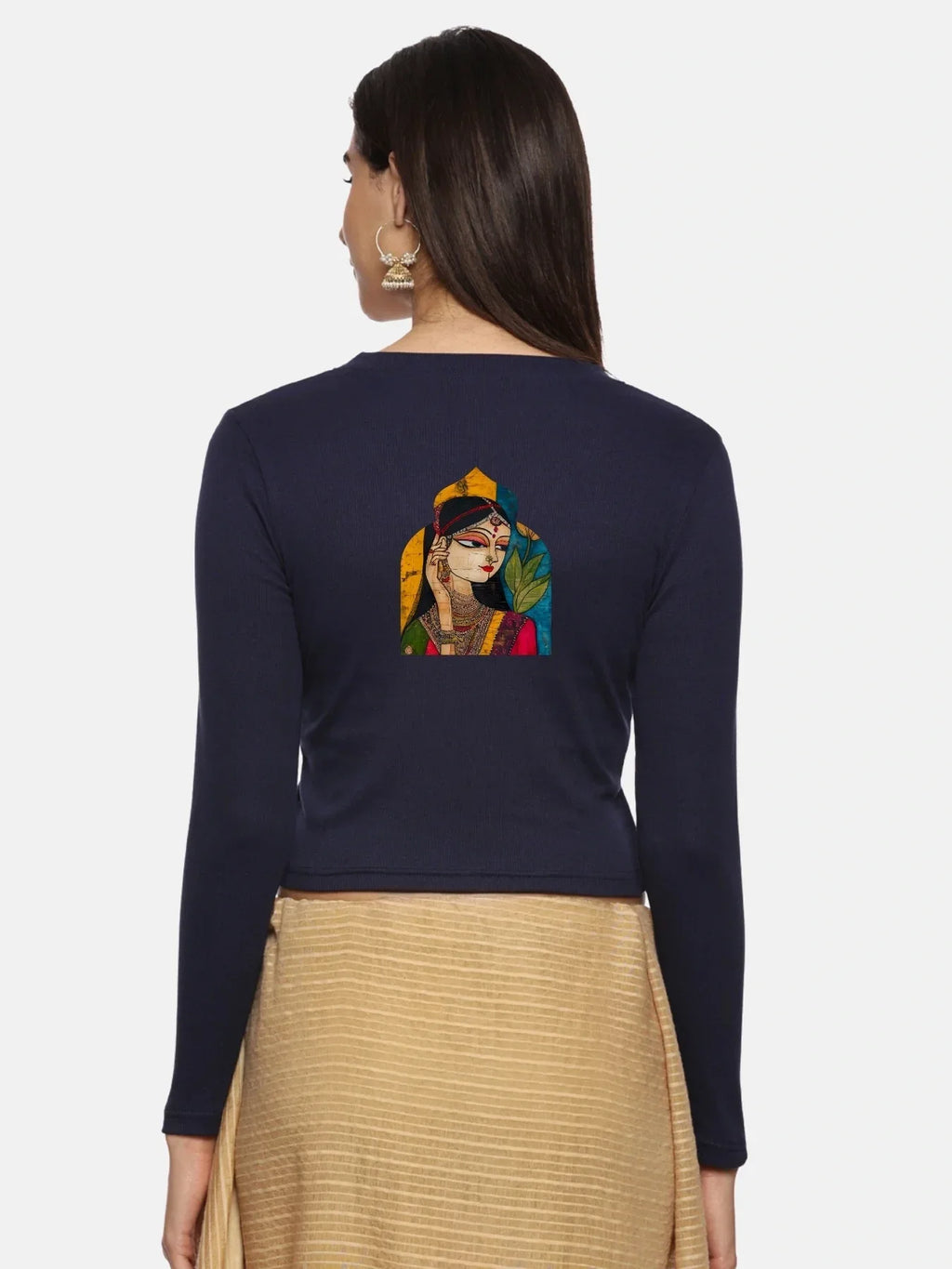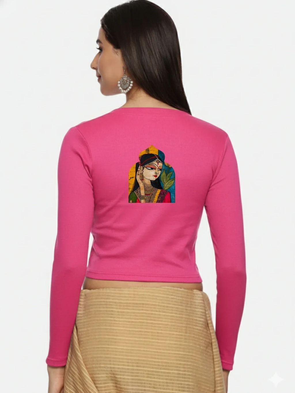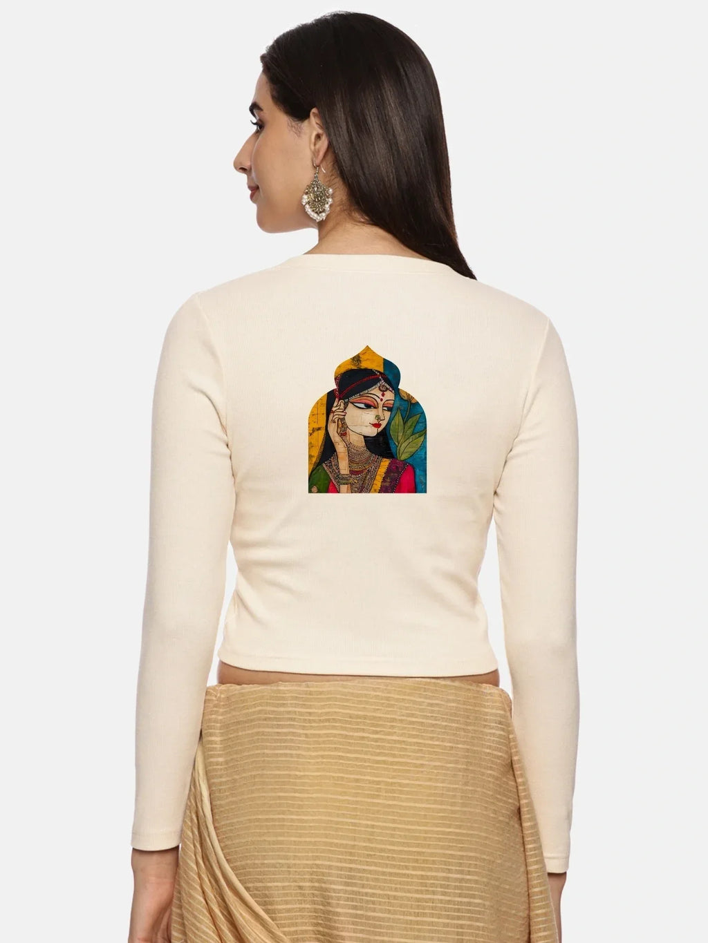 RIB blouse with back print in stretchable soft cotton, has a round neckline, sleeve length till the elbow. The blouse has a Rib double fold band at waist bottom to avoid spillage