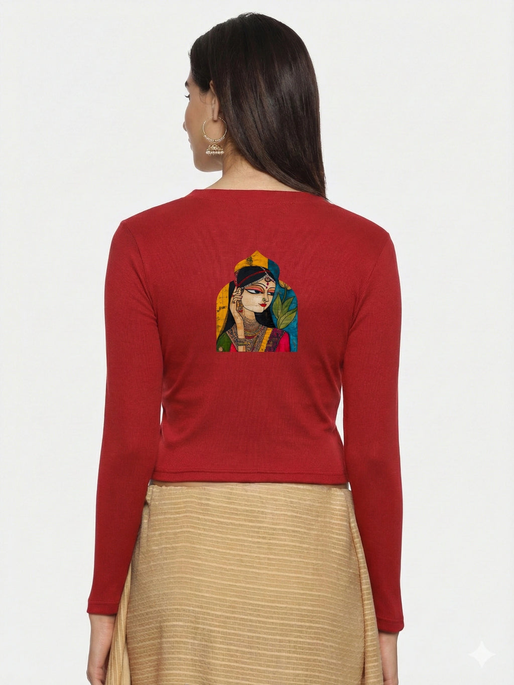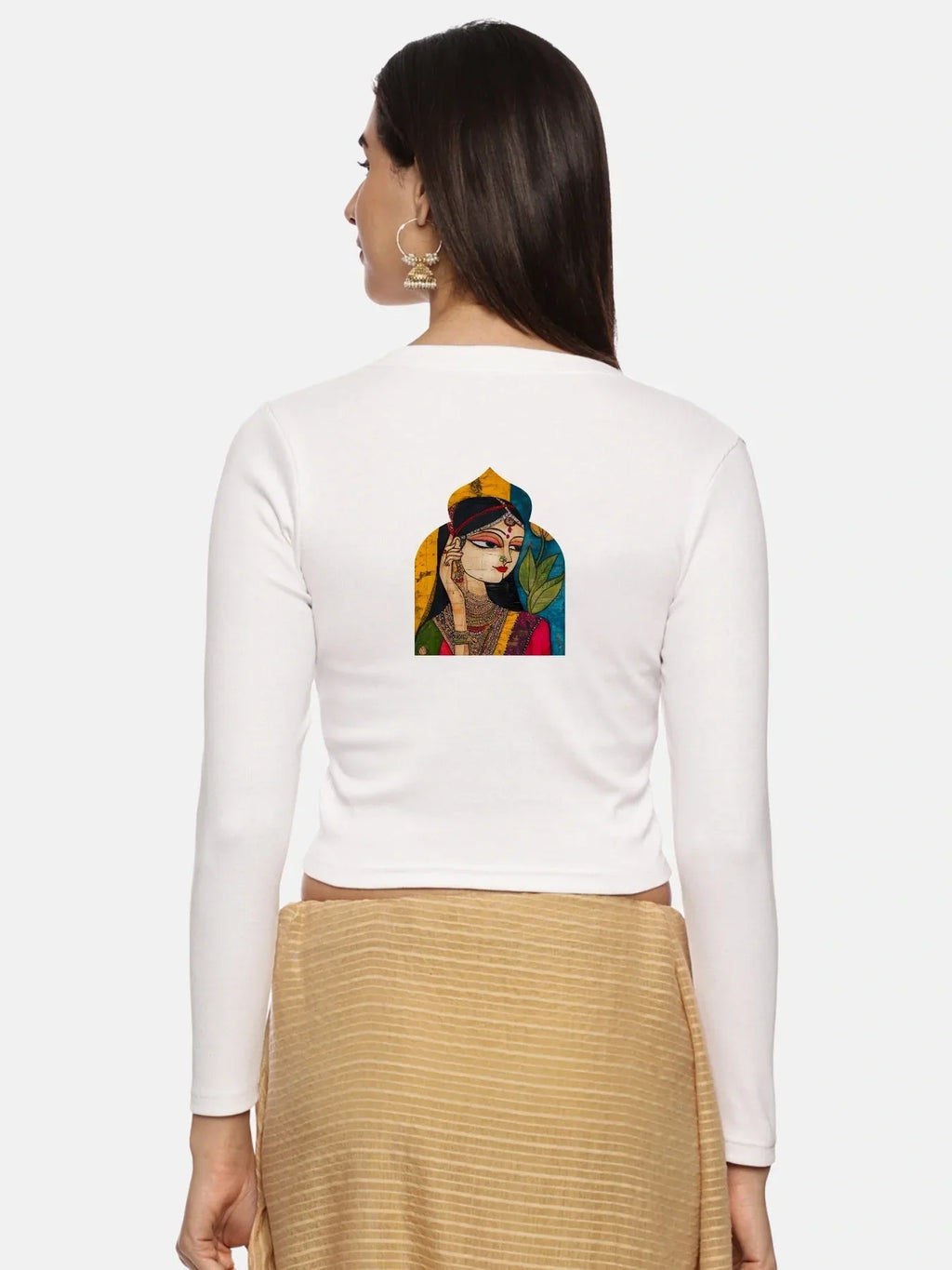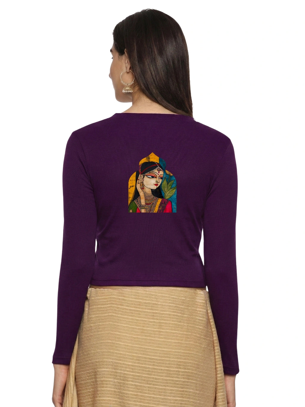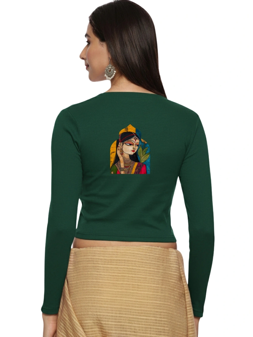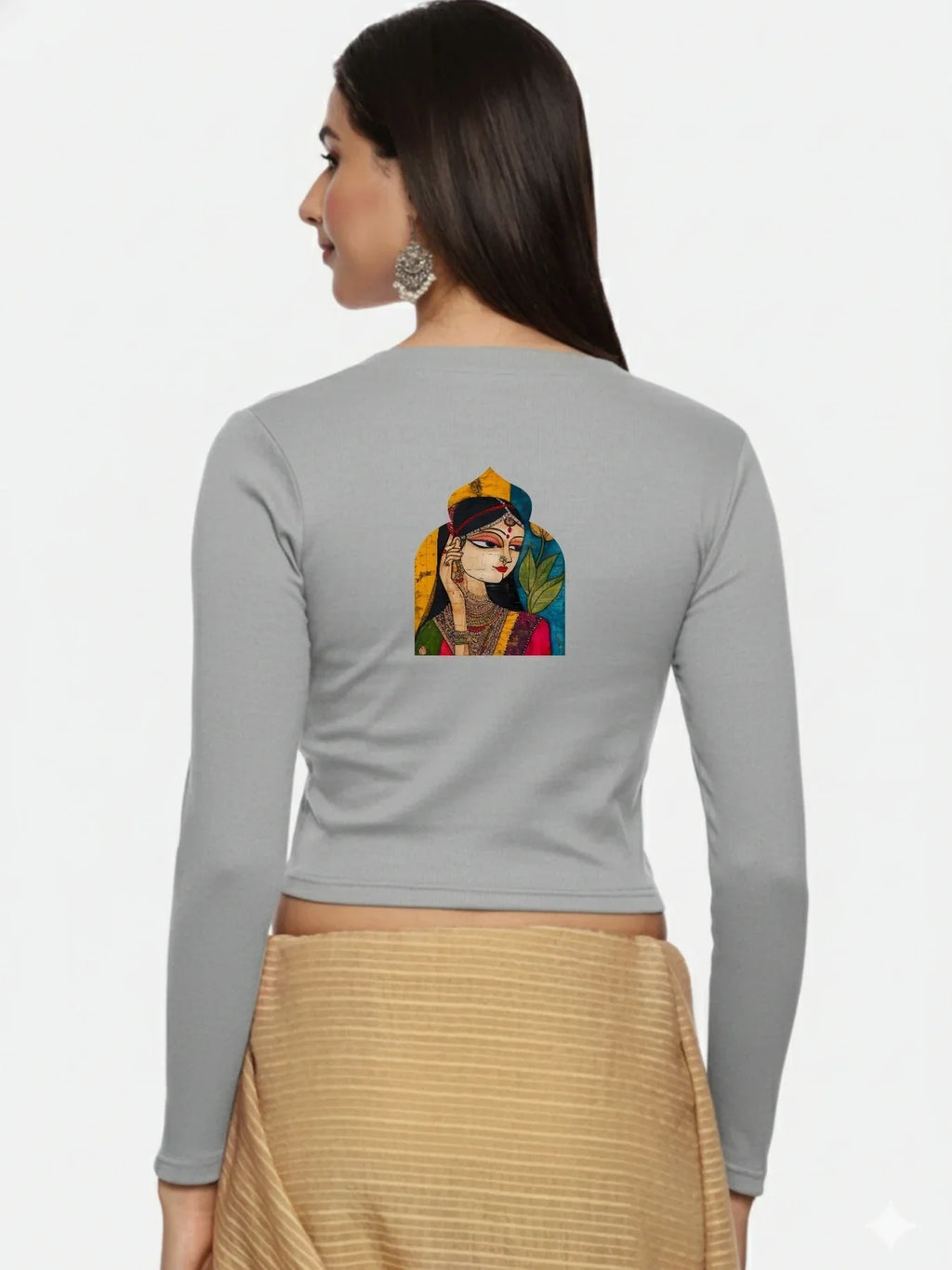 RIB blouse with back print in stretchable soft cotton, has a round neckline, sleeve length till the elbow. The blouse has a Rib double fold band at waist bottom to avoid spillage
