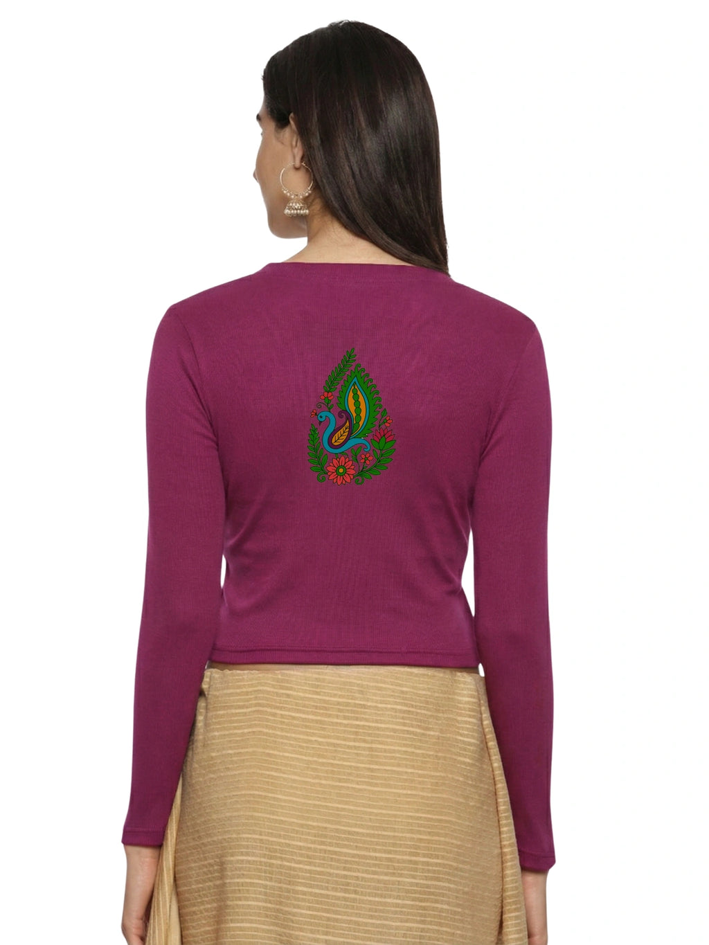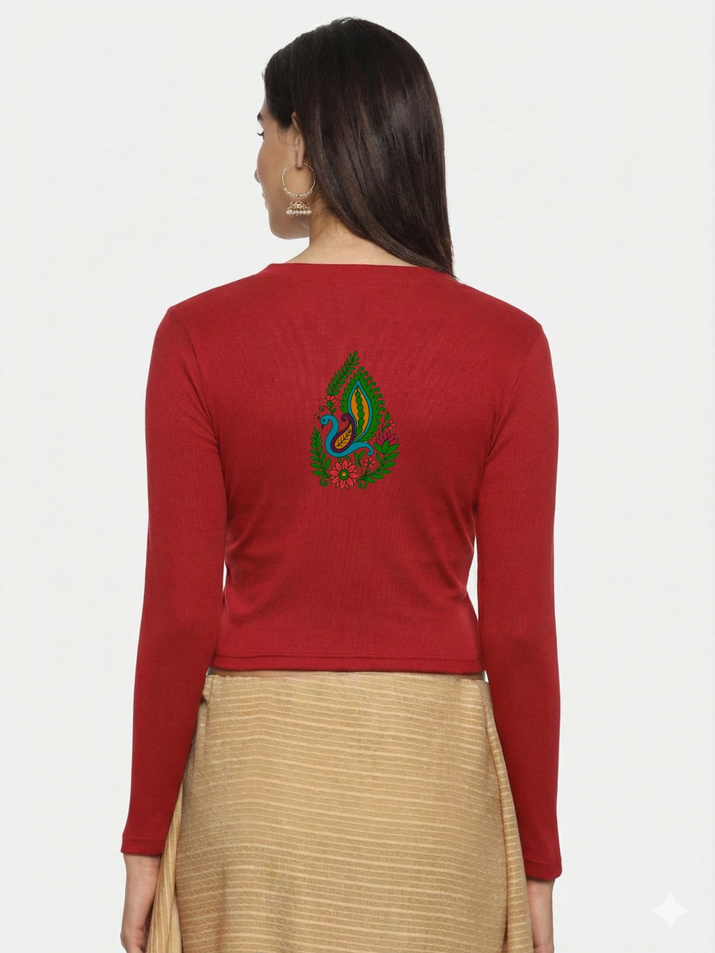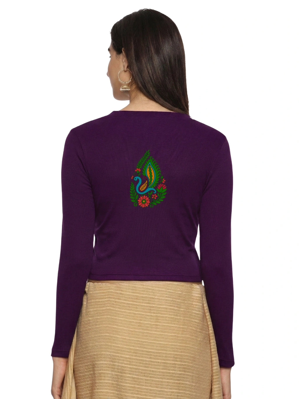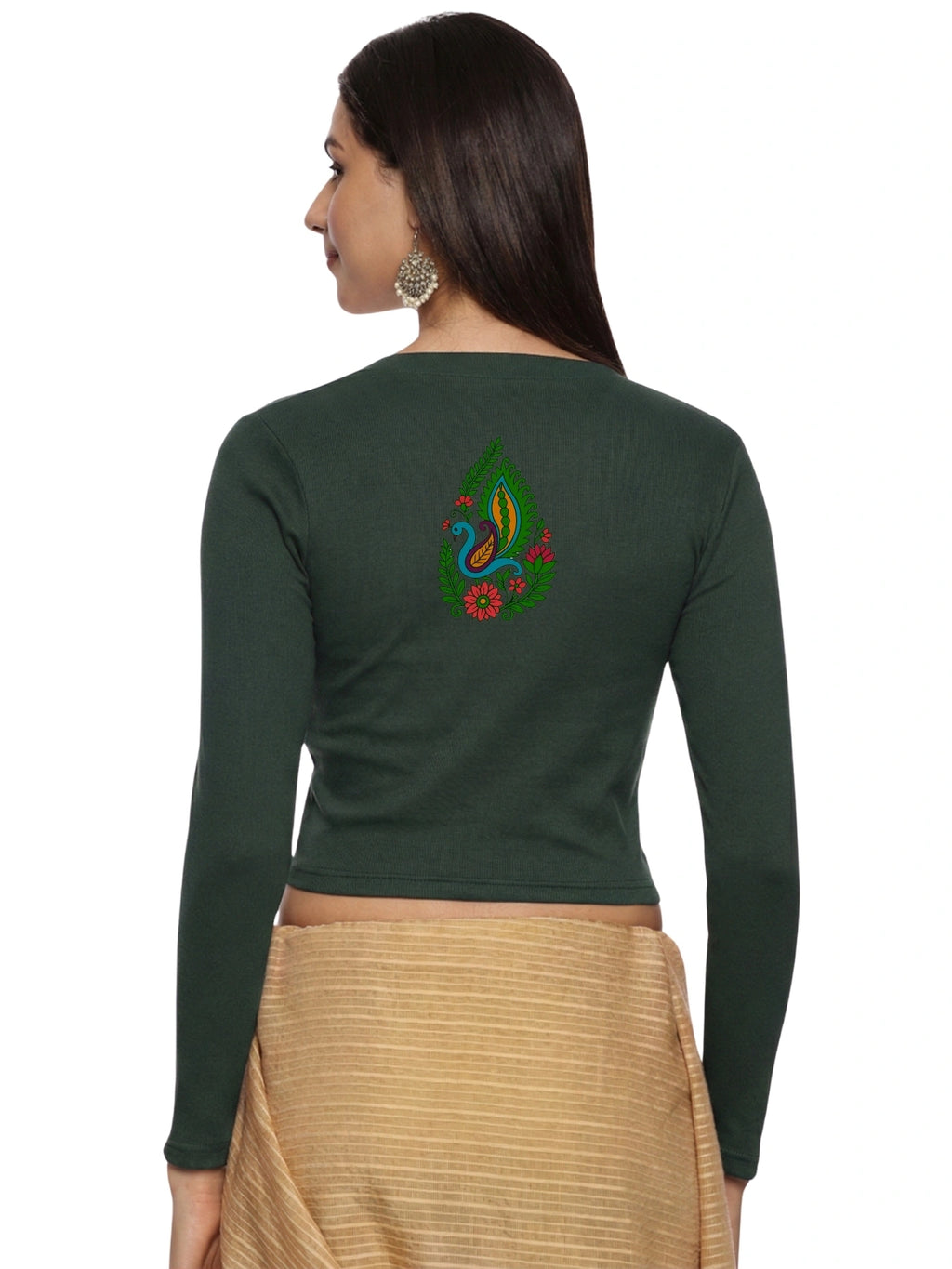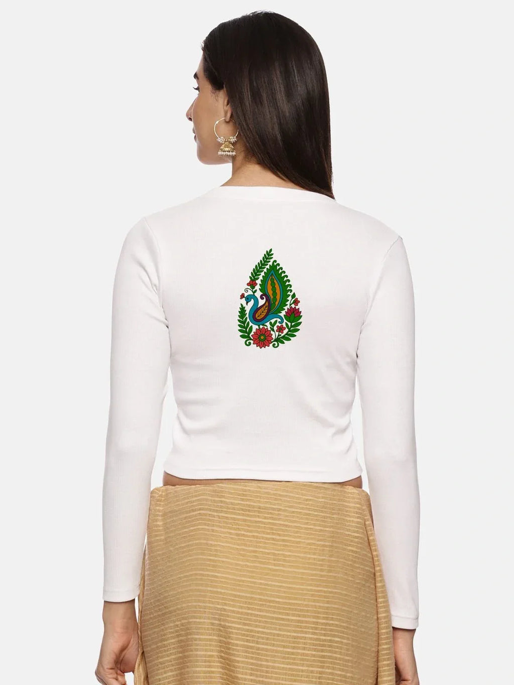 RIB blouse with back print in  stretchable soft cotton, has a round neckline, sleeve length till the elbow. The blouse has a Rib double fold band at waist bottom to avoid spillage
