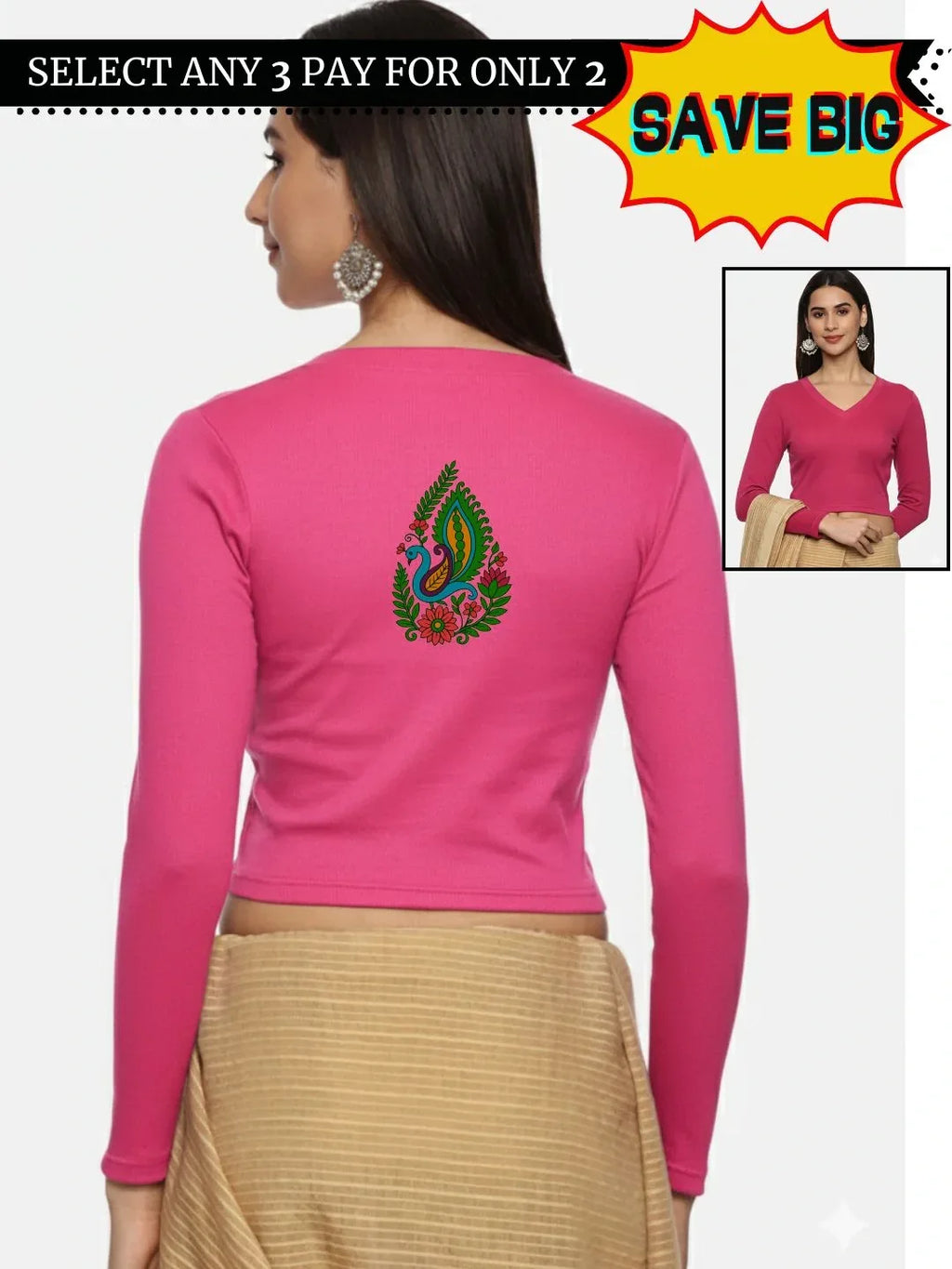 Women Back Printed Stretchable Full Sleeve V Neck RIB Blouse U0187
